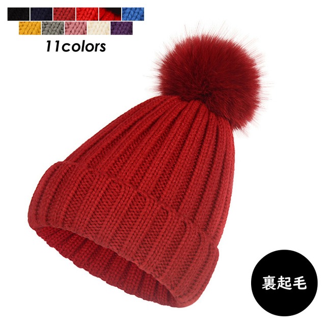 ボンボン付き ニット帽 裏起毛 フェイクファー エコファー ニットキャップ 帽子 リブニット 毛糸 ポンポン 防寒 秋冬 レディース 黒 白 紺 赤 青 黄 紫 B-0502 【お取寄せ】