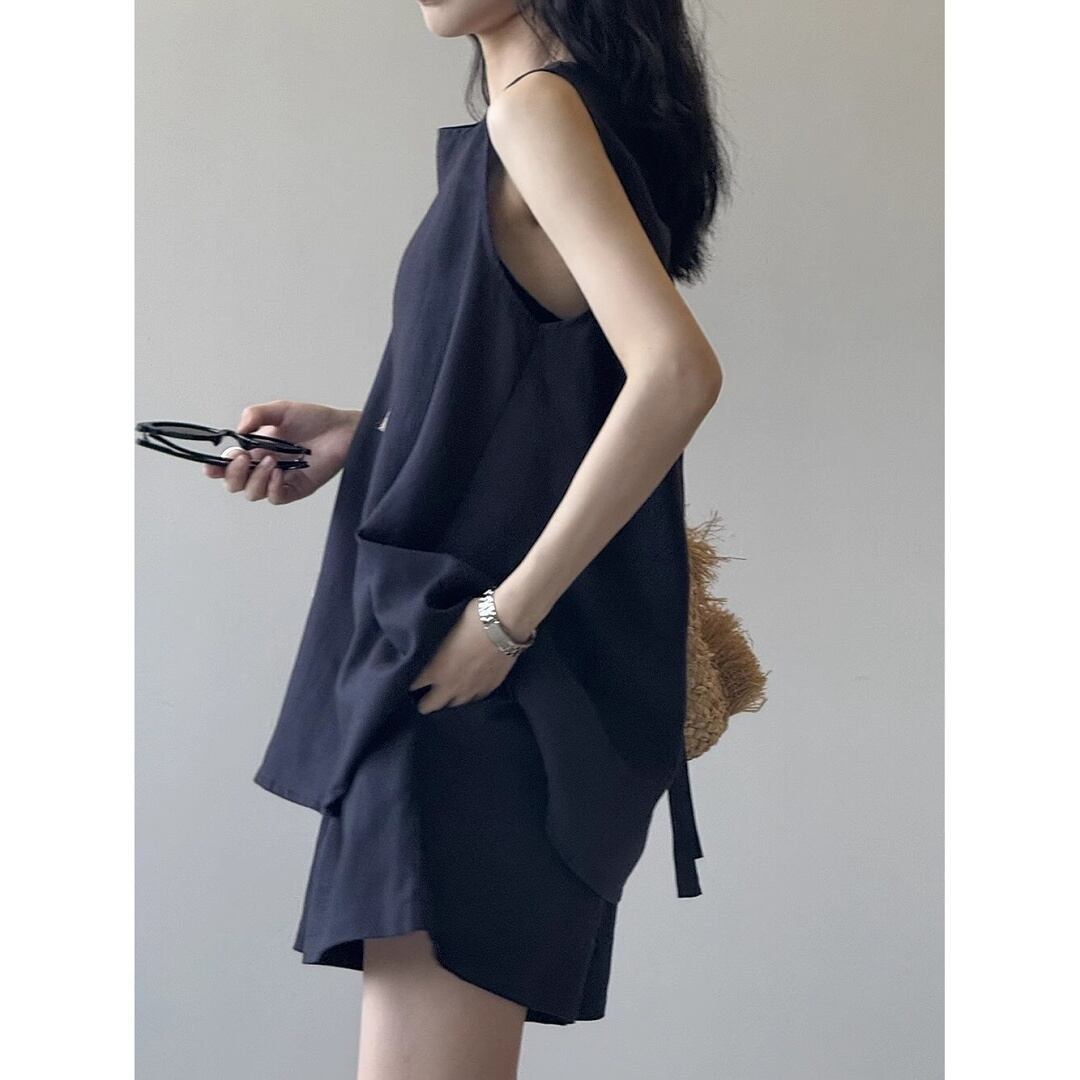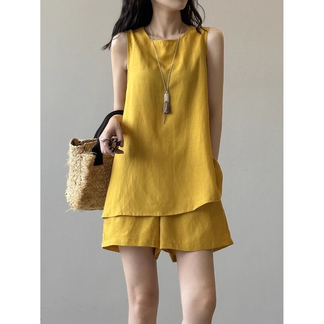 《2点セット》 セットアップ ノースリーブ トップス ショートパンツ ウエストゴム バックリボン 背中あき バックオープン バックレス ブラウス Aライン ラウンドネック ツーピース 上下セット カジュアル 上品 レディース 黄 紺 B-1307 【お取寄せ】