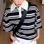 モノトーンのボーダー柄が印象的な半袖ポロシャツ。