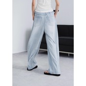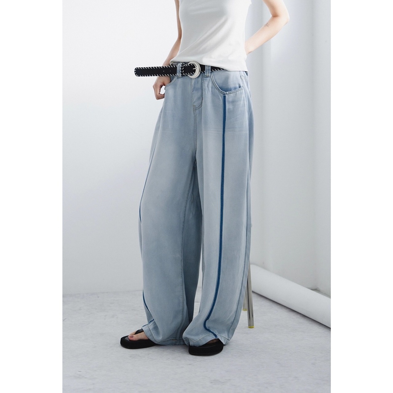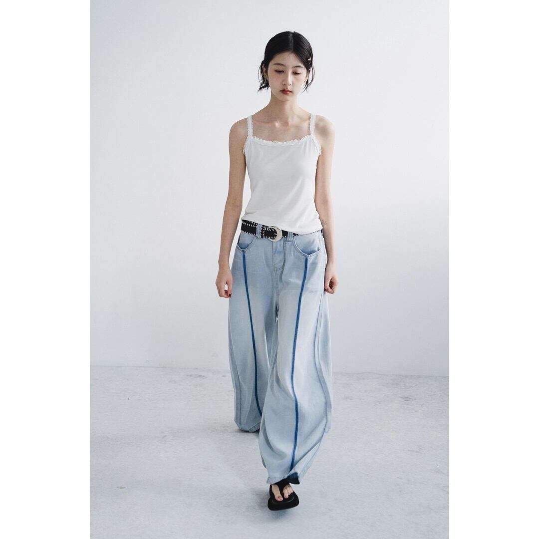 軽やかな穿き心地を叶えるライトブルーのワイドデニムパンツ。