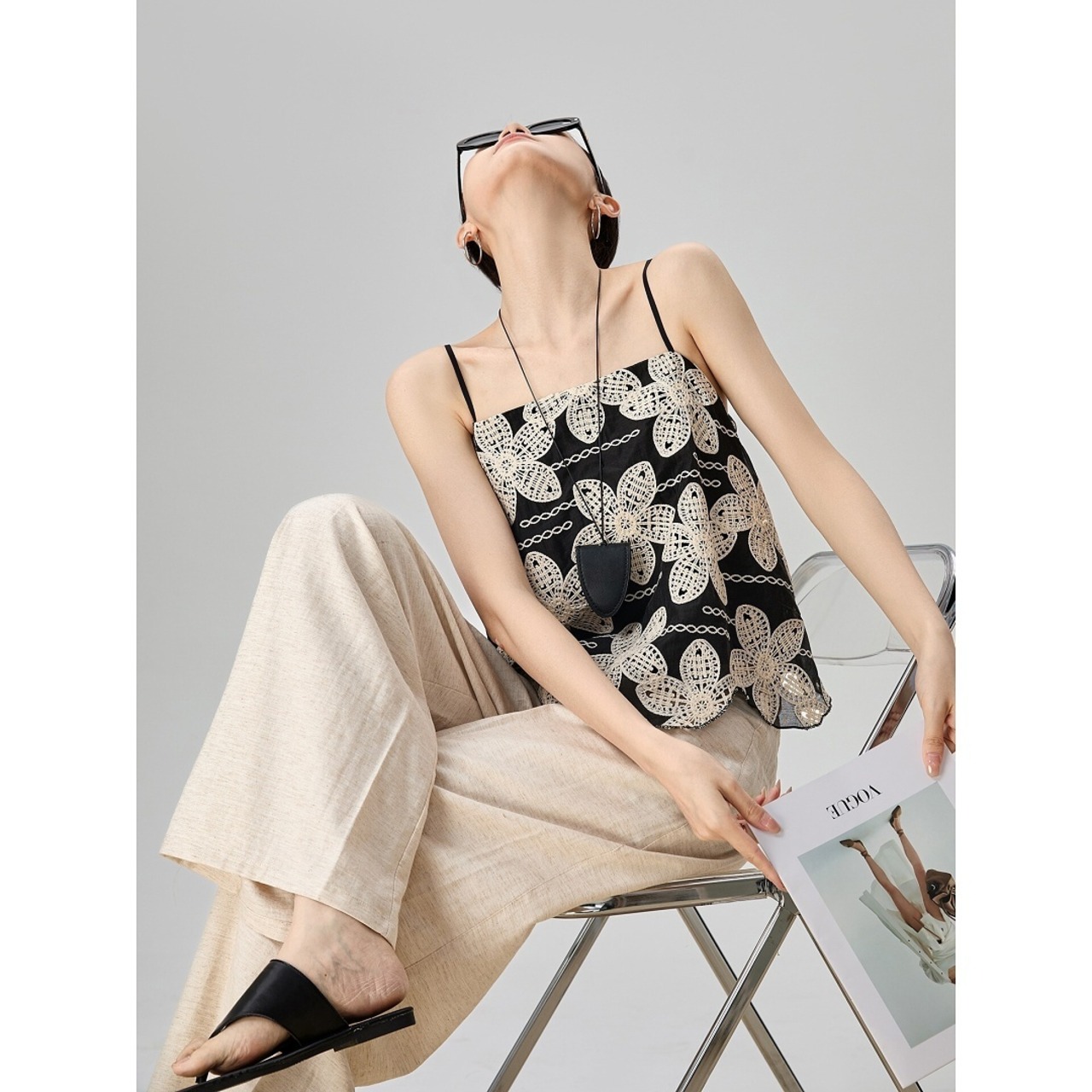 キャミソール 花 フラワー 刺繍 ノースリーブ ブラウス Aライン 上品 大人カジュアル きれいめ レディース トップス 黒 B-1319 【お取寄せ】