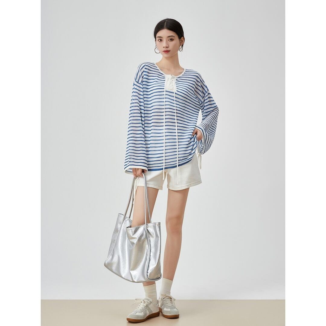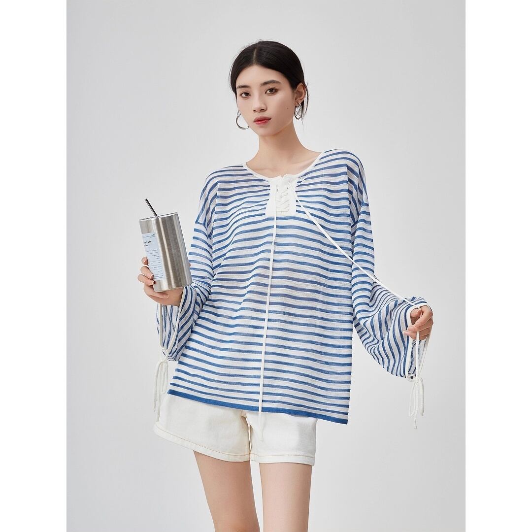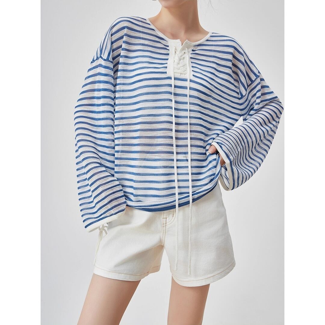 ボーダー レースアップ プルオーバー トップス 長袖 ボリューム袖 透け感 シアー ニットソー カットソー リボン ゆったり ルーズ オーバーサイズ PlumJan レディース 青 白 B-1320 【お取寄せ】