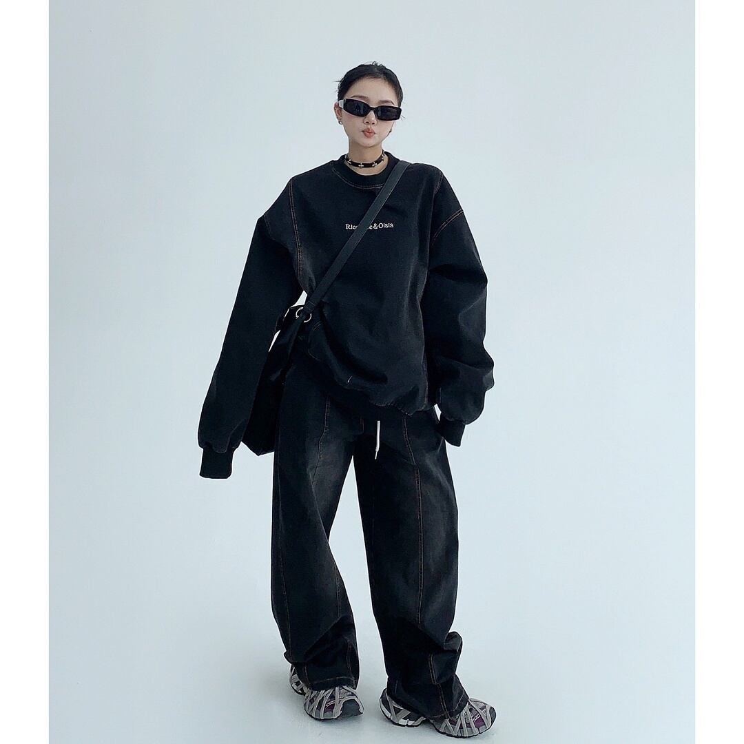 デニム イージーパンツ ワイドパンツ ウォッシュ加工 ウエストゴム ポケット ドローストリング ロングパンツ ストレート ルーズ 大きいサイズ カジュアル メンズライク ストリート OISIS レディース ボトムス 黒 青 B-1328 【お取寄せ】