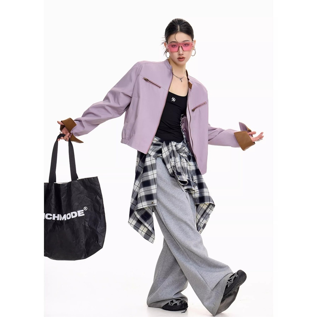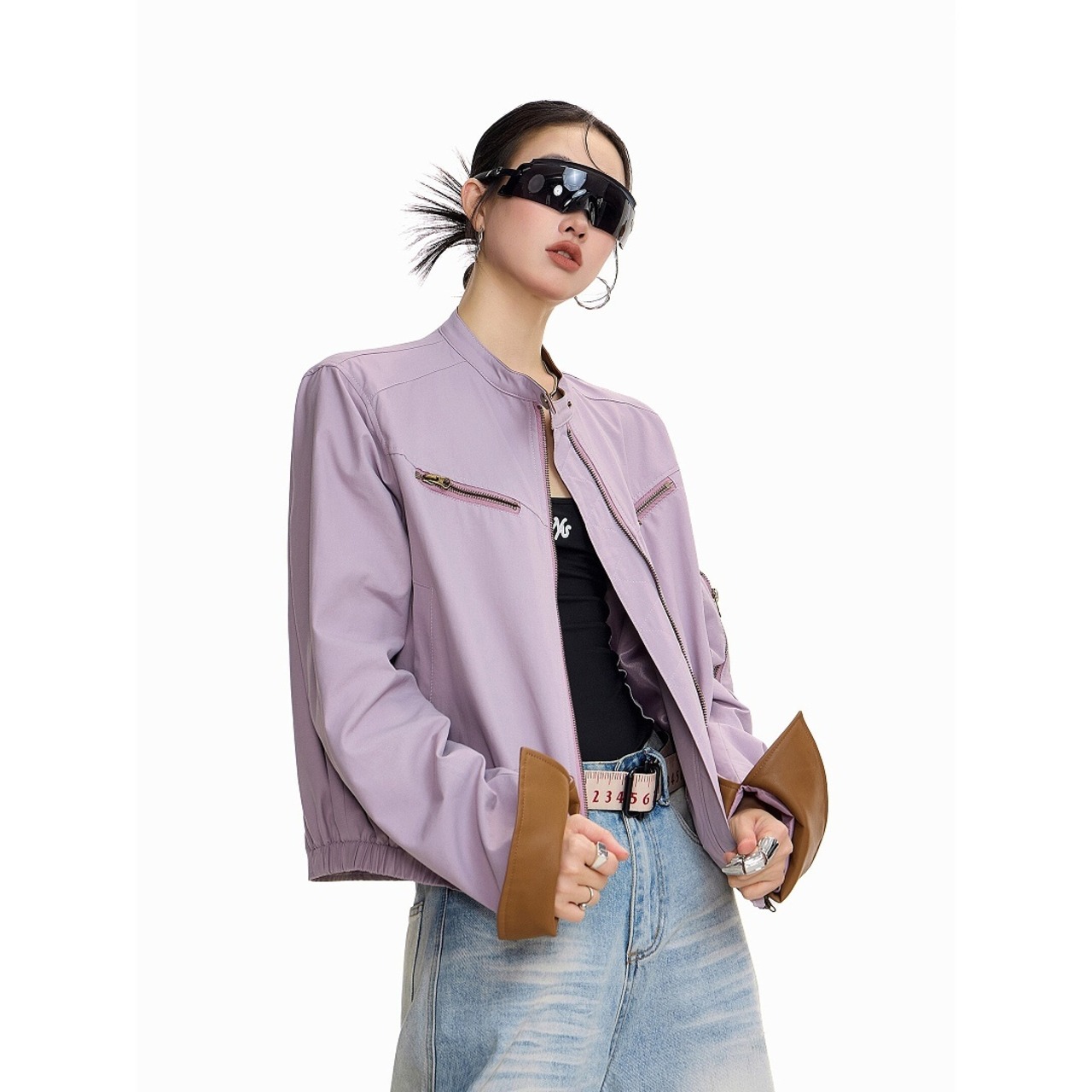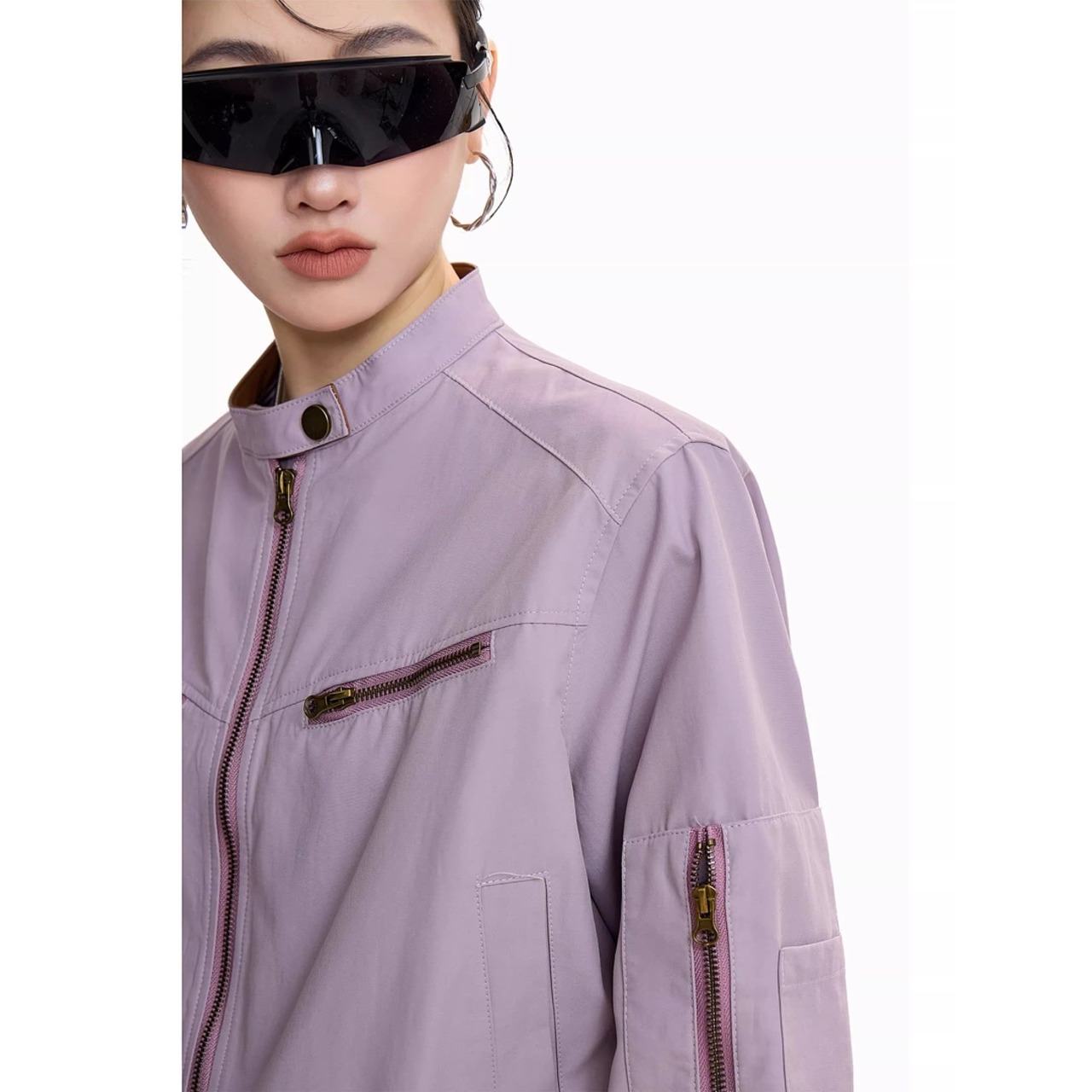 ショート丈 ジップアップ ジャケット ブルゾン ジャンパー スタンドカラー バンドカラー ハイネック 長袖 カジュアル ICH MODE レディース アウター 黒 紫 B-1350 【お取寄せ】