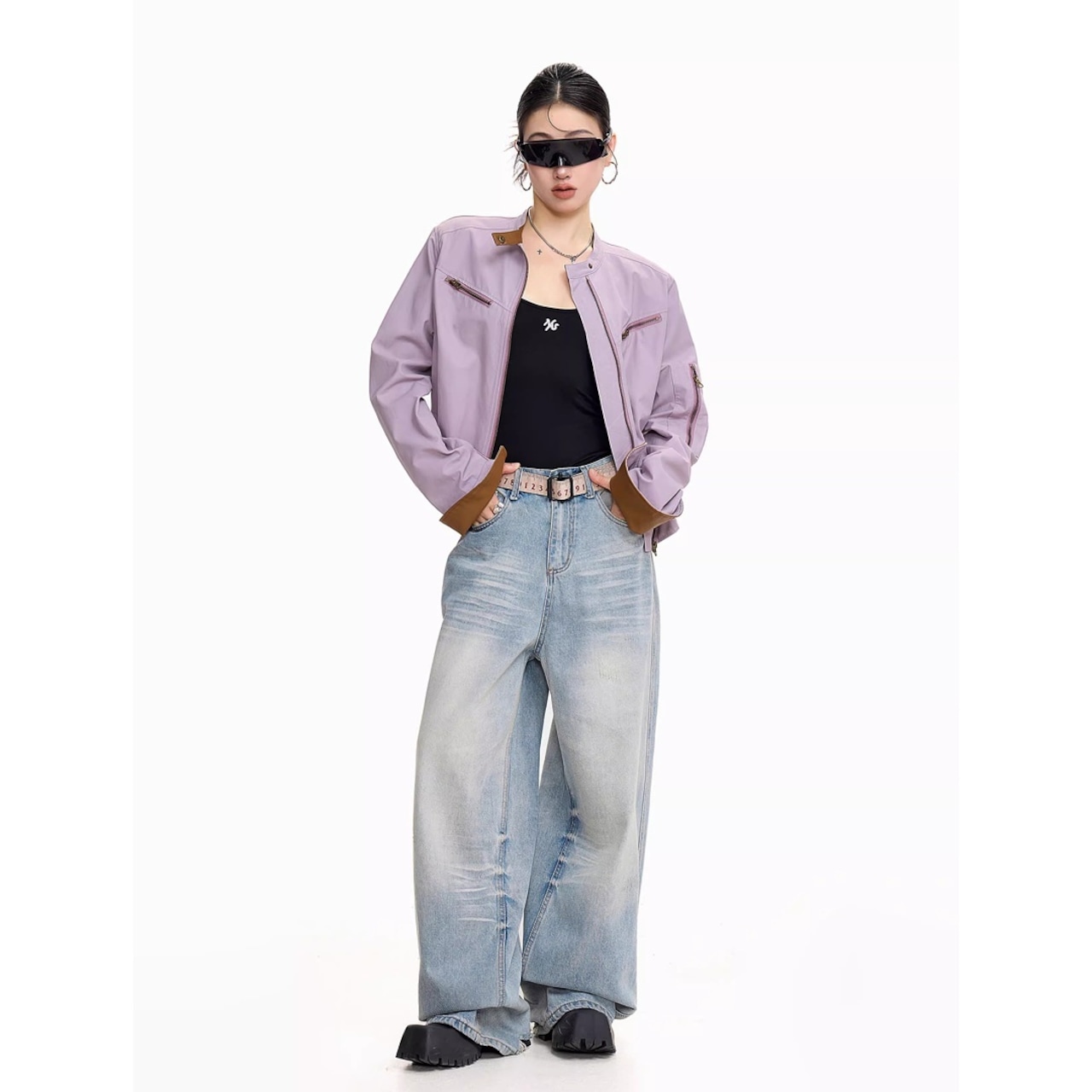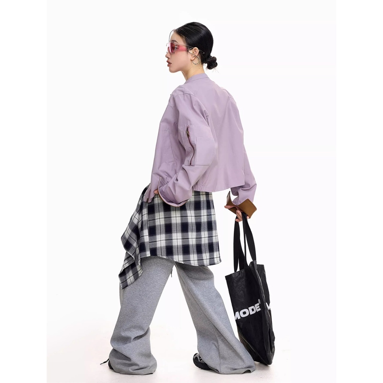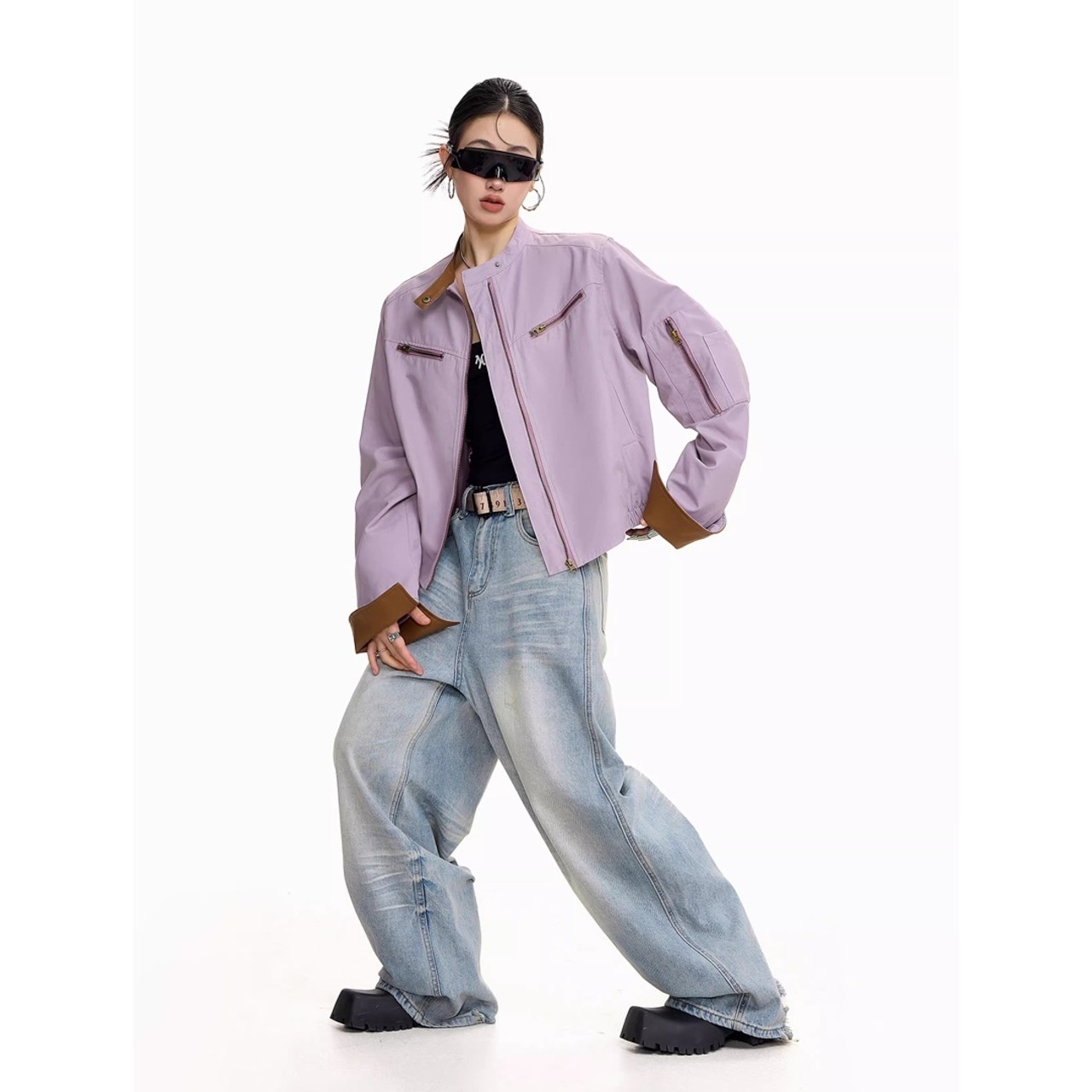 ショート丈 ジップアップ ジャケット ブルゾン ジャンパー スタンドカラー バンドカラー ハイネック 長袖 カジュアル ICH MODE レディース アウター 黒 紫 B-1350 【お取寄せ】