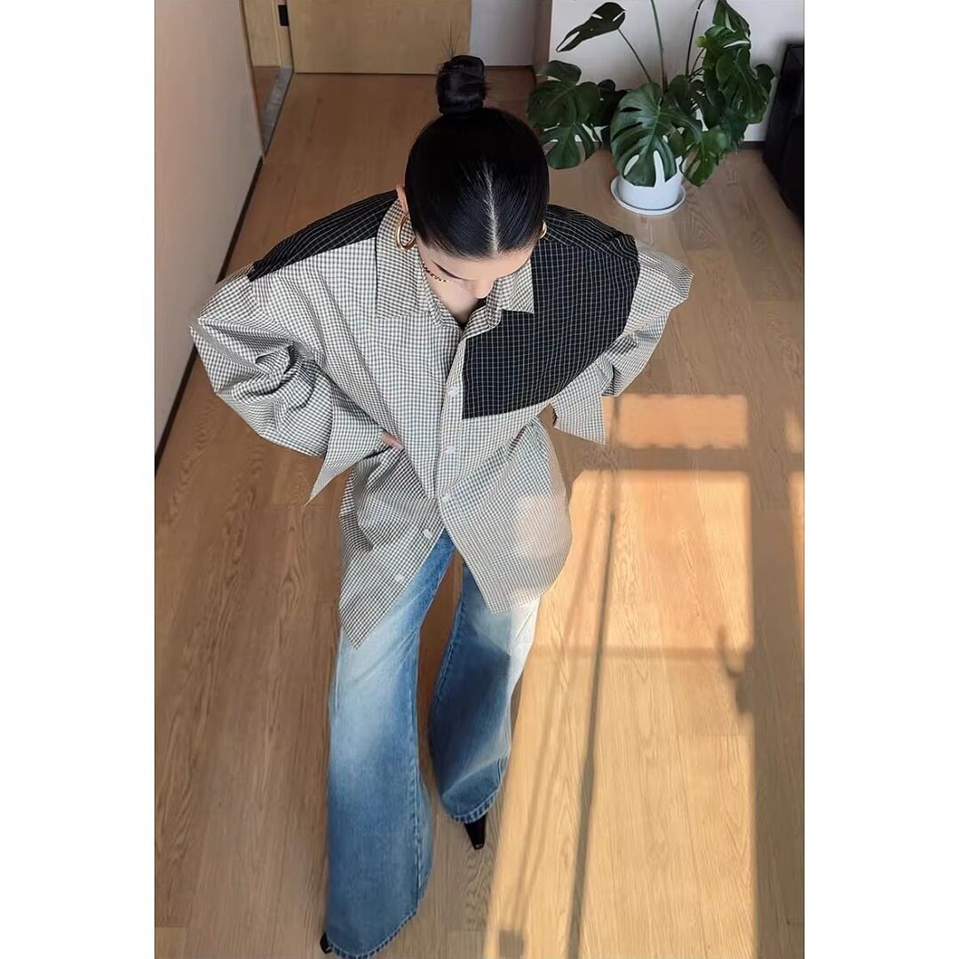 パッチワーク チェック柄 シャツ 長袖 切り替え ブラウス オーバーサイズ ルーズ ゆったり カジュアル メンズライク きれいめ CIZZLEMORE レディース トップス B-1352 【お取寄せ】