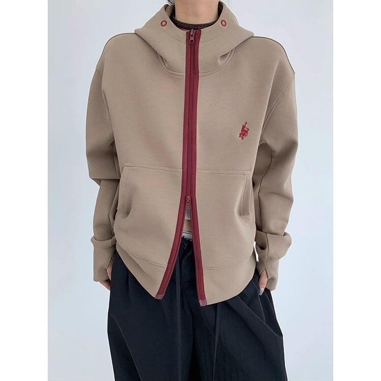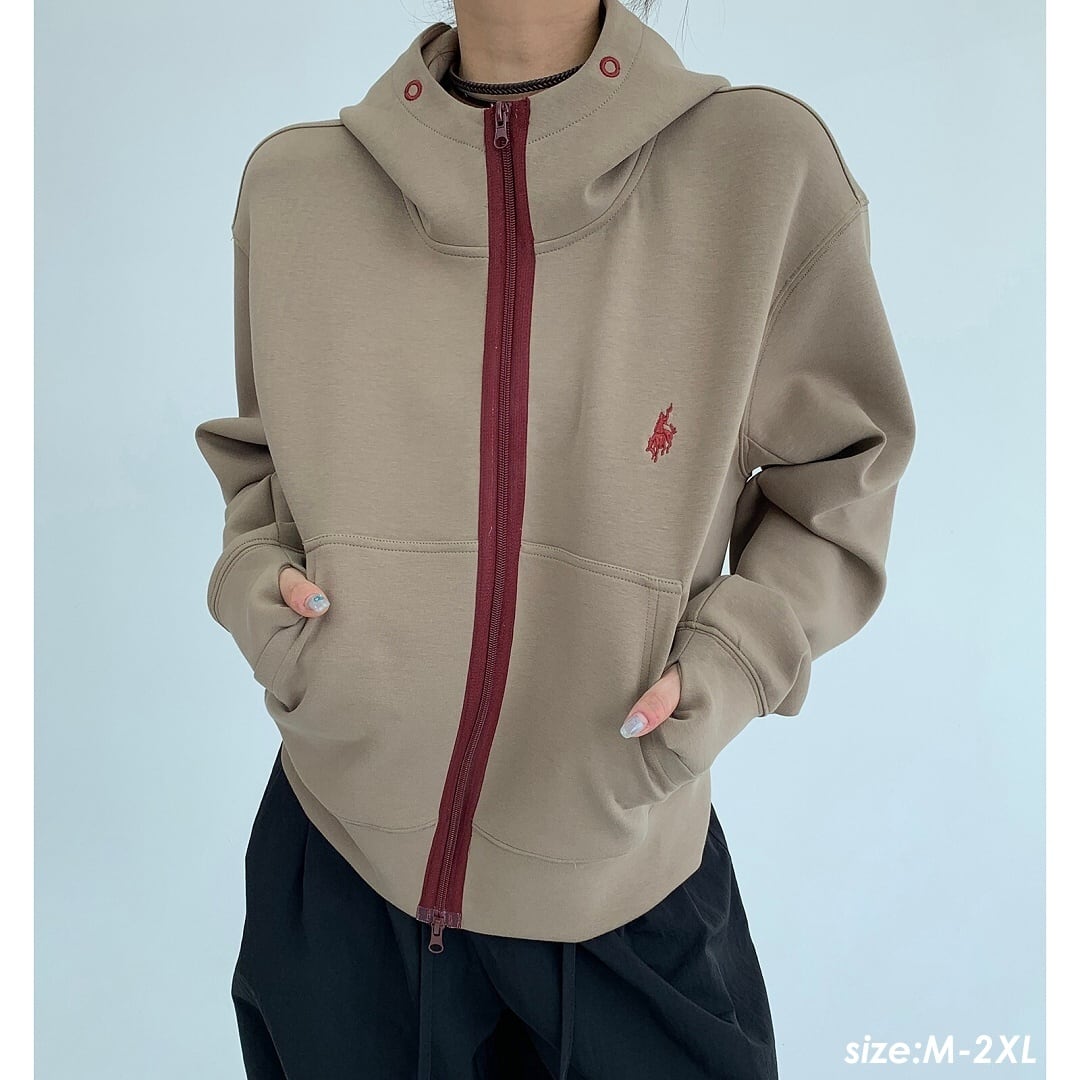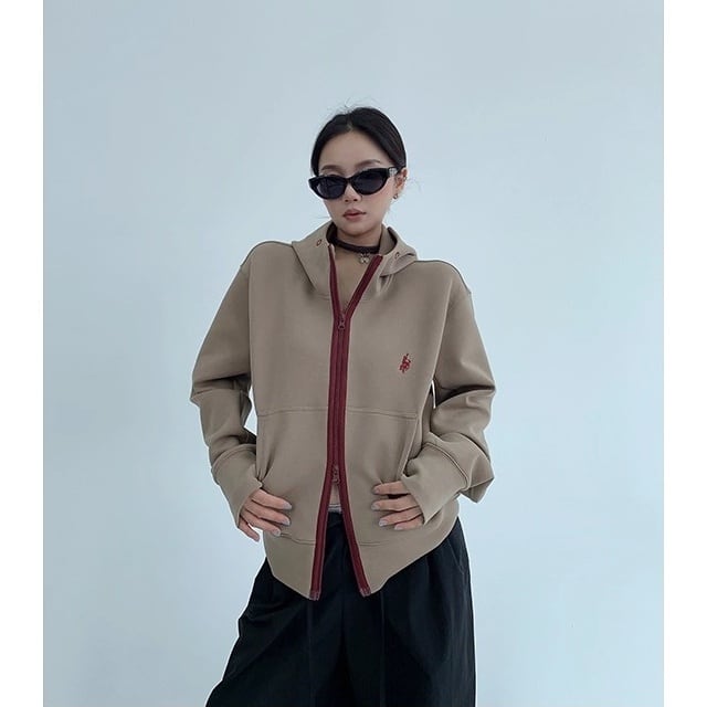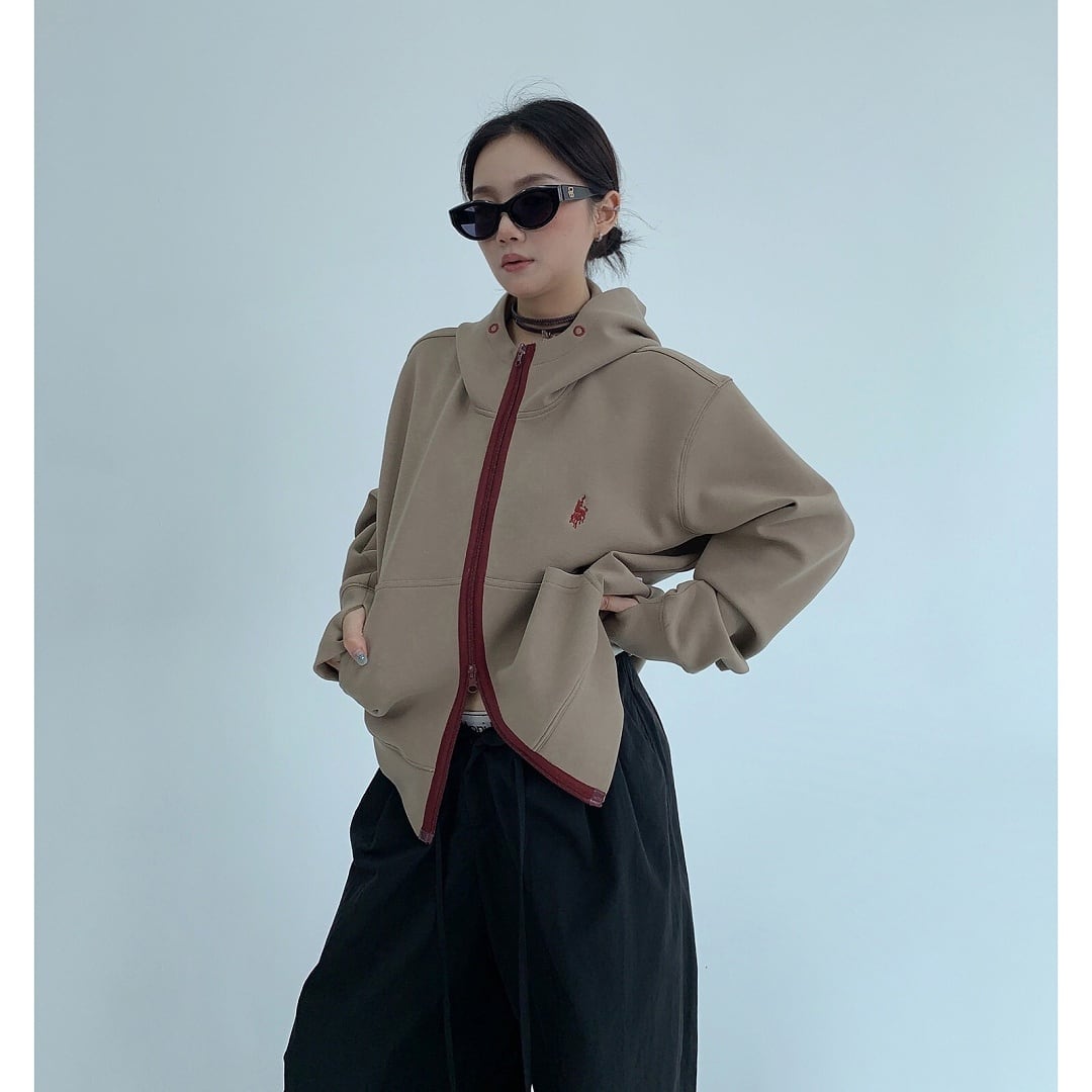 ワインレッドのジップラインが映えるジップパーカー。