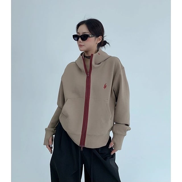 バイカラー ジップパーカー フーディー 長袖 ジップアップ ダブルジップ 指穴 サムホール 刺繍 フード付き スポーツ ジャケット 大きいサイズ カジュアル メンズライク OISIS レディース トップス ベージュ モカ 茶 B-1355 【お取寄せ】