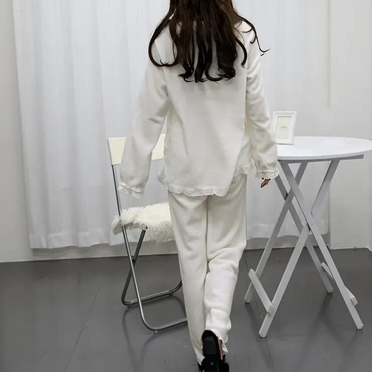 【送料無料・即納】 2タイプ フリース パジャマ ルームウェア 長袖 リボン フリル 起毛 ワンピース トップス パンツ セットアップ 上下セット 部屋着 ナイトウェア 秋冬 レディース 白 NS-2510