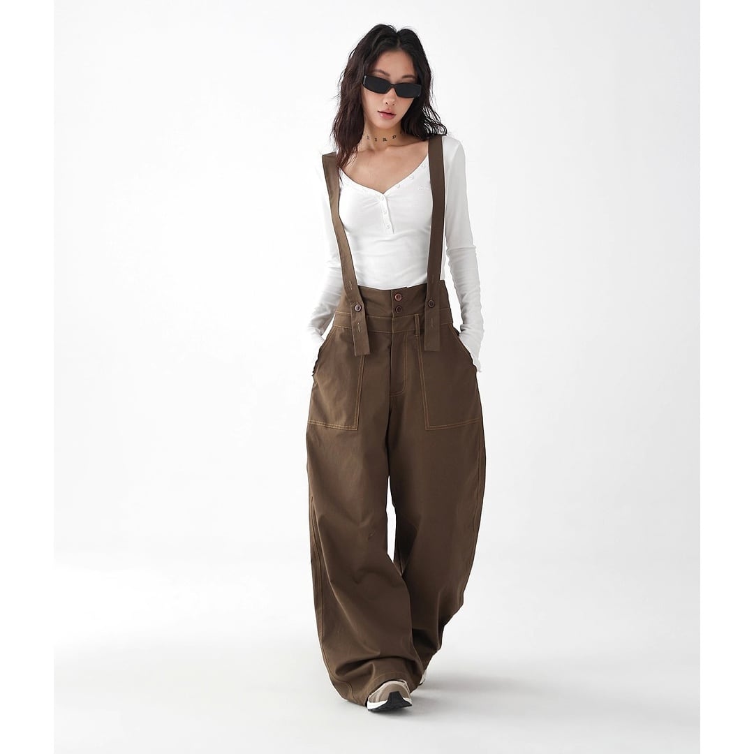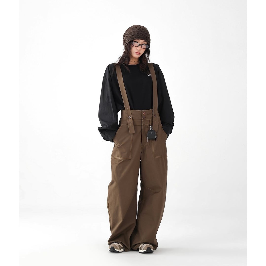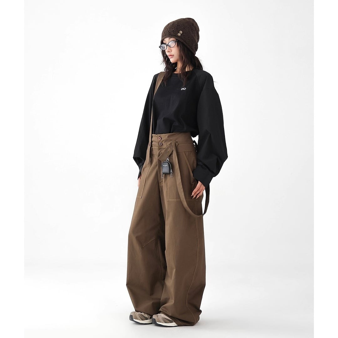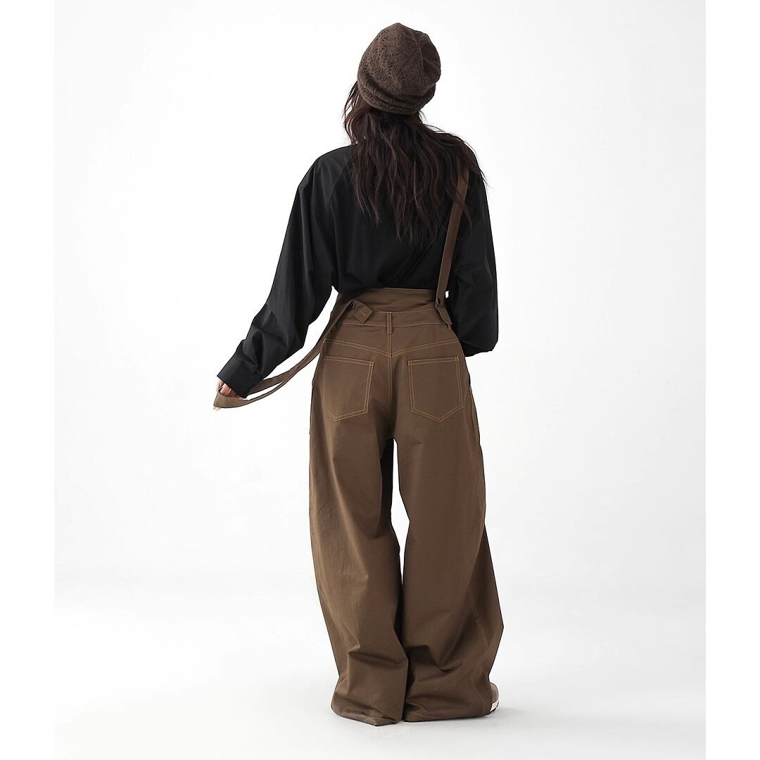 ワイド サロペット パンツ サスペンダーパンツ ストラップ ジャンプスーツ オーバーオール オールインワン ワイドパンツ ルーズフィット カジュアル ストリート レディース 茶 B-1362 【お取寄せ】