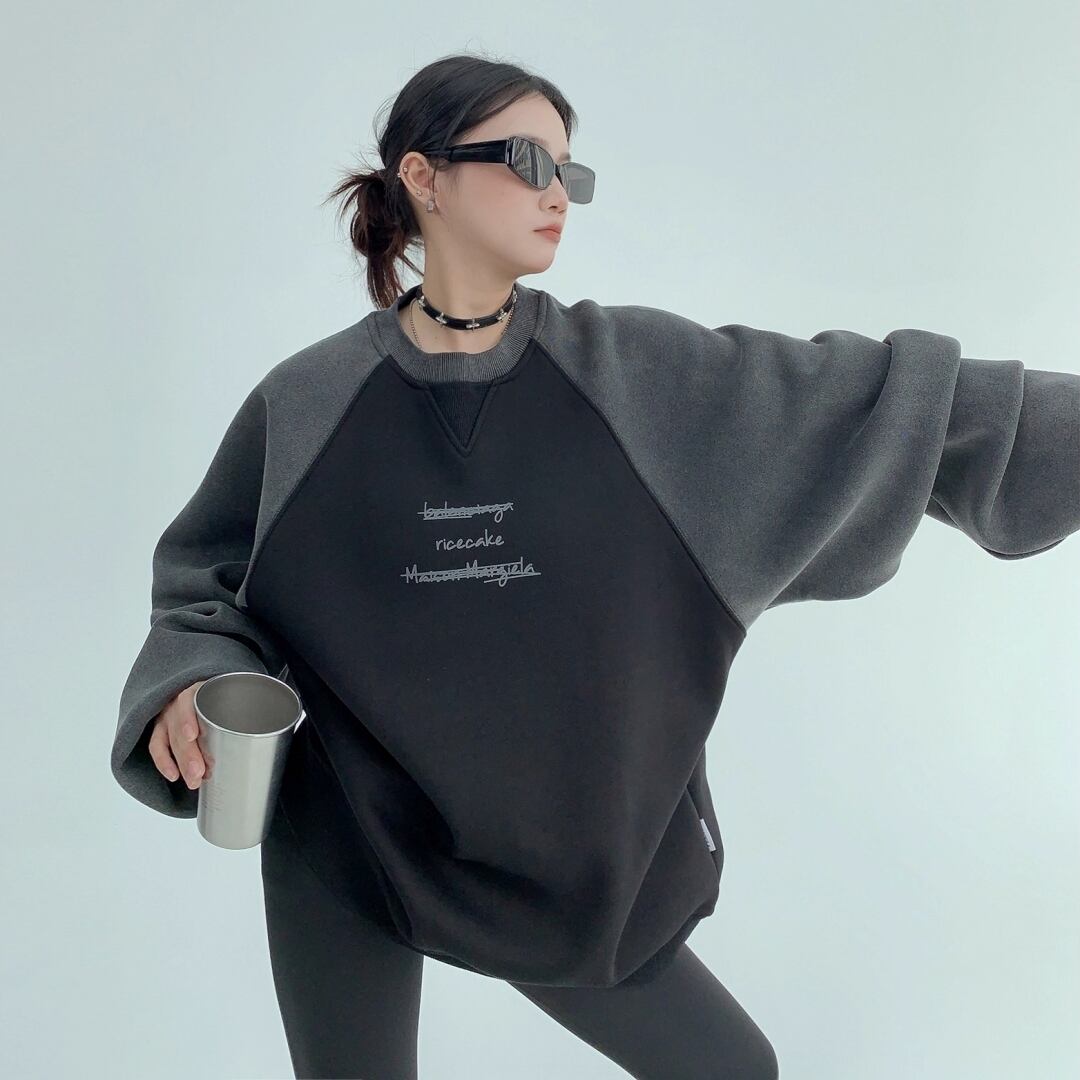 スウェットシャツ トレーナー 裏起毛 ラグランスリーブ 長袖 ロゴ レザーパッチ 配色 バイカラー ラウンドネック プルオーバー ゆったり ルーズ オーバーサイズ 大きいサイズ カジュアル メンズライク ストリート feichaiyoulaile レディース トップス 黒 B-1376 【お取寄せ】