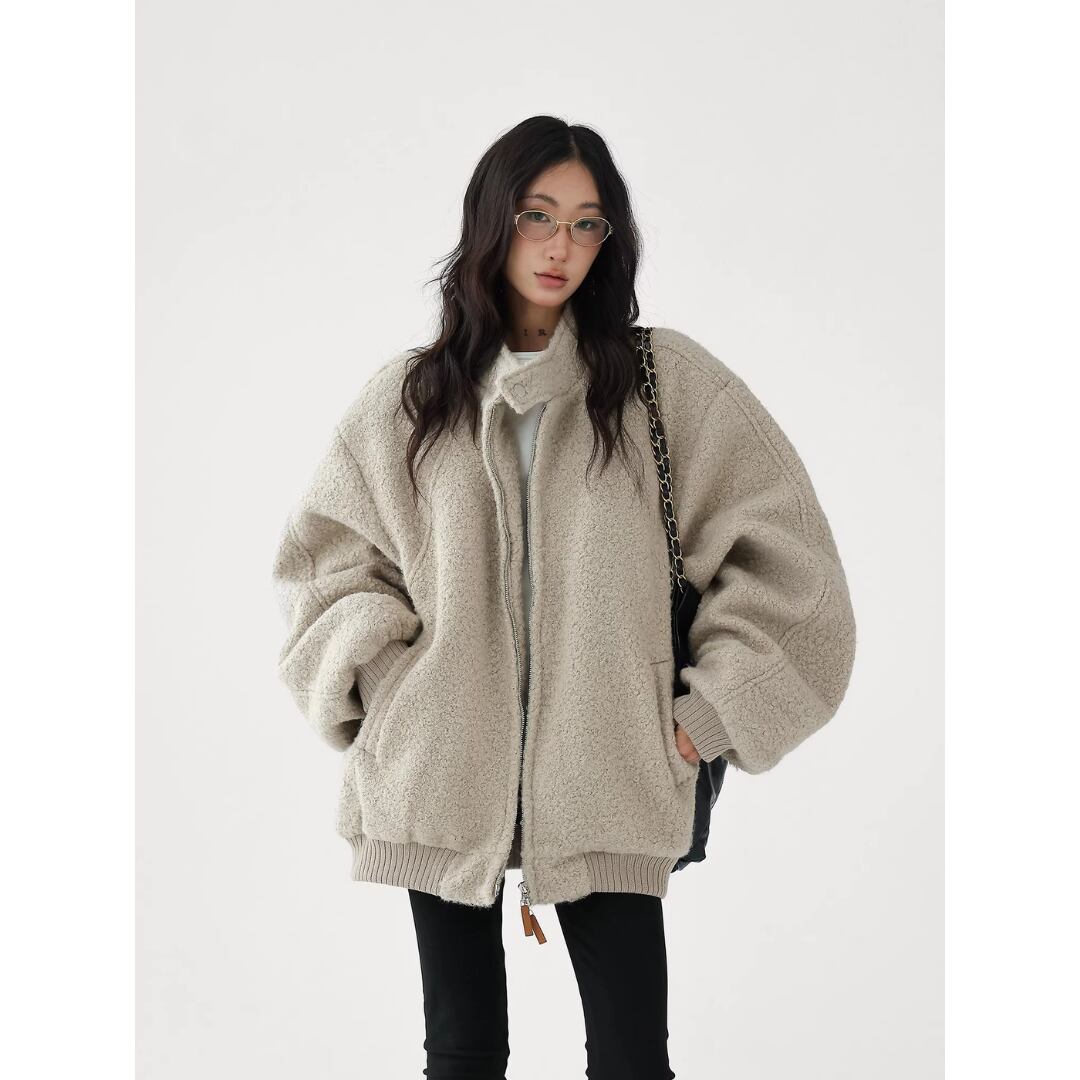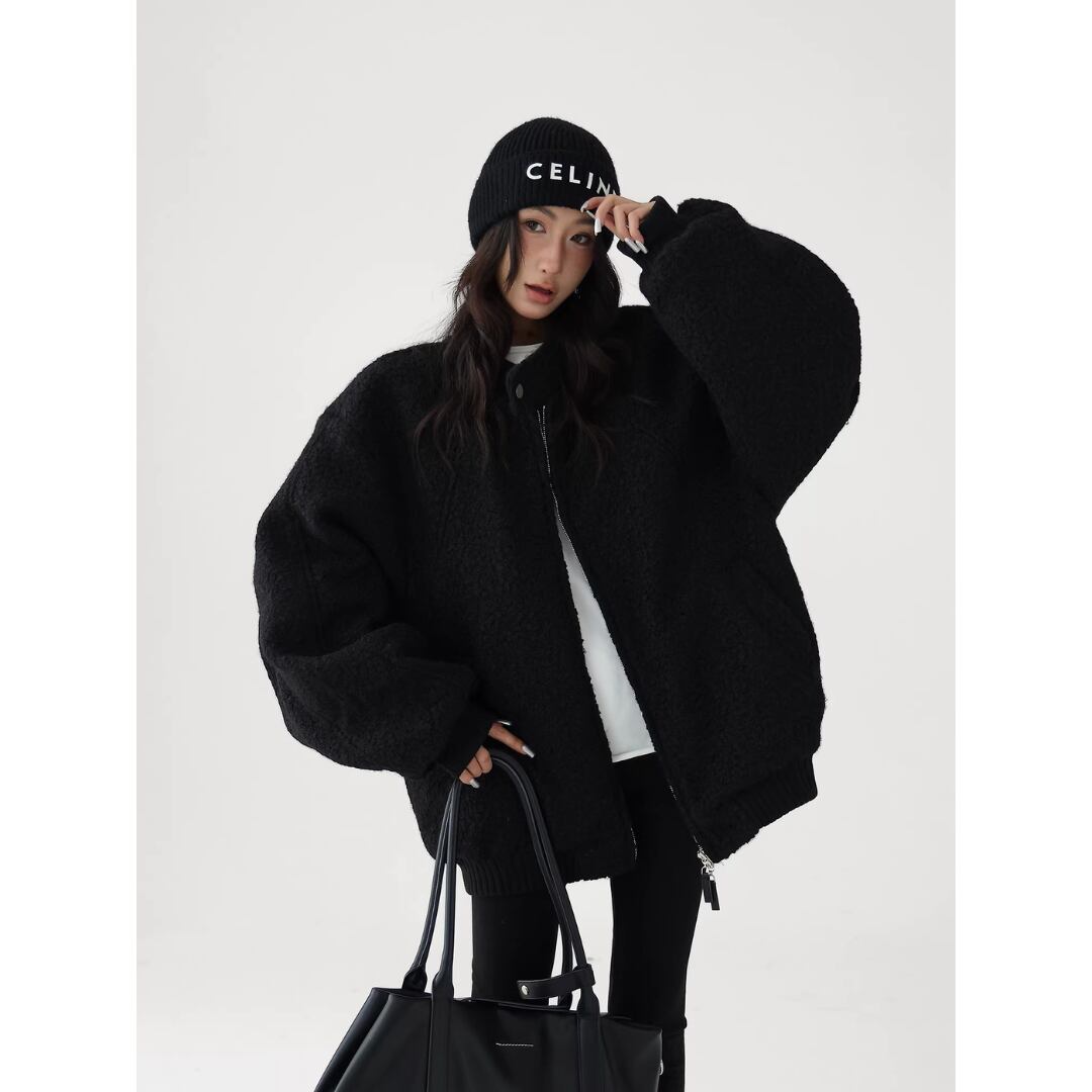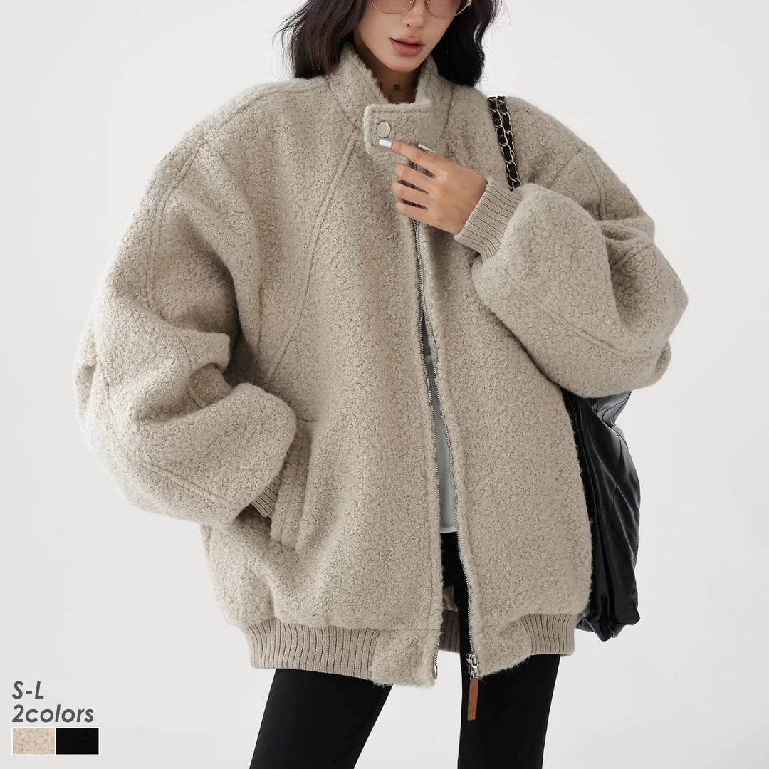 中綿 ブルゾン ジャケット スタンドカラー ジップアップ ボア ジャンパー 防寒 秋冬 ルーズ オーバーサイズ カジュアル ストリート Acestudios レディース アウター 黒 ベージュ B-1415 【お取寄せ】