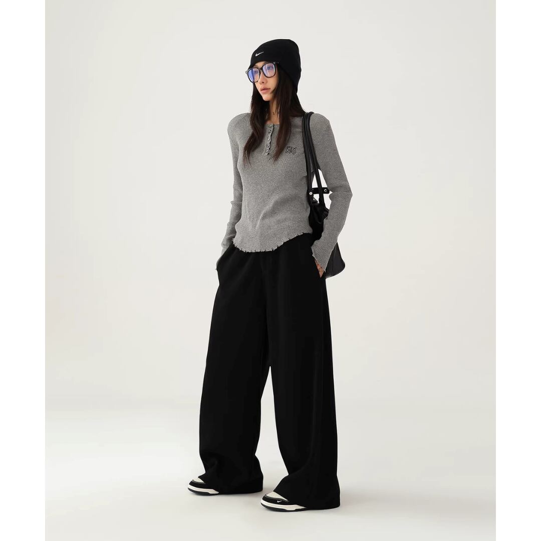 落ち感のある生地が脚のラインを拾いにくく、リラックスした穿き心地とすっきりした印象を両立します。