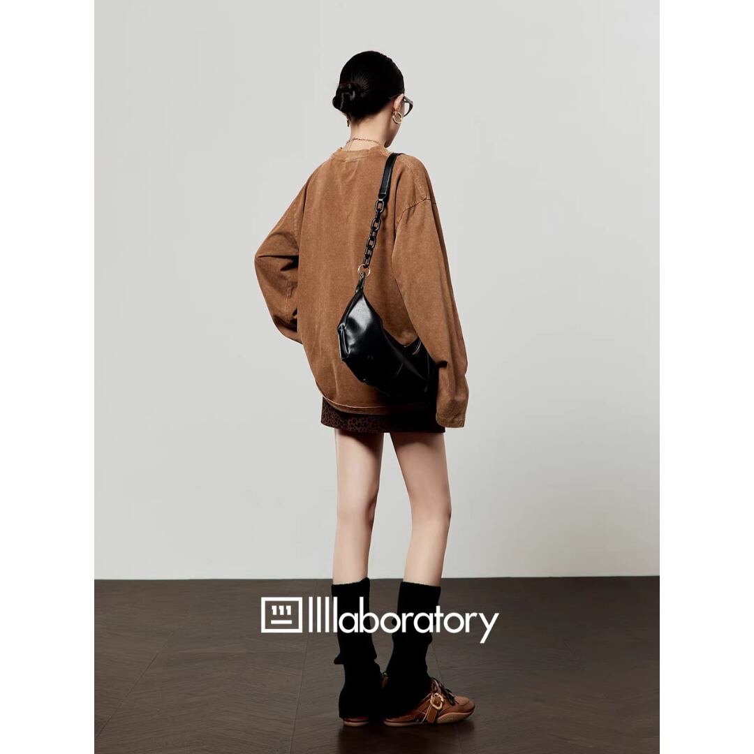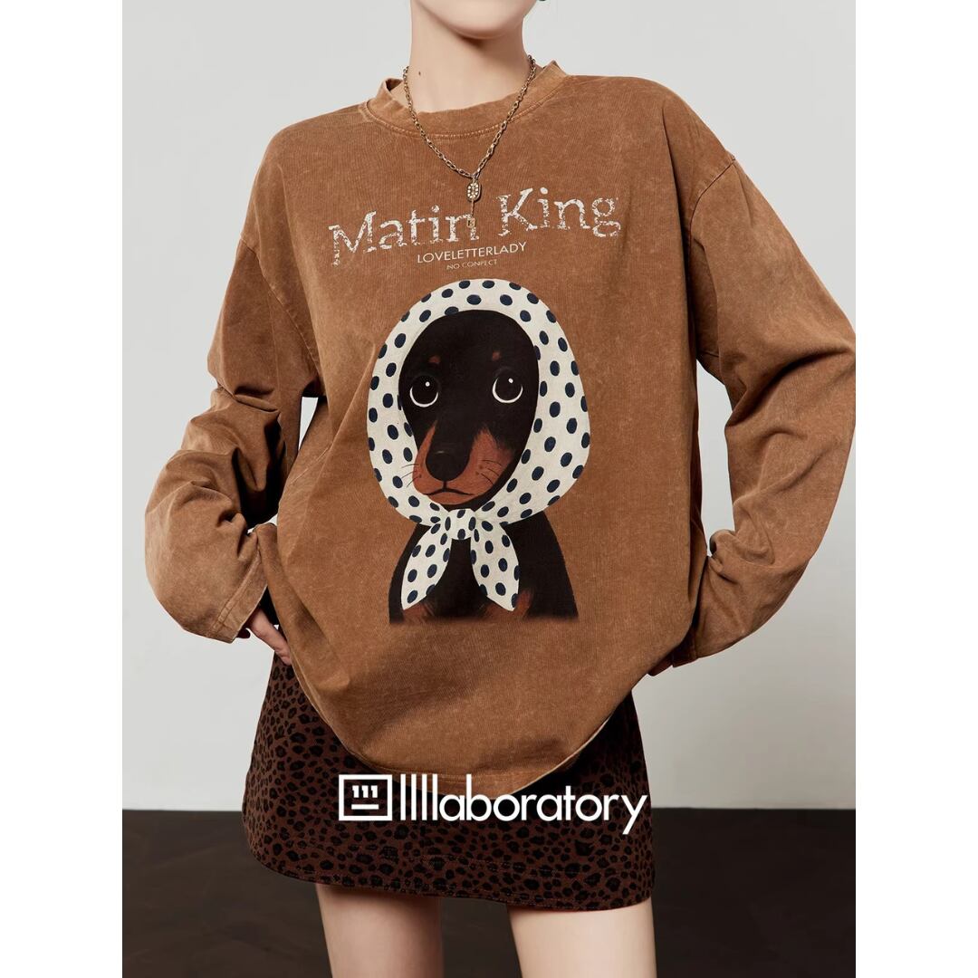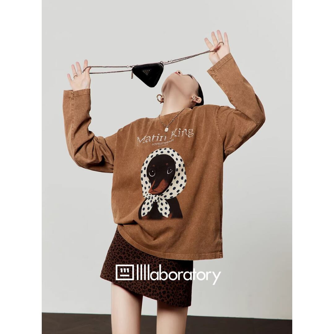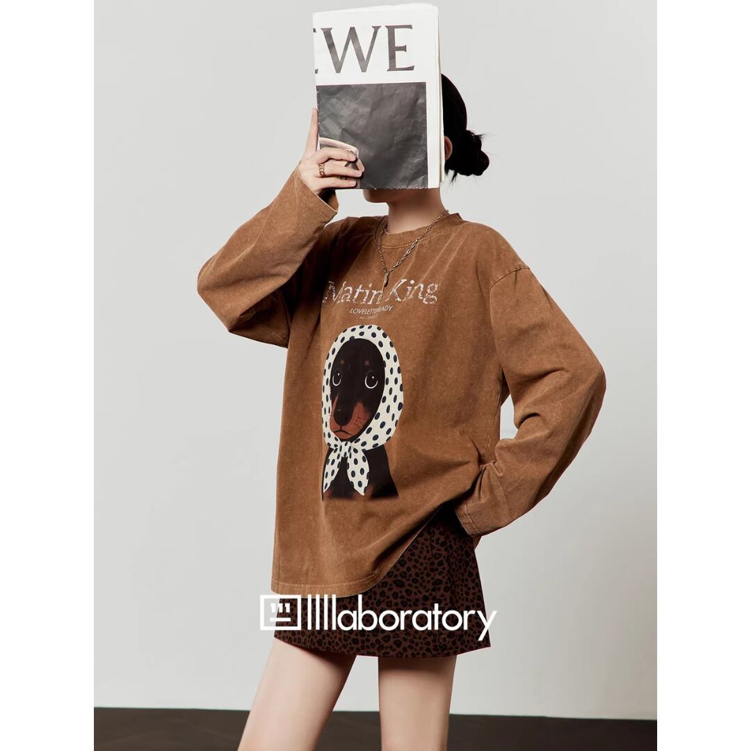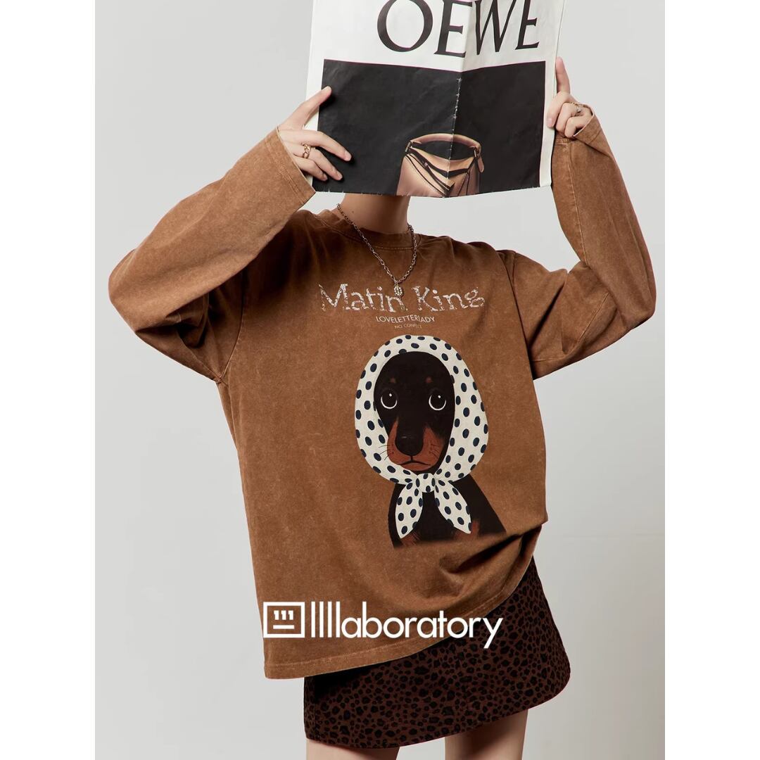 ロングスリーブ Tシャツ 犬 ロゴ 英字 プリント 長袖 ラウンドネック ロンT カットソー プルオーバー ヴィンテージ風 レトロ感 オーバーサイズ カジュアル ストリート love letter lady レディース トップス 茶 B-1426 【お取寄せ】