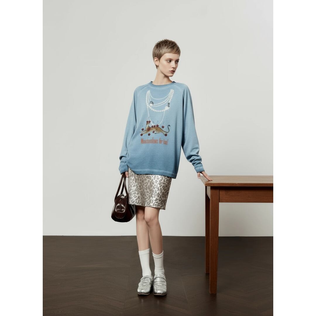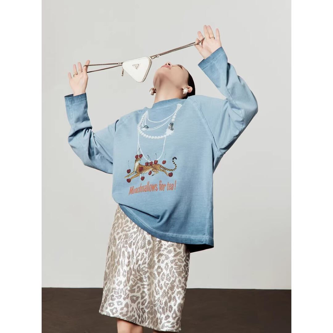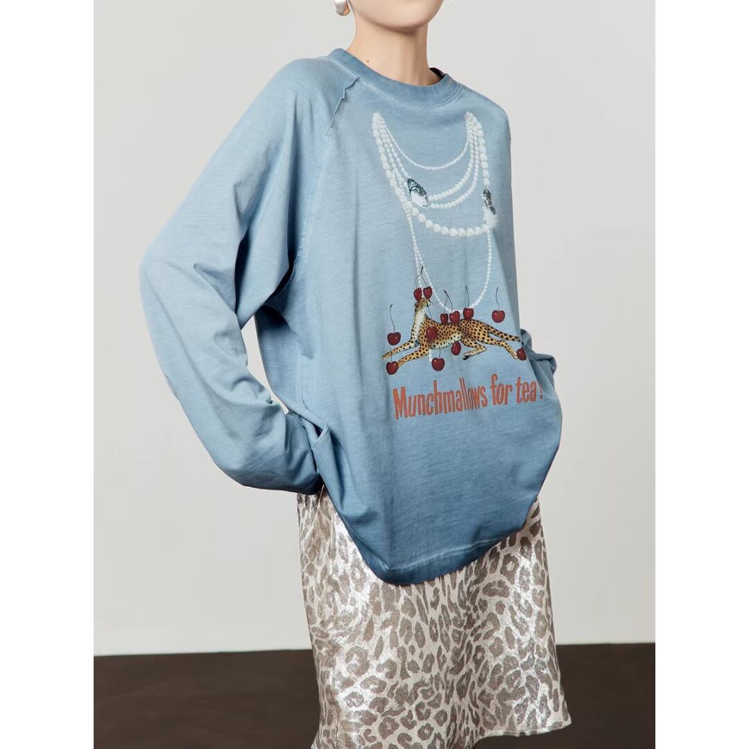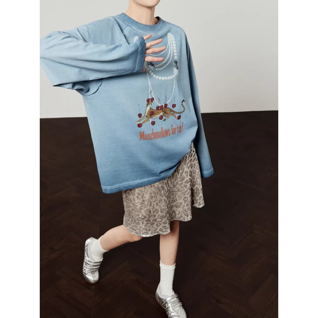 淡いグレーブルーに、レオパードモチーフとパールネックレス風プリントが印象的な長袖Tシャツ。