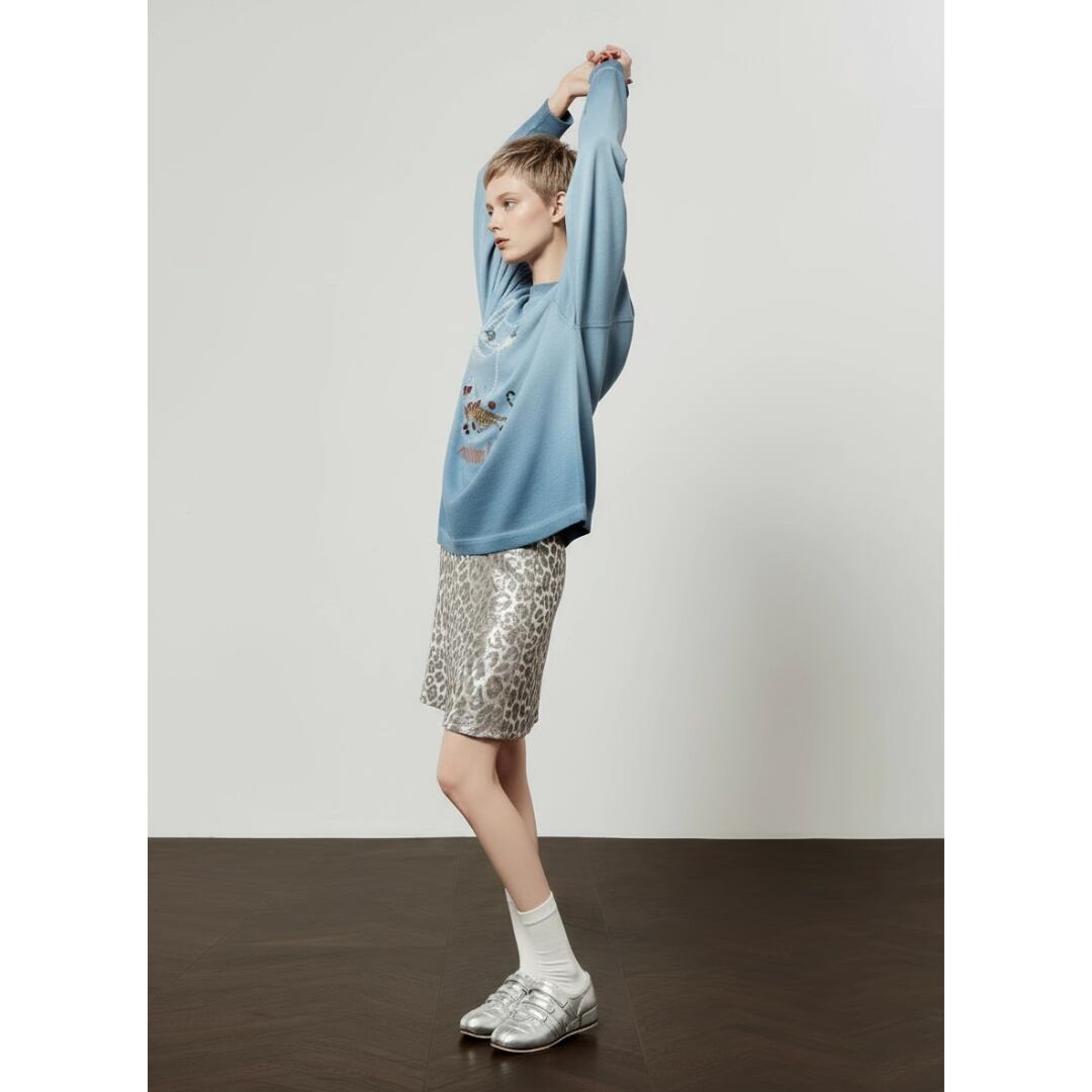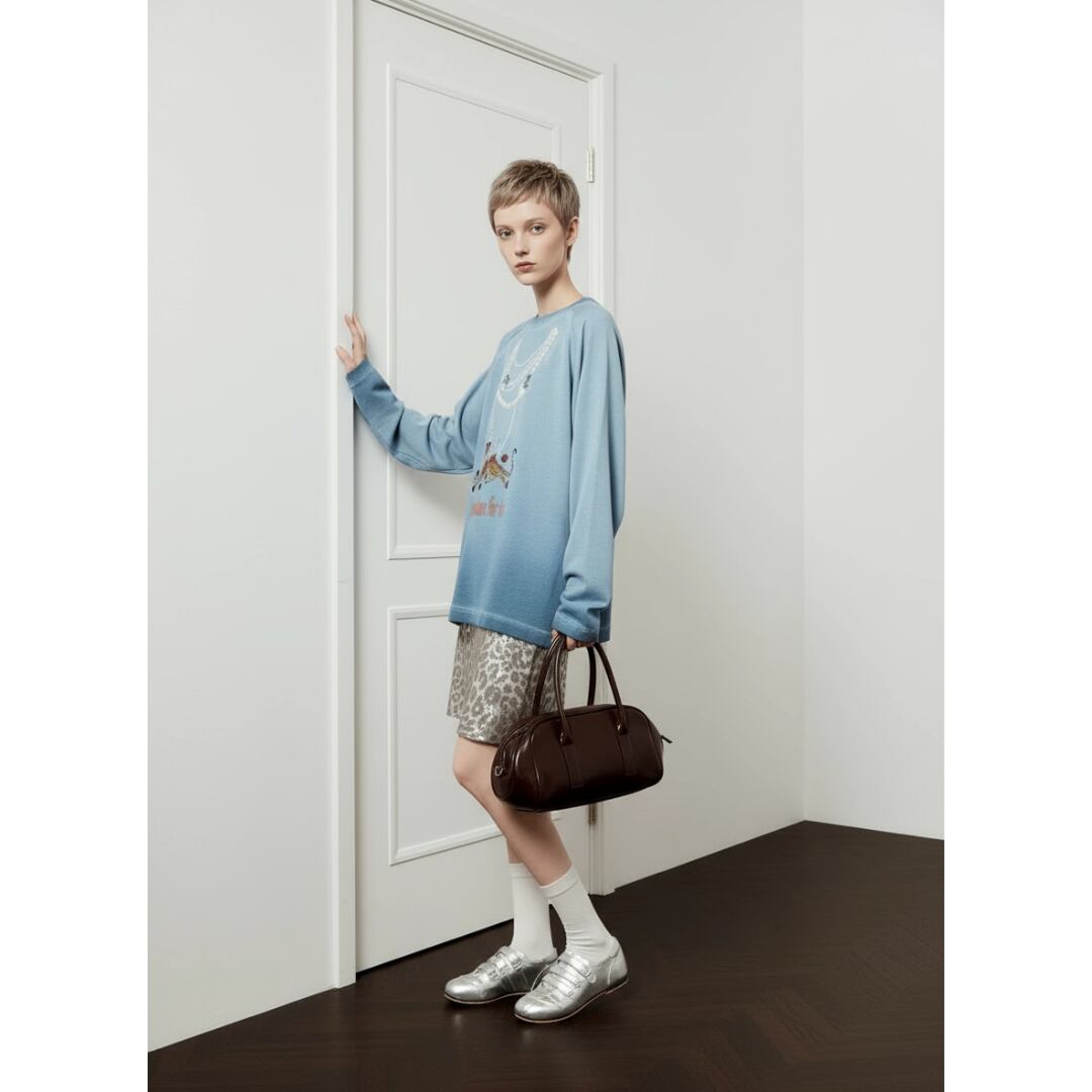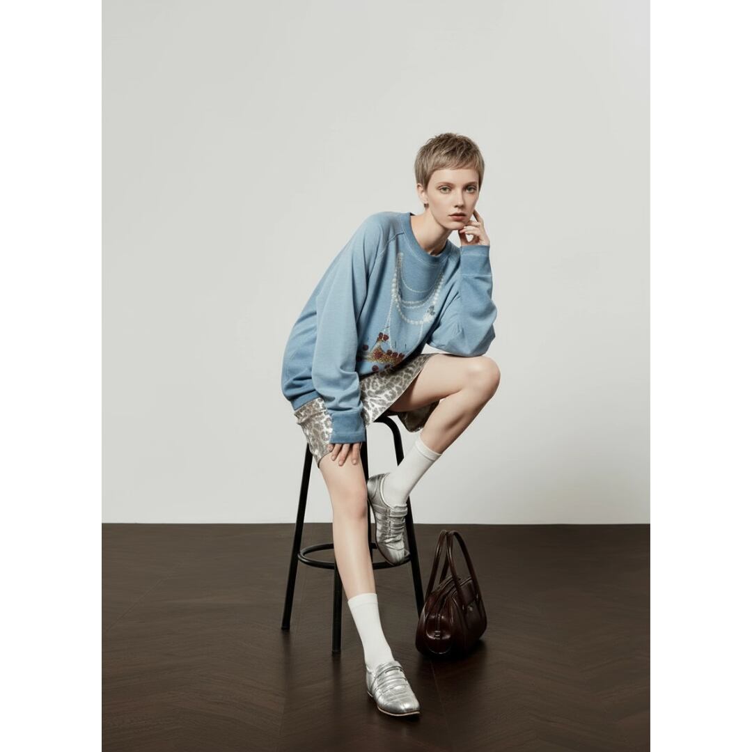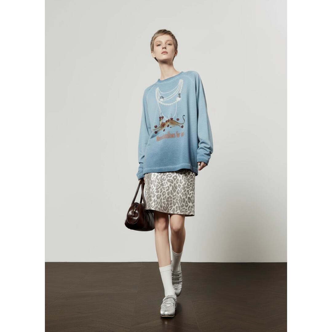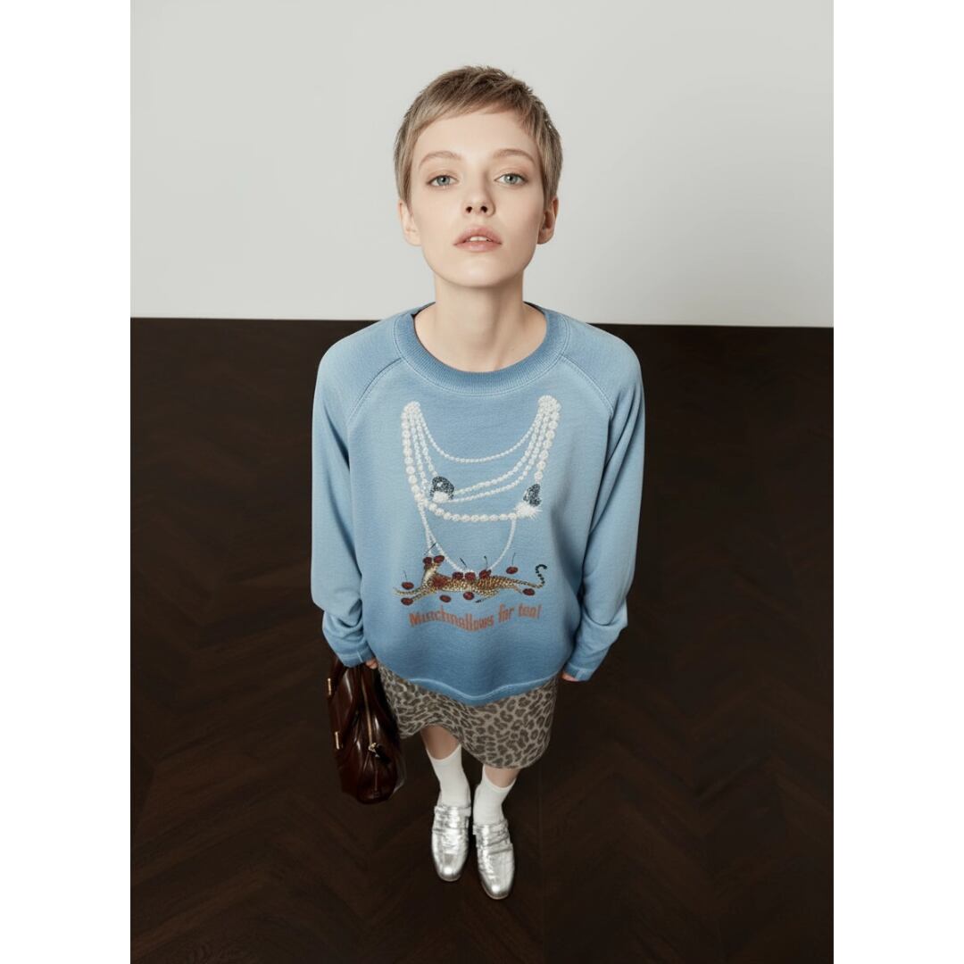 淡いグレーブルーに、レオパードモチーフとパールネックレス風プリントが印象的な長袖Tシャツ。