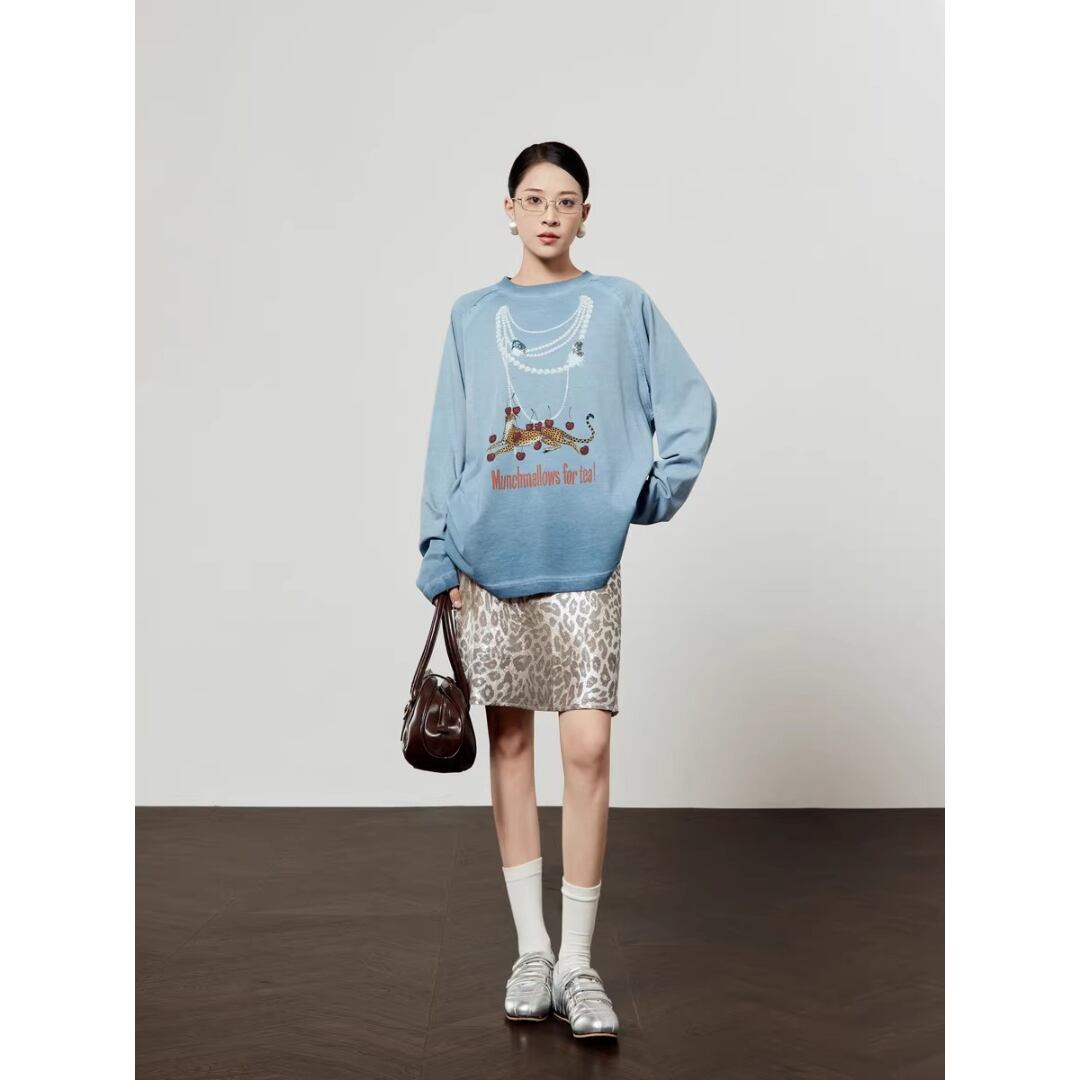 ロングスリーブ Tシャツ ヒョウ 動物 アニマル パールネックレス ロゴ プリント 長袖 ラグランスリーブ ラウンドネック ロンT カットソー プルオーバー オーバーサイズ カジュアル love letter lady レディース トップス 青 水色 B-1427 【お取寄せ】