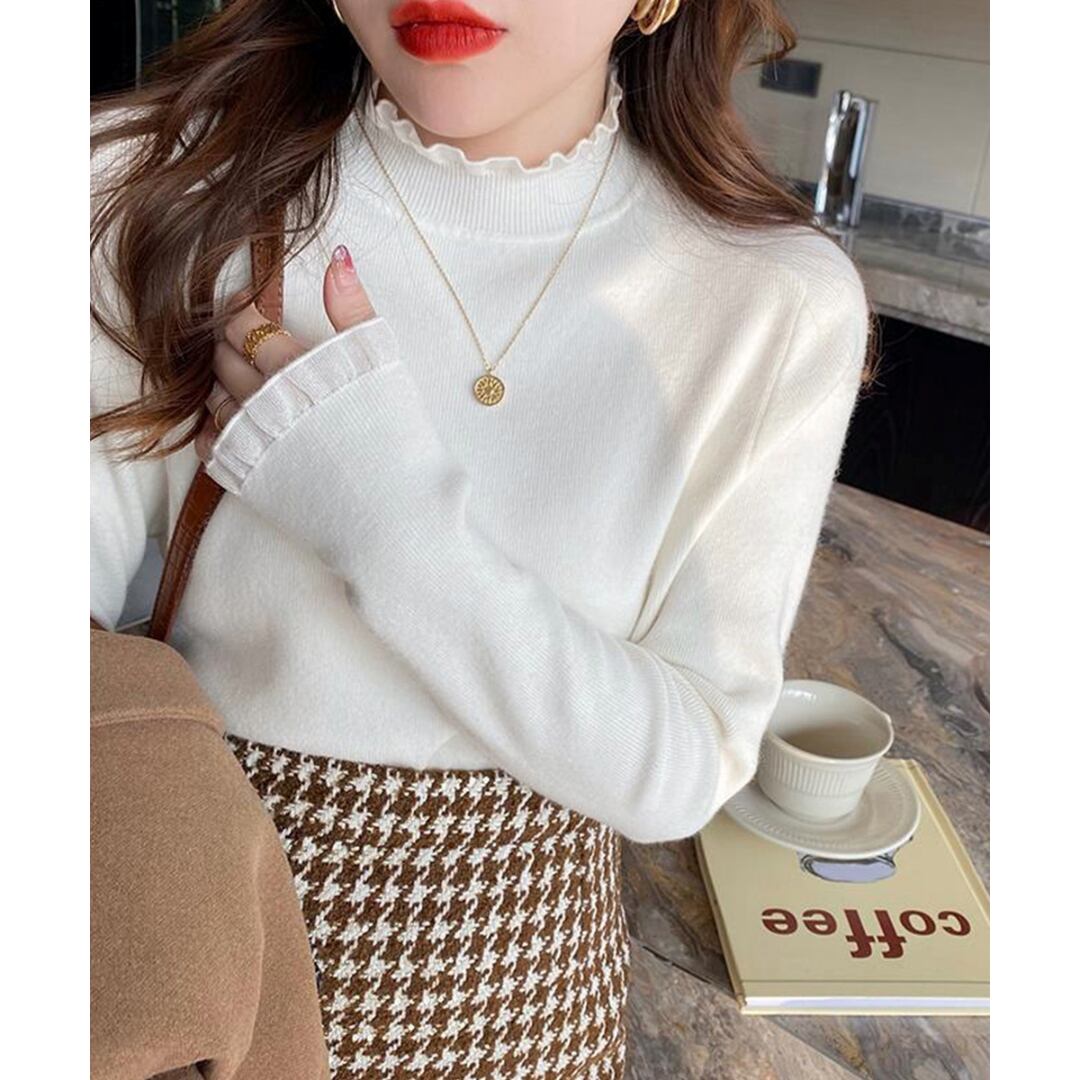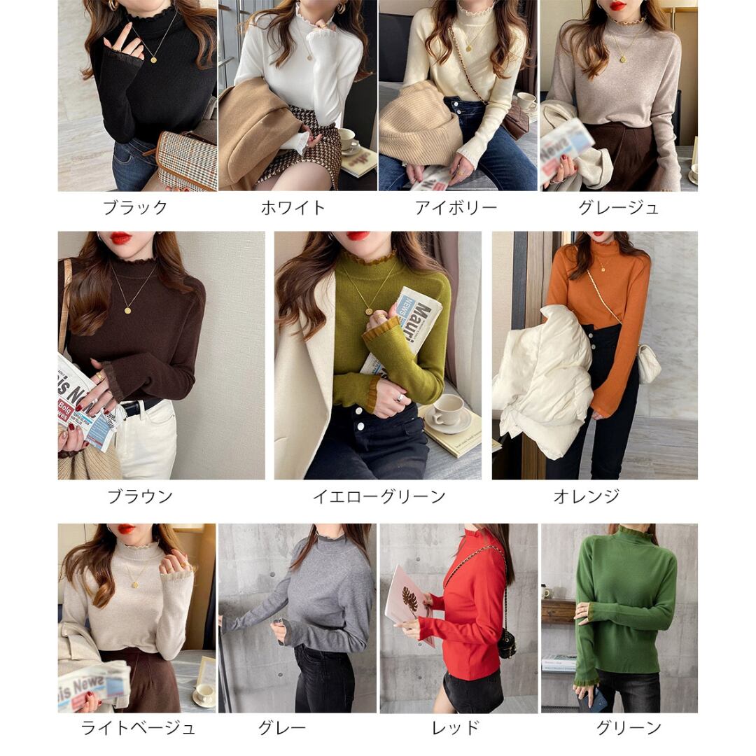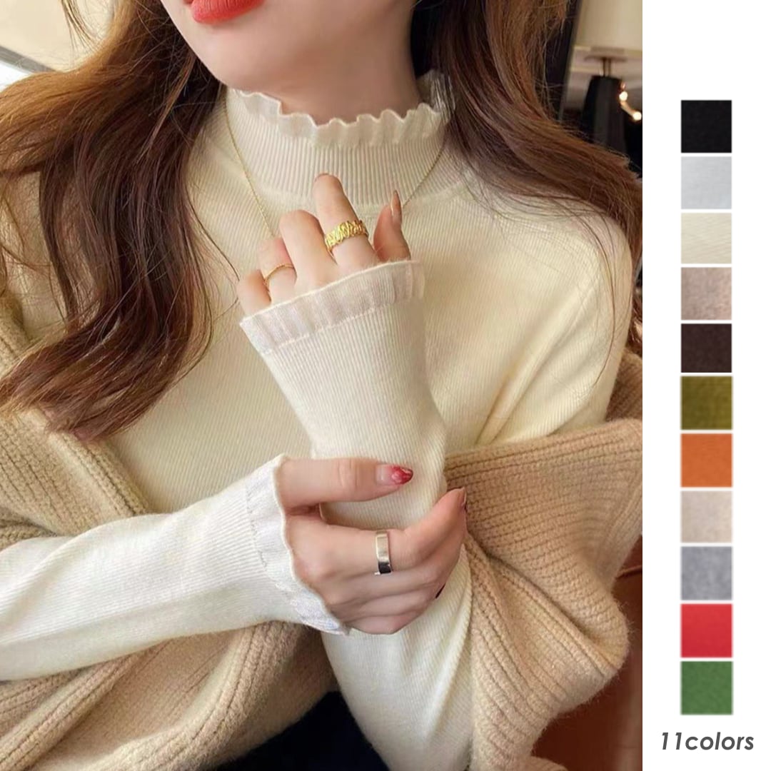 【送料無料・即納】 フリル ハイネック ニット トップス 長袖 ニットソー セーター プルオーバー 上品 きれいめ レディース 白 黒 茶 赤 緑 NS-2514