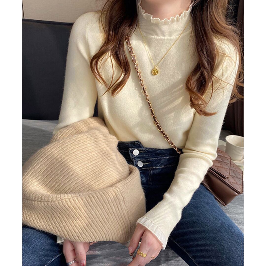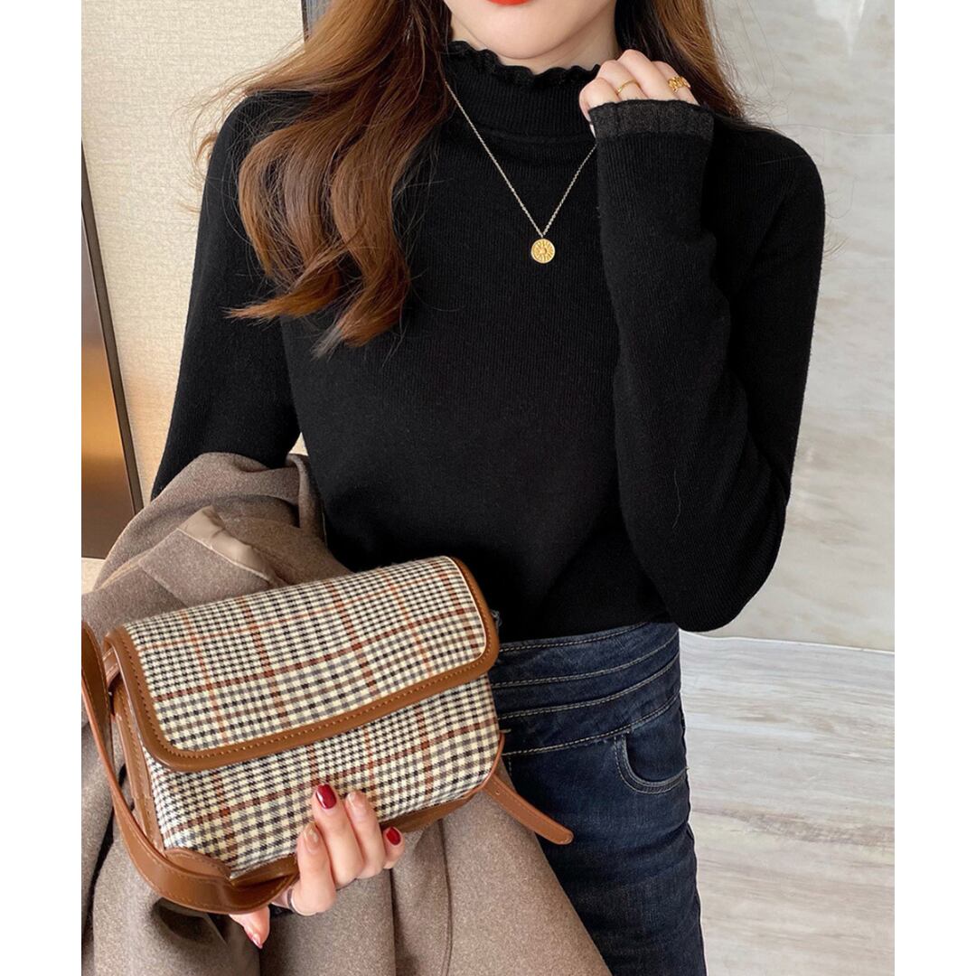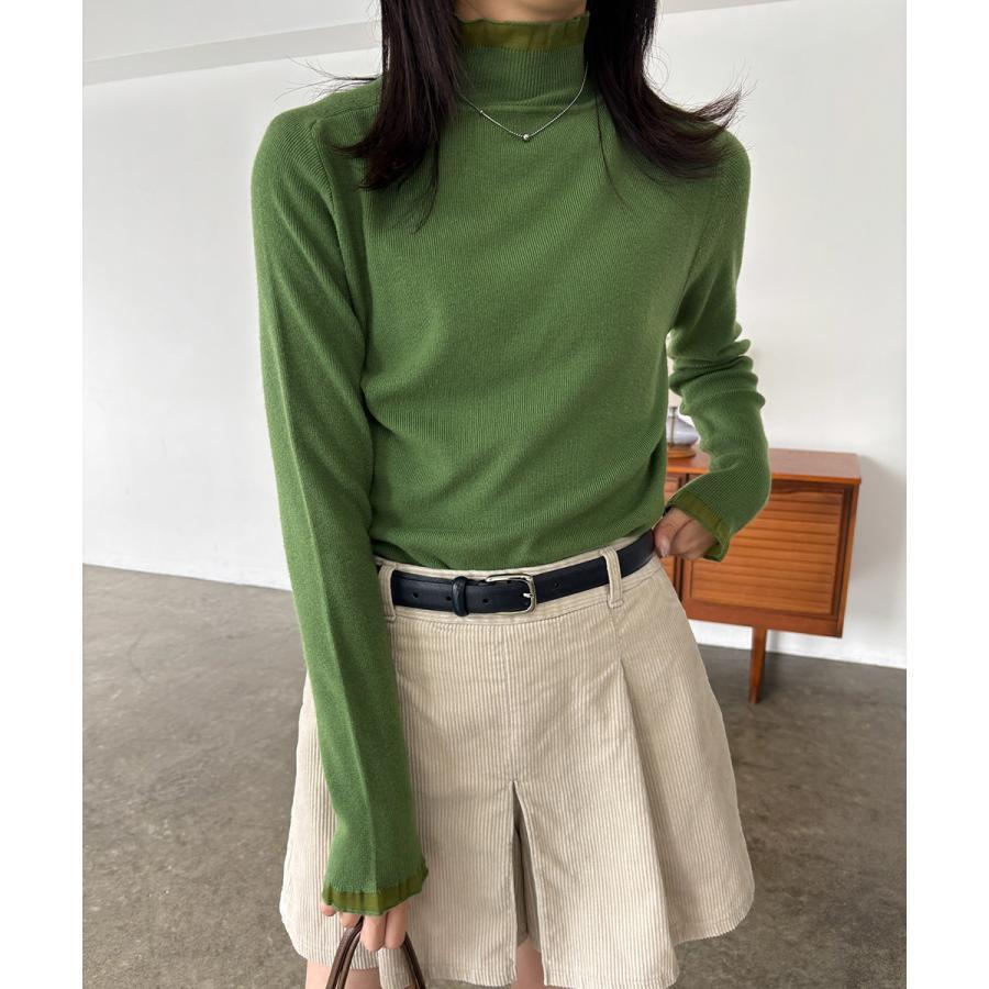 【送料無料・即納】 フリル ハイネック ニット トップス 長袖 ニットソー セーター プルオーバー 上品 きれいめ レディース 白 黒 茶 赤 緑 NS-2514