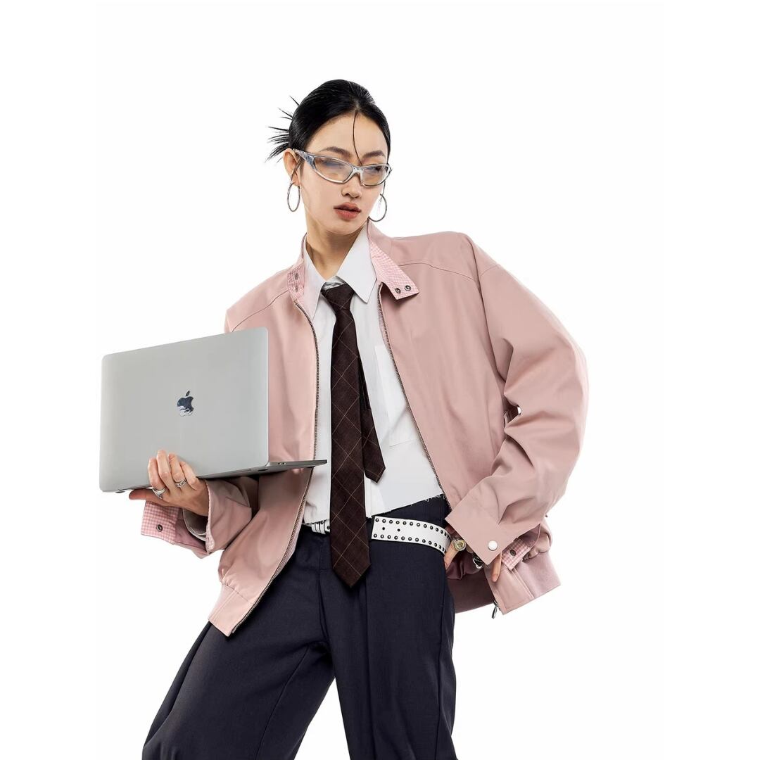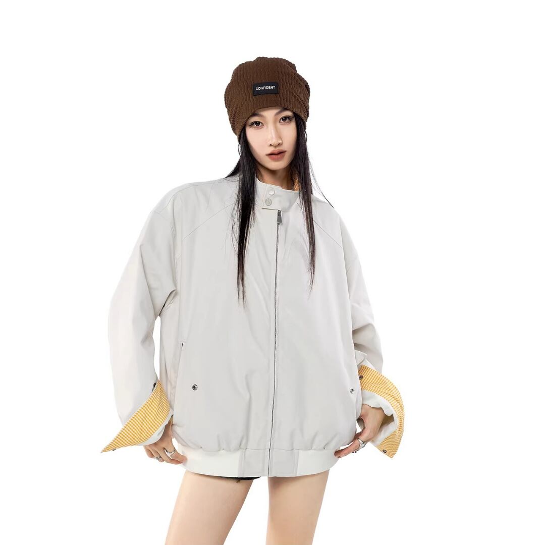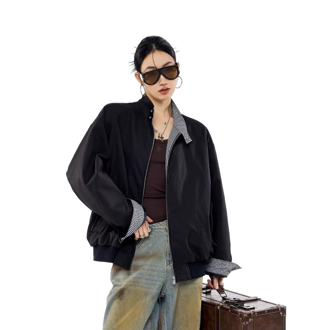 ジップアップ ジャケット チェック柄 ブルゾン ジャンパー スタンドカラー 長袖 カジュアル メンズライク ストリート ICH MODE レディース アウター 黒 ベージュ B-1434 【お取寄せ】
