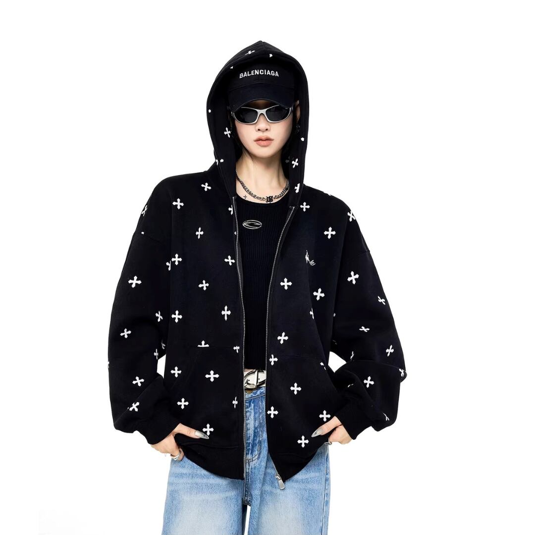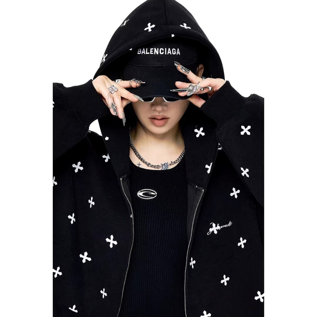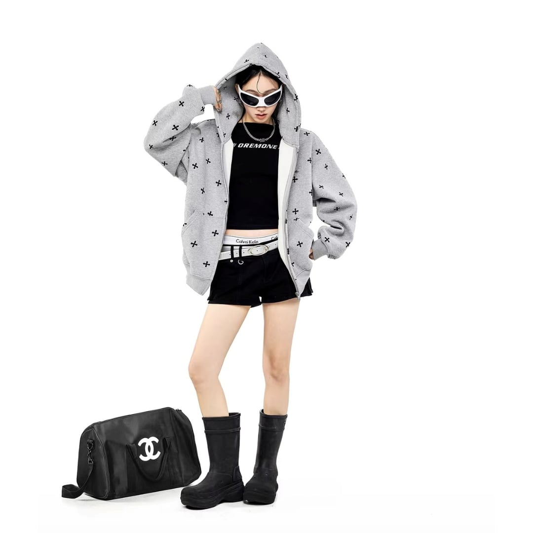 細かいクロス柄を全体に散りばめた、ストリートテイストのジップアップパーカー。