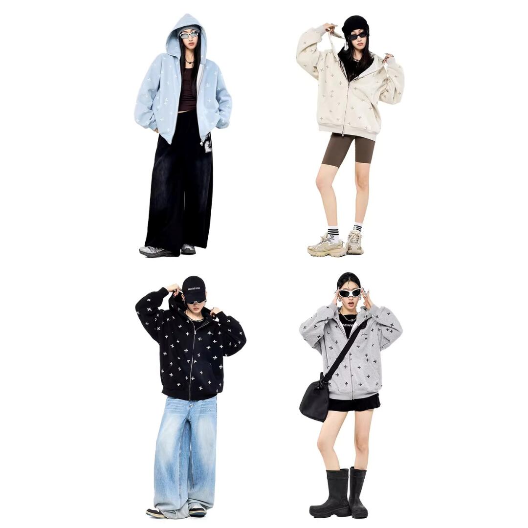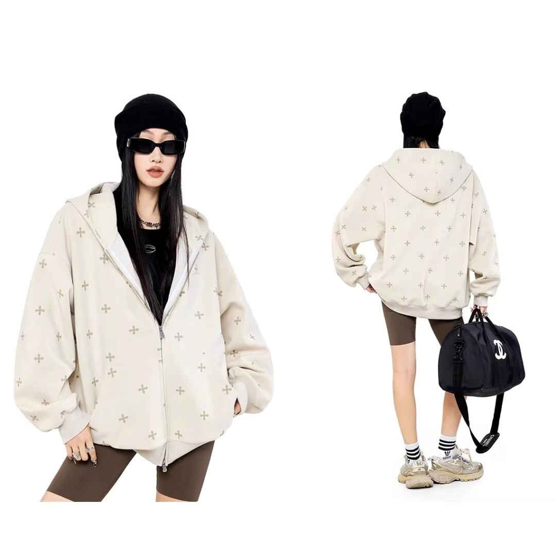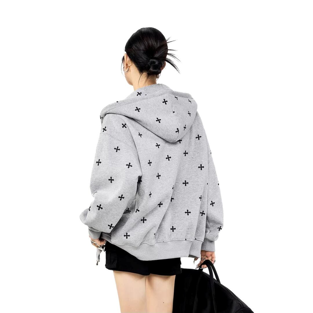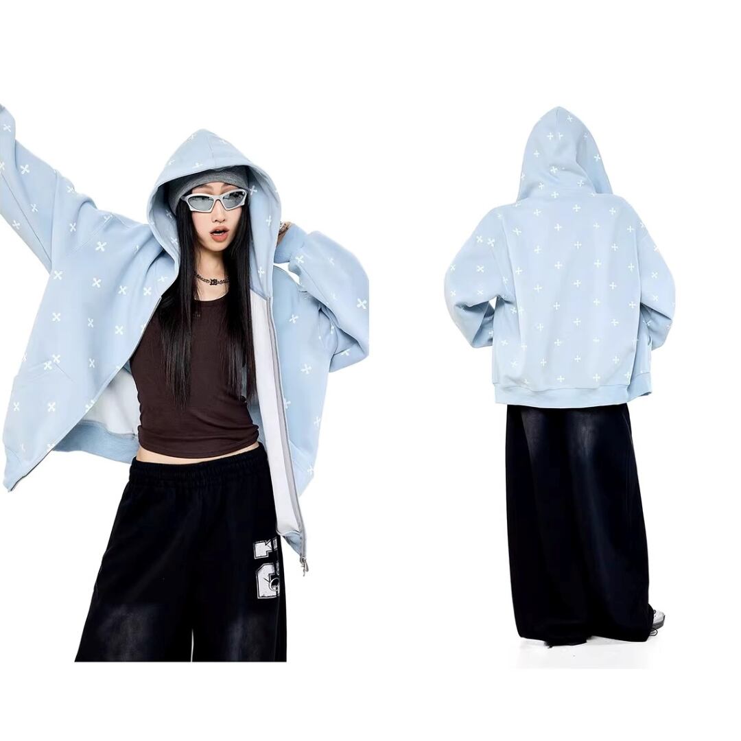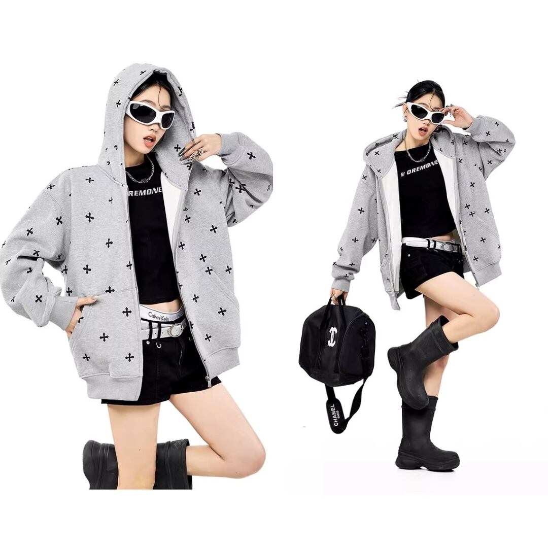 クロス柄 ジップパーカー フーディー 長袖 ジップアップ ロゴ フード付き スウェット ゆったり ルーズ オーバーサイズ カジュアル メンズライク ストリート ICH MODE レディース トップス 黒 青 水色 ベージュ B-1435 【お取寄せ】