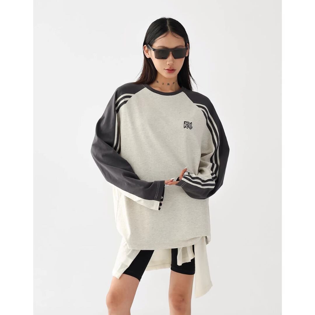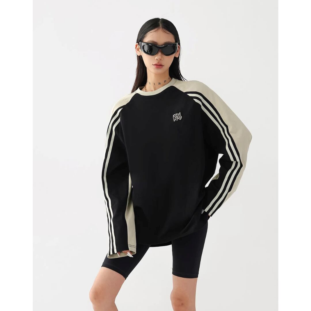 配色デザインと袖の三本ラインが印象的なラグラン長袖Tシャツ。