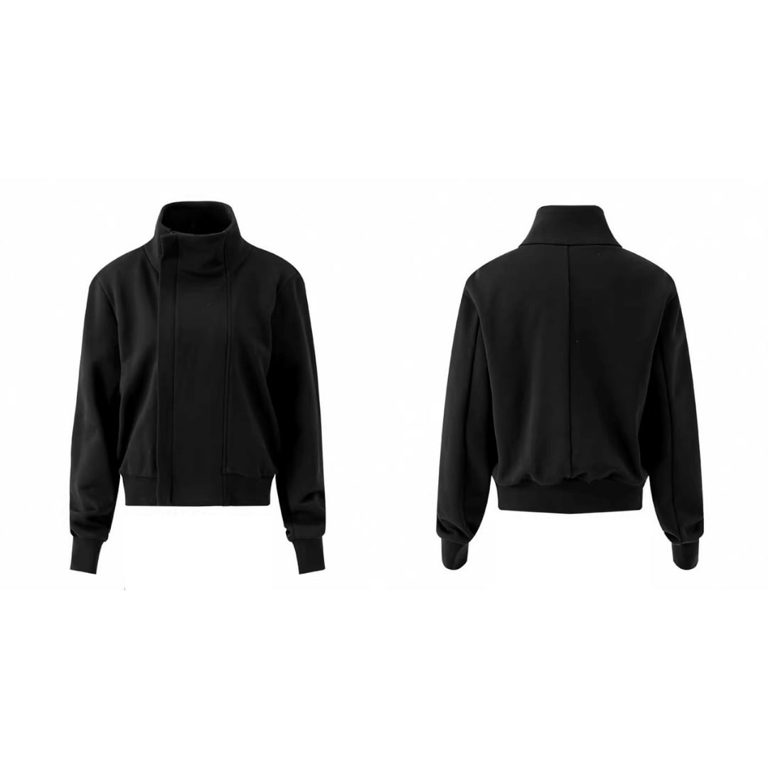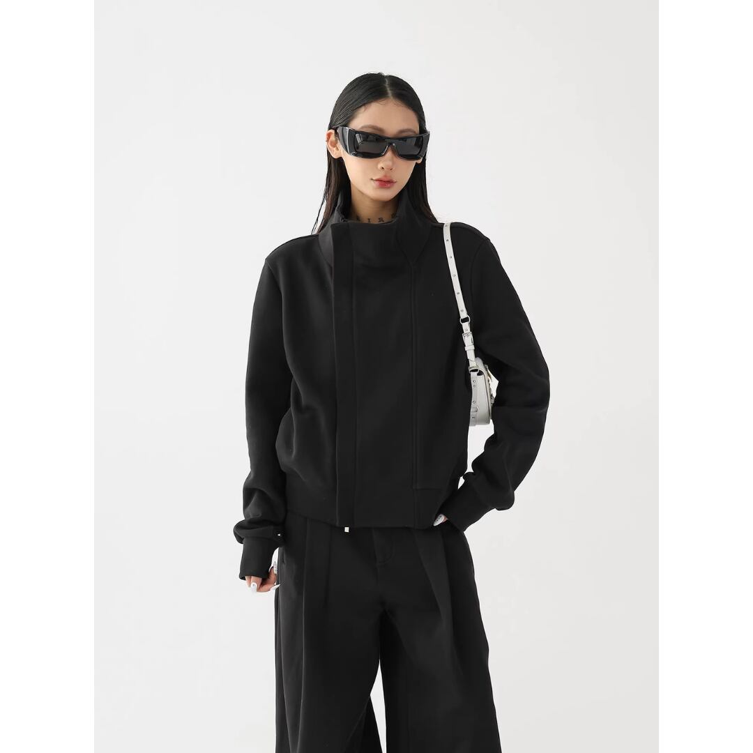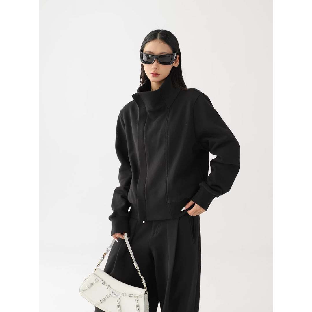 ハイカラー スウェット ジャケット ブルゾン スタンドカラー ハイネック ショート丈 アシンメトリー ジャンパー セットアップ カジュアル ストリート モード Acestudios レディース アウター 黒 B-1442 【お取寄せ】