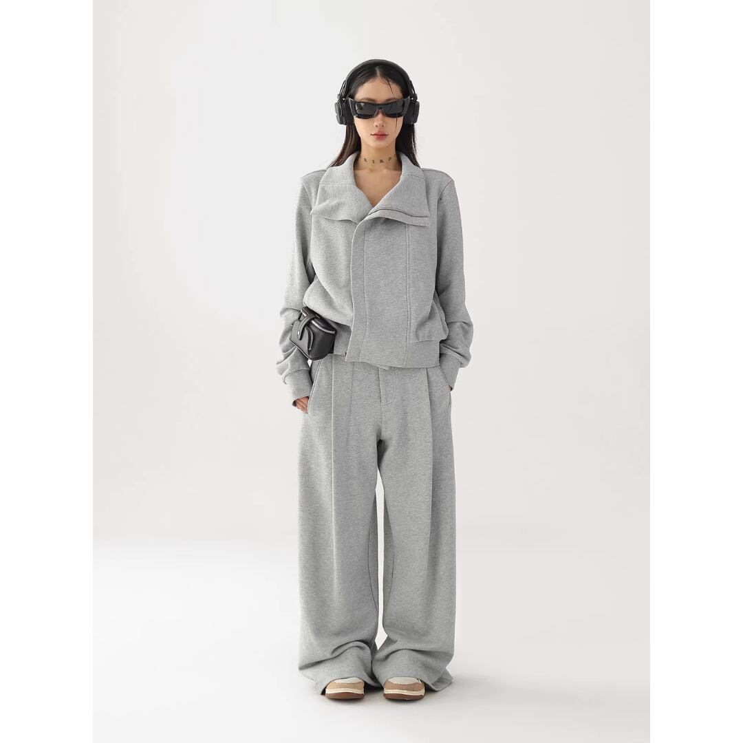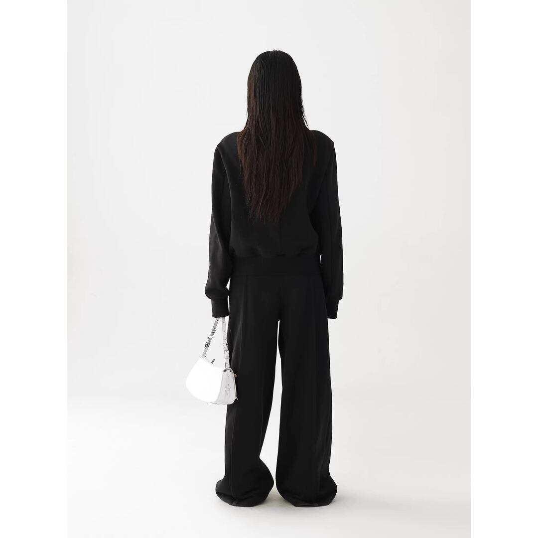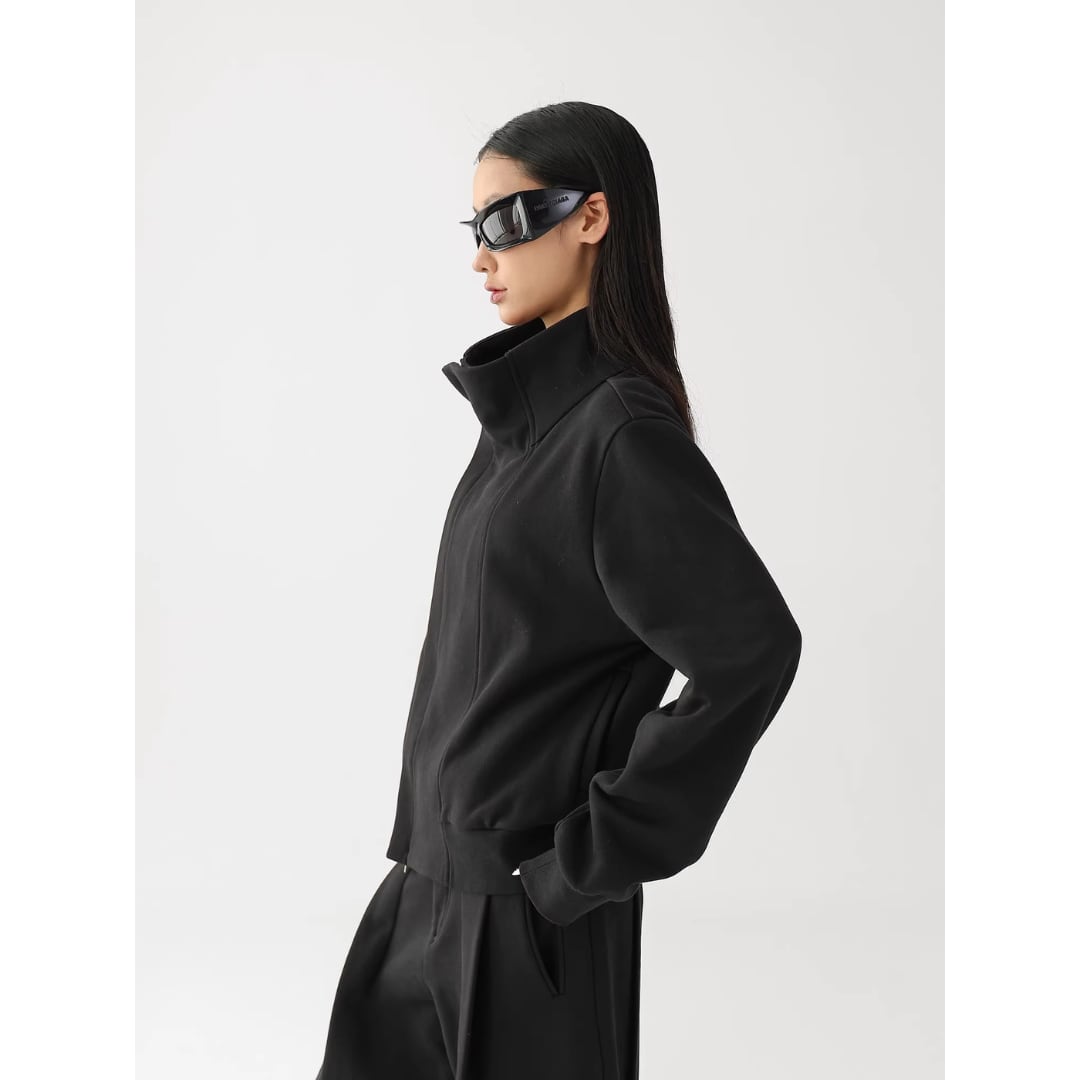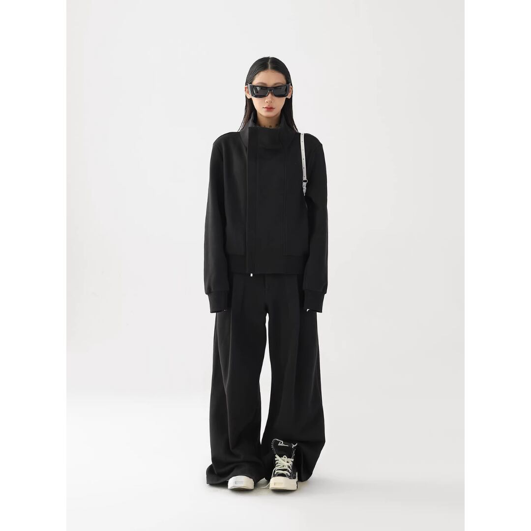 ハイカラー スウェット ジャケット ブルゾン スタンドカラー ハイネック ショート丈 アシンメトリー ジャンパー セットアップ カジュアル ストリート モード Acestudios レディース アウター 黒 B-1442 【お取寄せ】