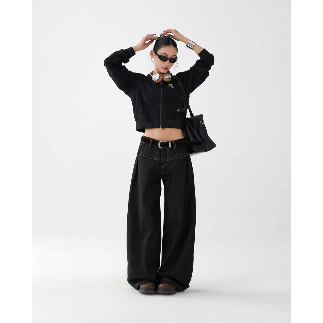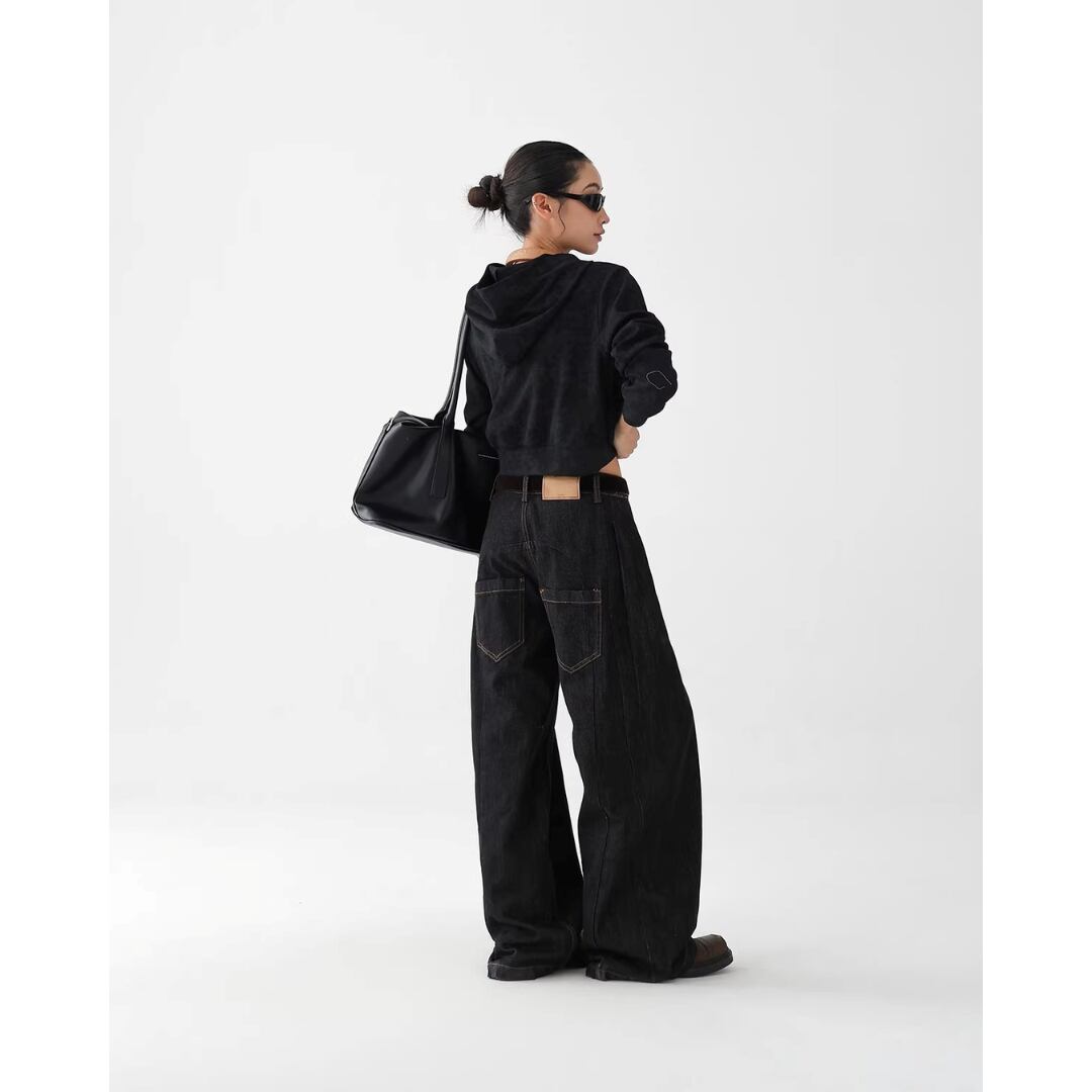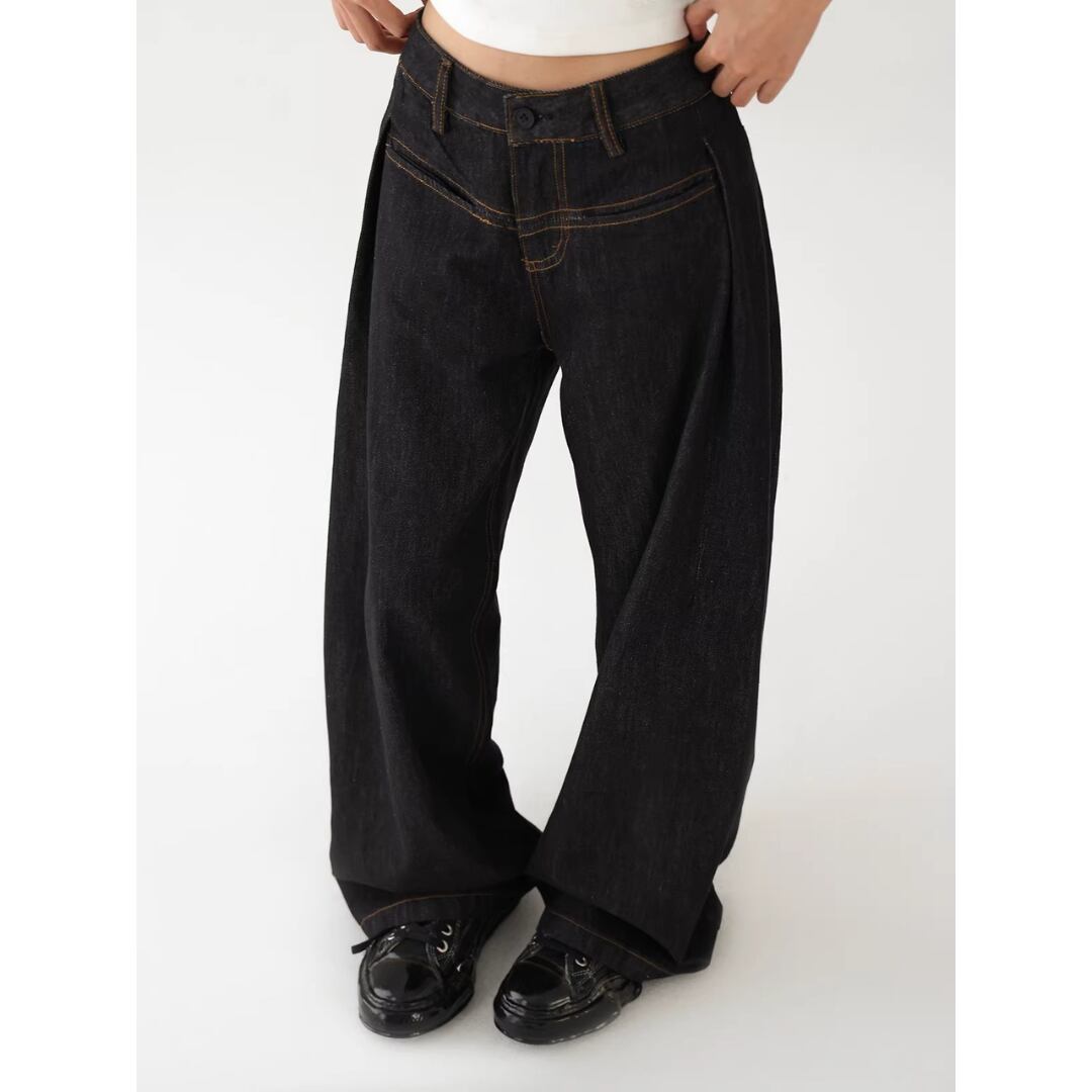 デニムパンツ ワイドレッグ ジーンズ ジーパン ストレート ローポケットデザイン カジュアル メンズライク ストリート レディース ボトムス 黒 B-1448 【お取寄せ】