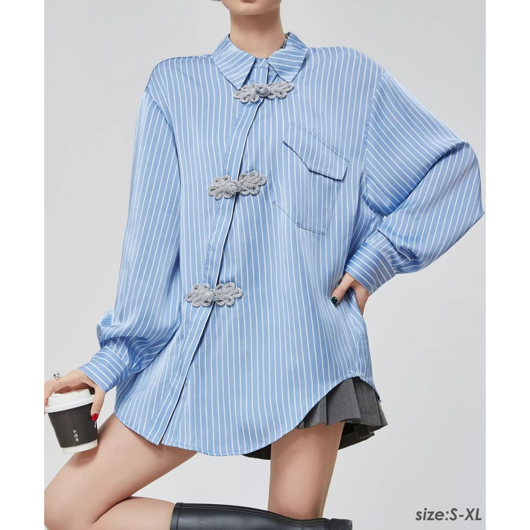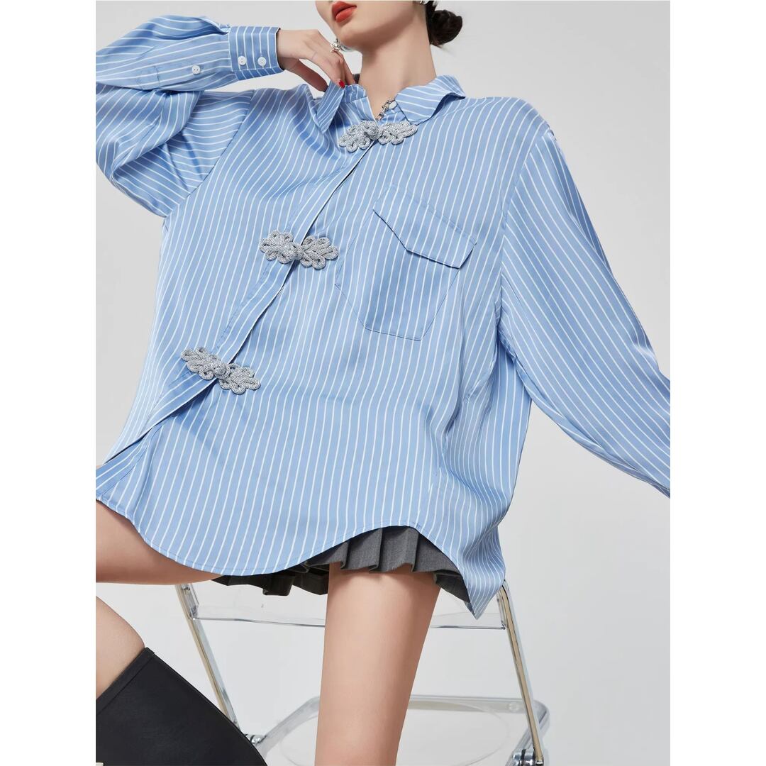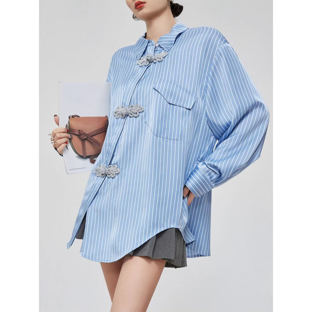 チャイナボタンデザイン ストライプ シャツ ブラウス 長袖 斜め前立て ゆったり カジュアル きれいめ レディース トップス 青 水色 B-1450 【お取寄せ】