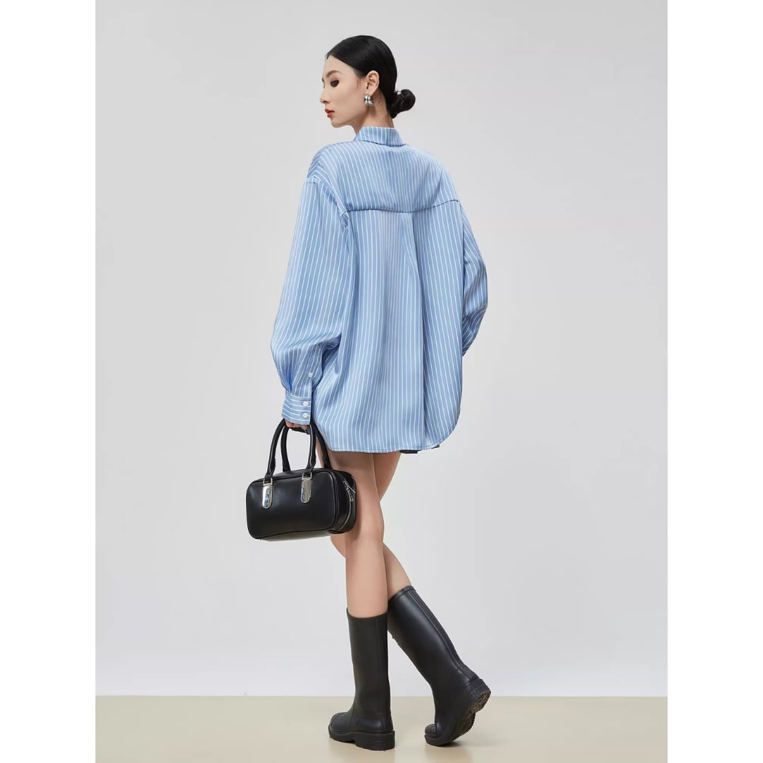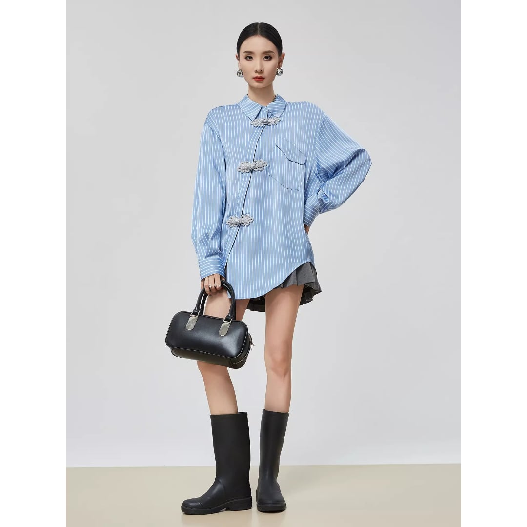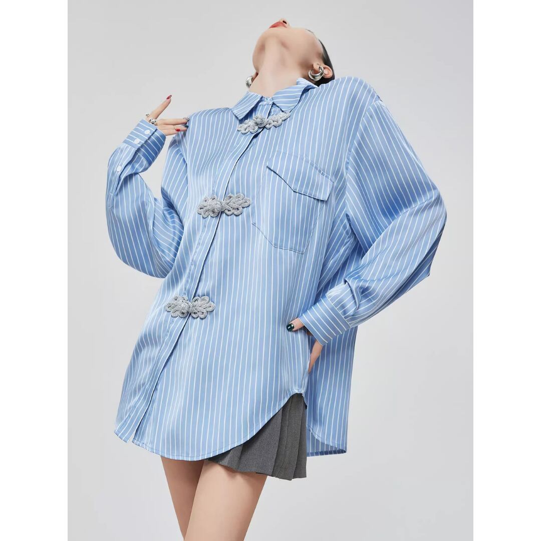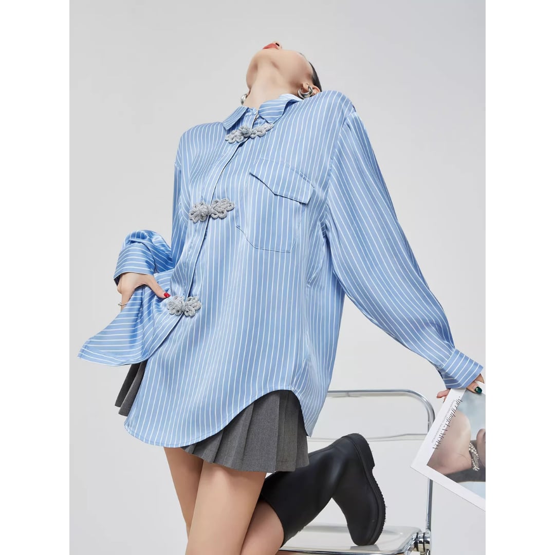 チャイナボタンデザイン ストライプ シャツ ブラウス 長袖 斜め前立て ゆったり カジュアル きれいめ レディース トップス 青 水色 B-1450 【お取寄せ】