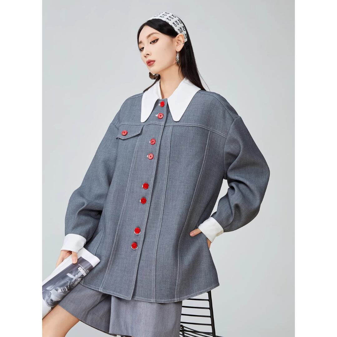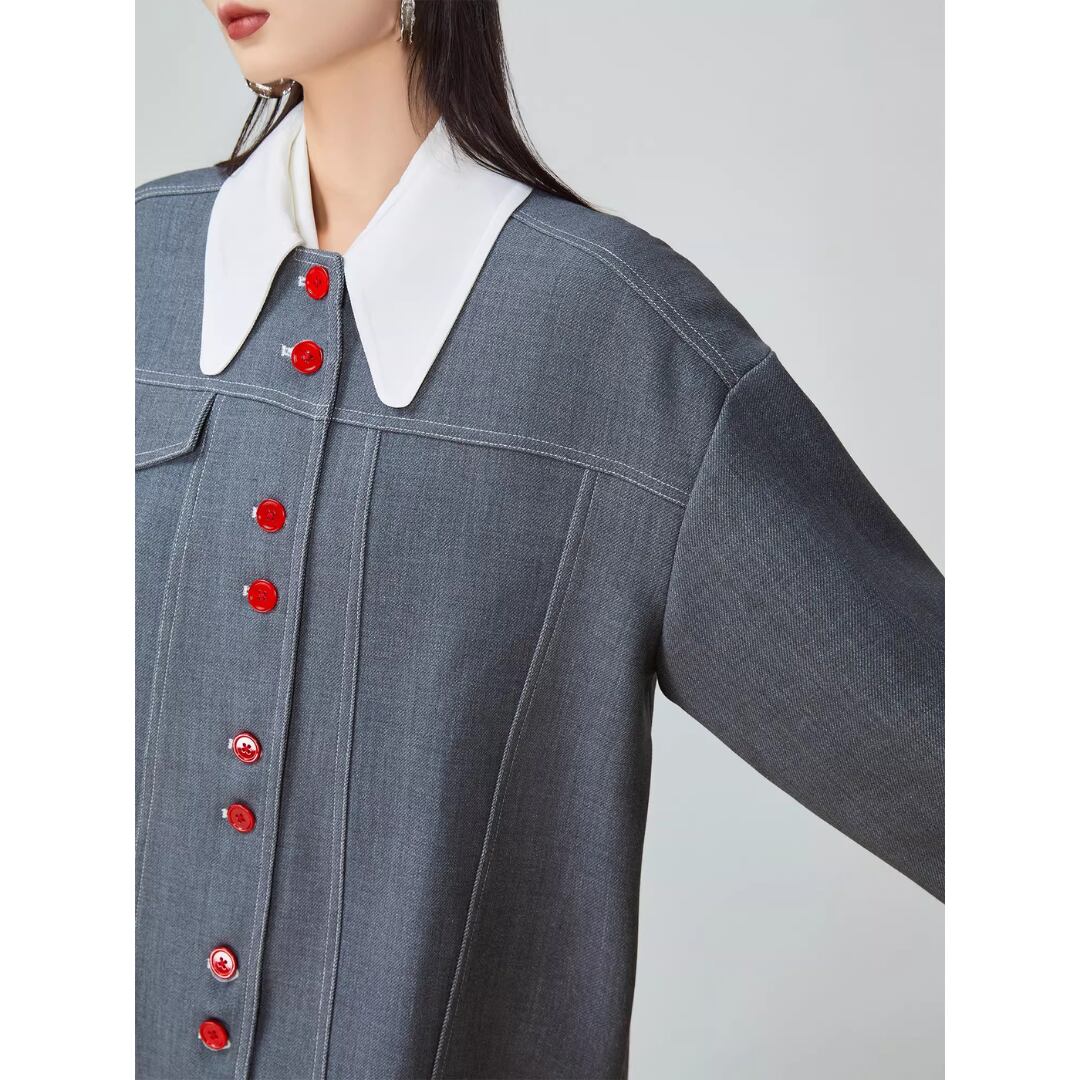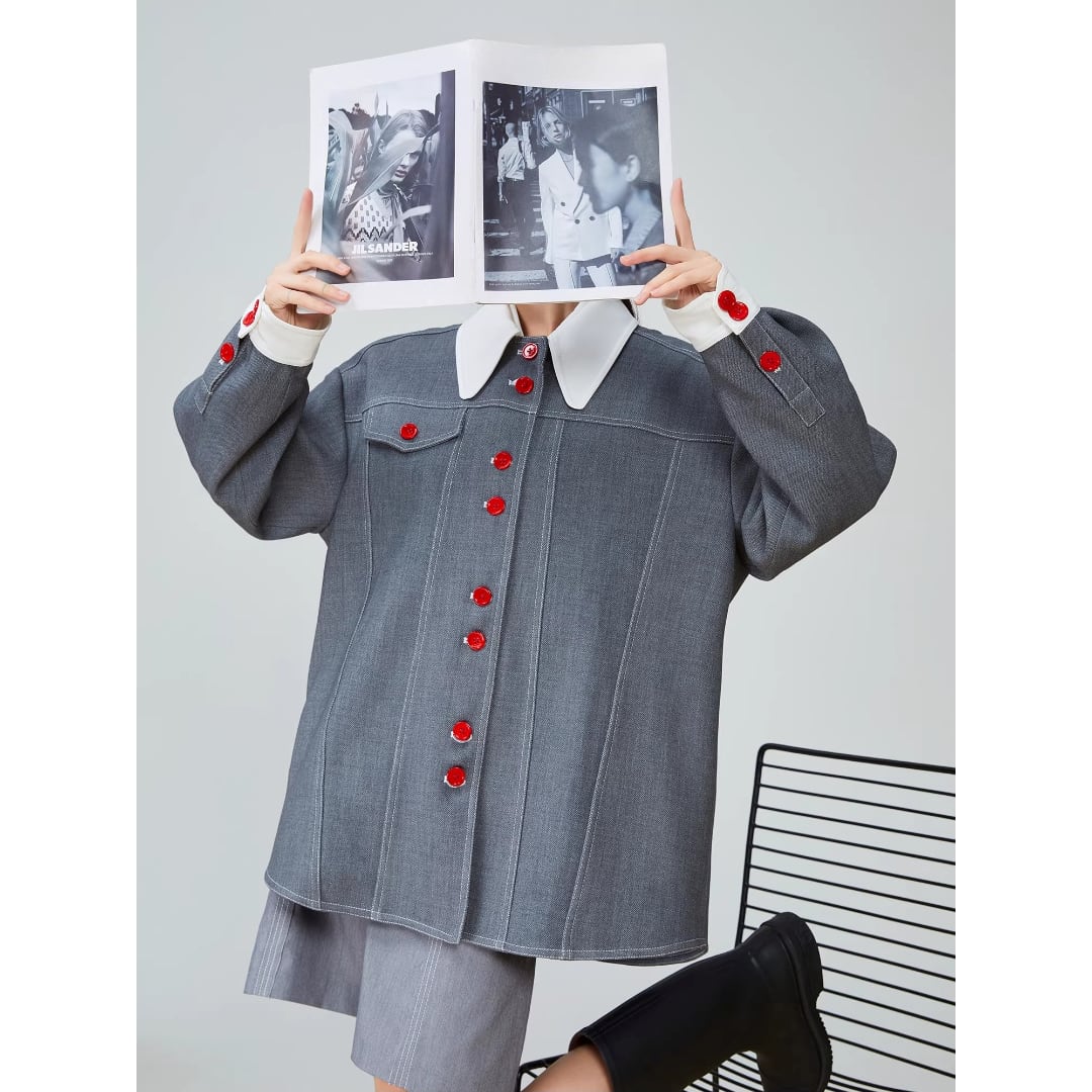 落ち着いたグレーカラーに、大きめの白襟と鮮やかなレッドボタンをあしらったデザインジャケット。