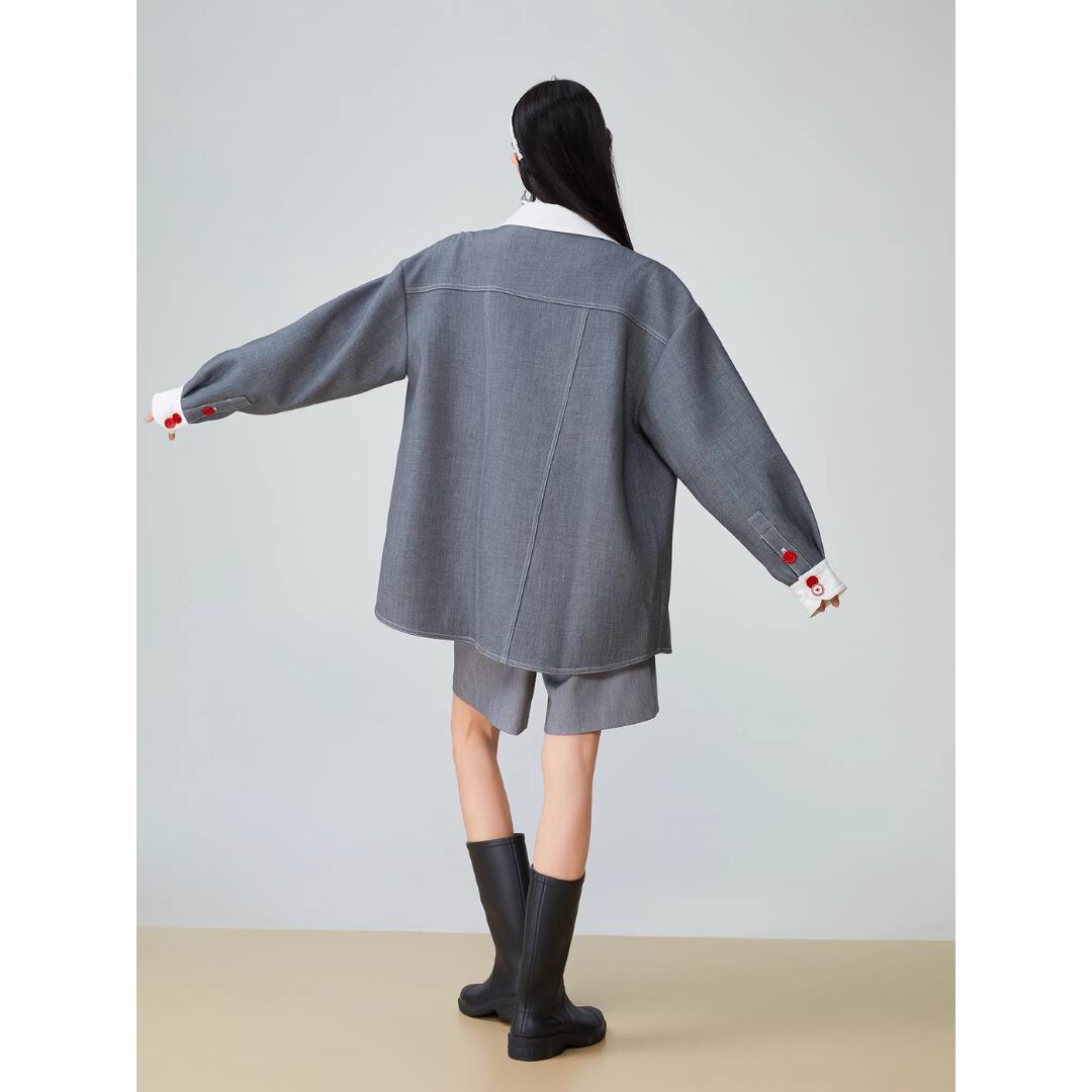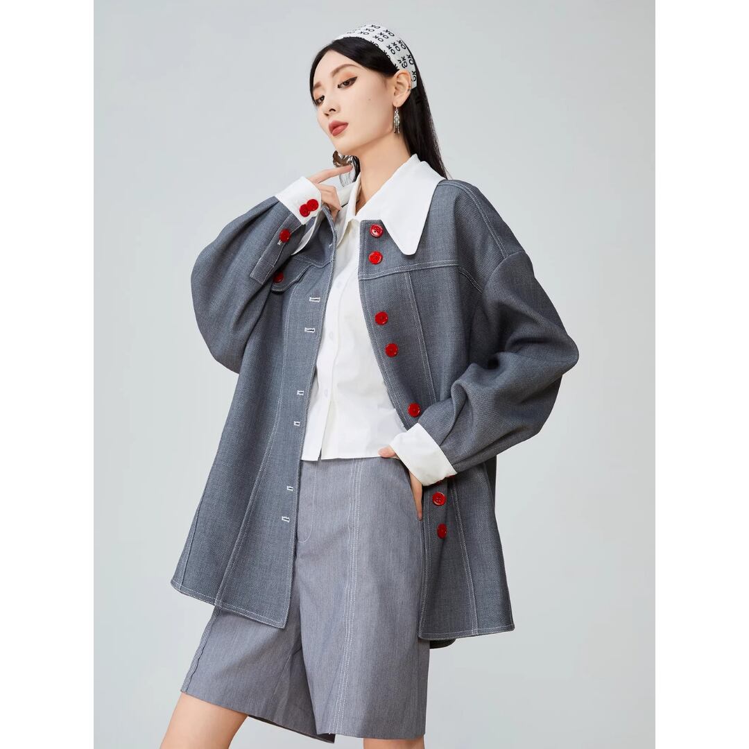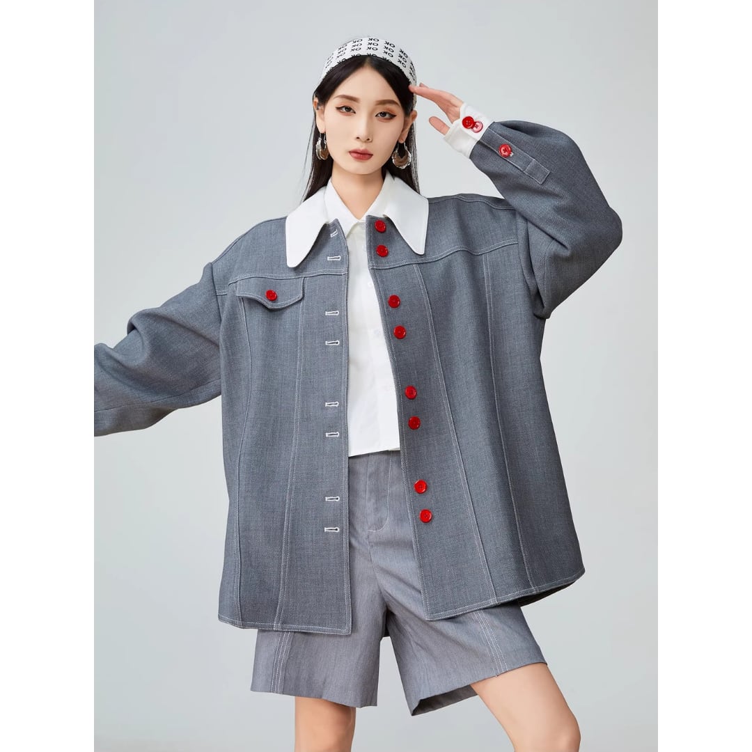 落ち着いたグレーカラーに、大きめの白襟と鮮やかなレッドボタンをあしらったデザインジャケット。