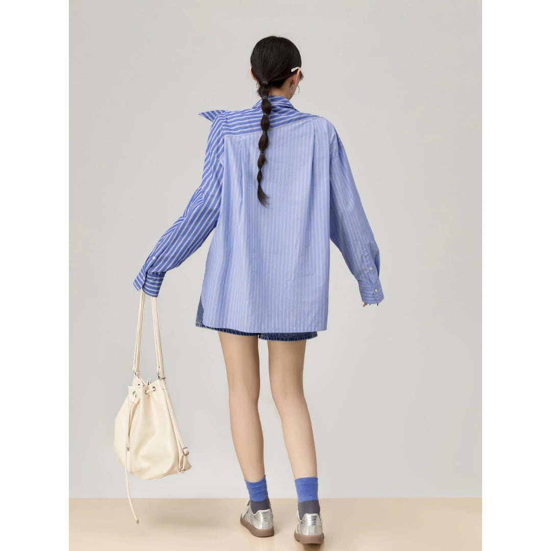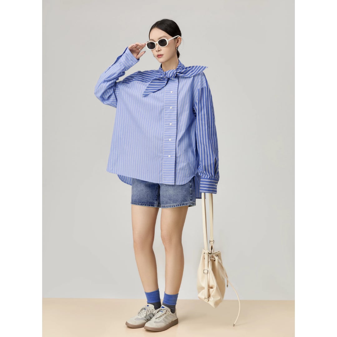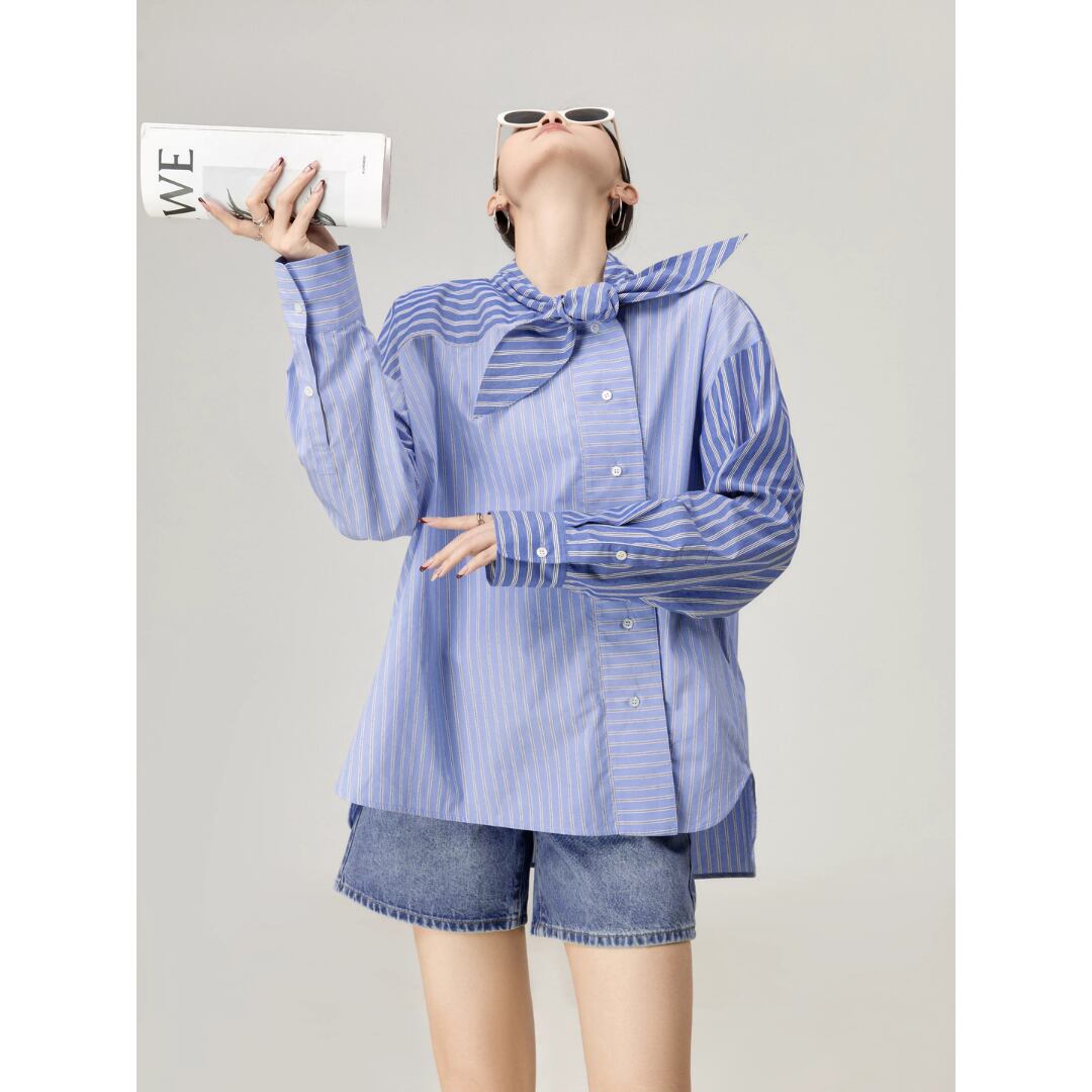 ストライプ シャツ ブラウス 長袖 リボンタイ ボウタイ 斜め前立て アシンメトリー 切替え デザインシャツ ゆったり カジュアル きれいめ GULILY レディース トップス 青 水色 B-1453 【お取寄せ】