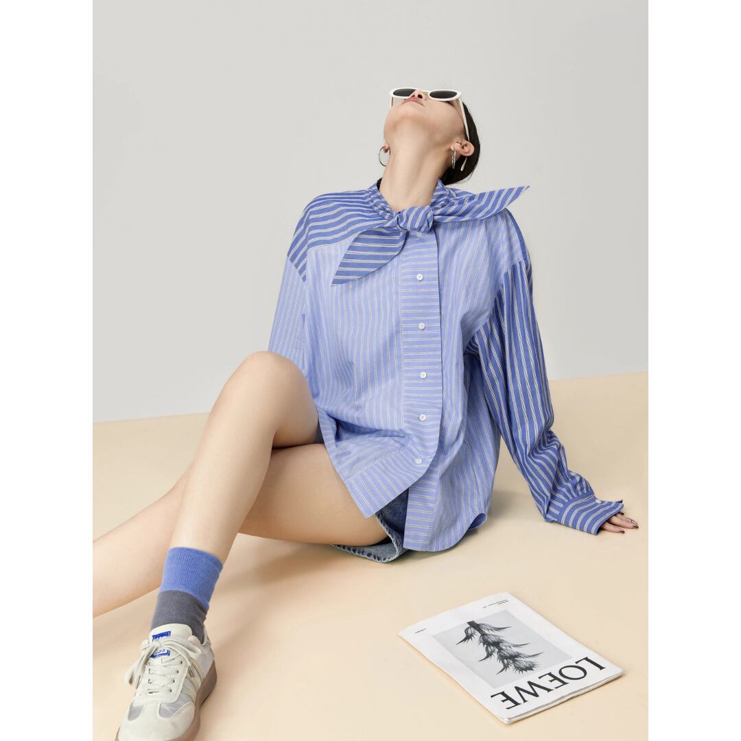 爽やかなブルーストライプに、リボンタイ付きの襟元が印象的なデザインシャツ。