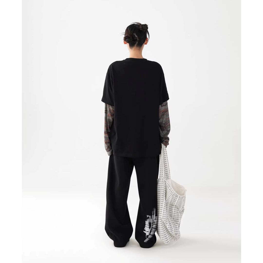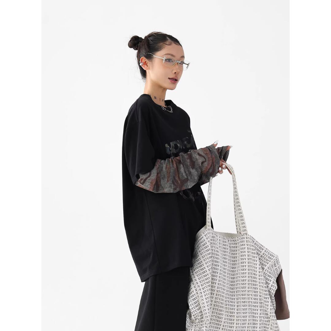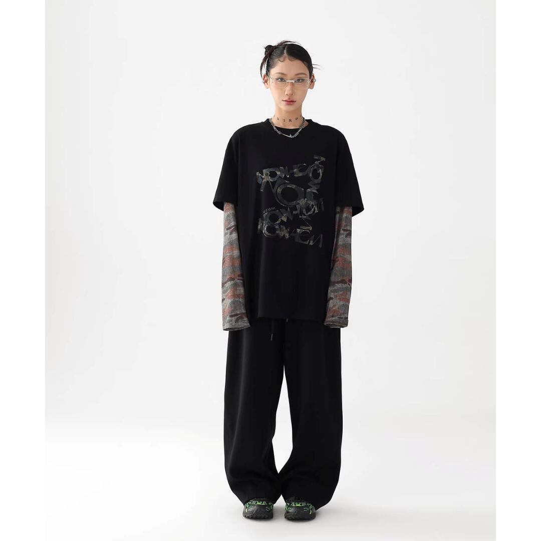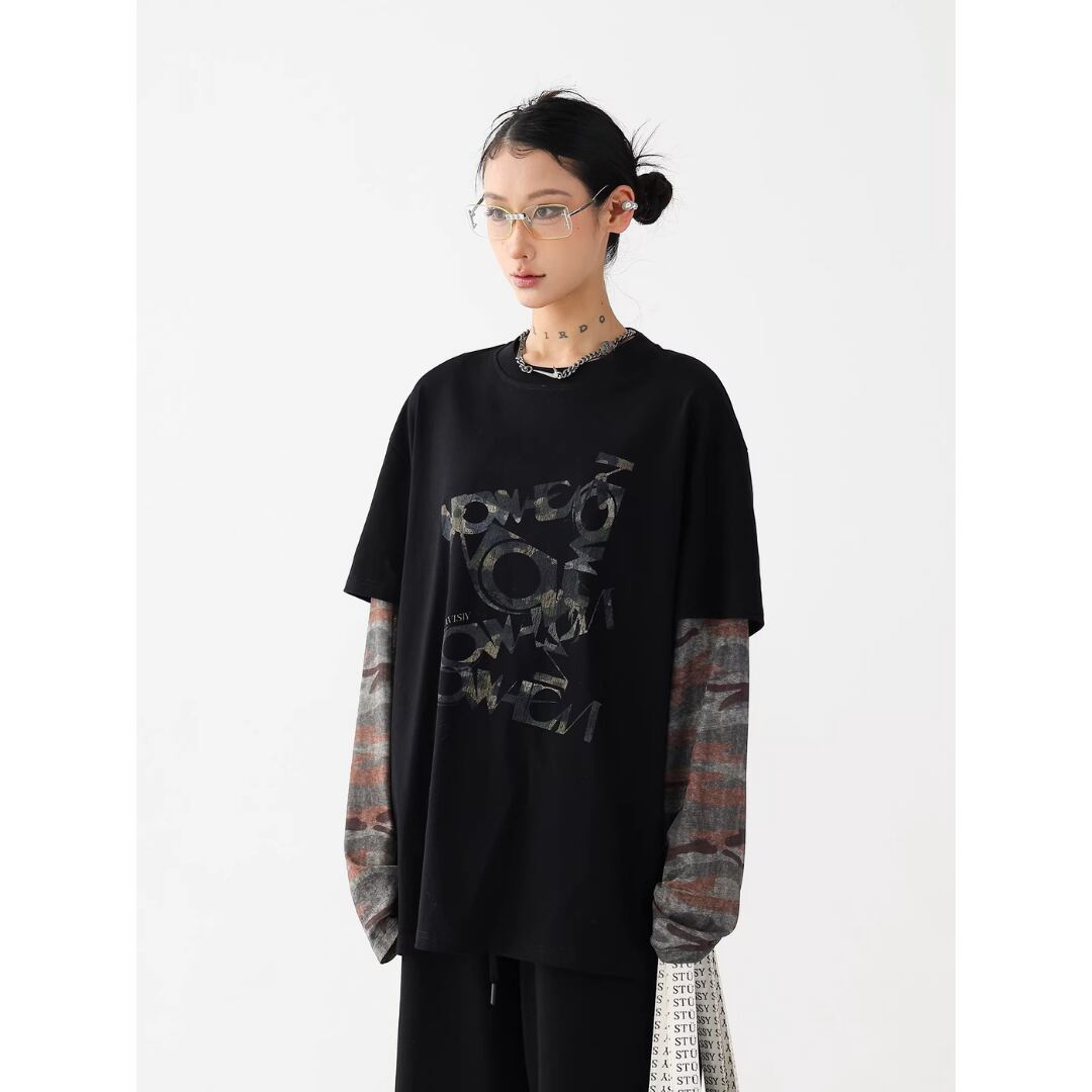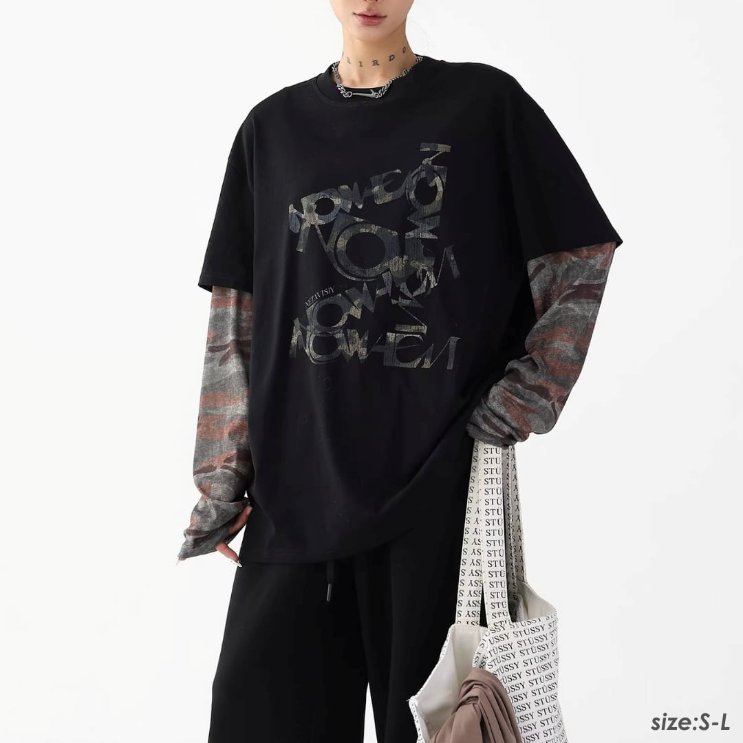 ロングスリーブ Tシャツ 長袖 フェイクレイヤード カモフラージュ 迷彩 ロゴ プリント ラウンドネック レイヤード風 ロンT カットソー プルオーバー ゆったり オーバーサイズ カジュアル ストリート NEZAVISIY レディース トップス 黒 B-1454 【お取寄せ】
