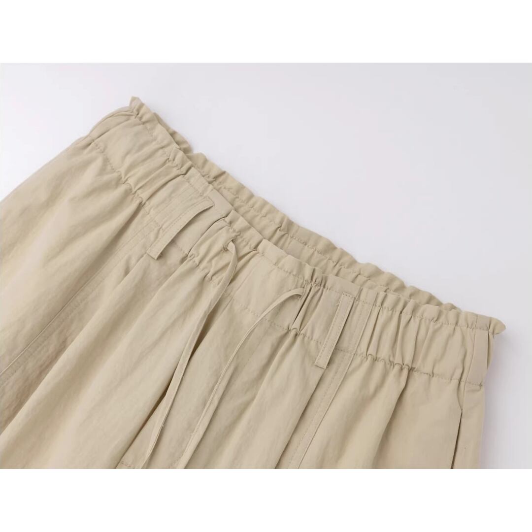 ウエストはゴム仕様にドローストリング付きで、体に合わせて快適に調整可能。