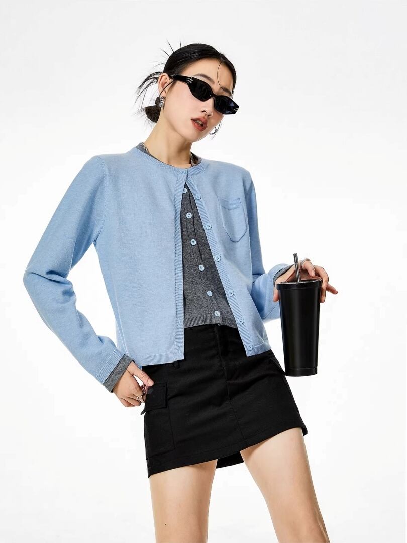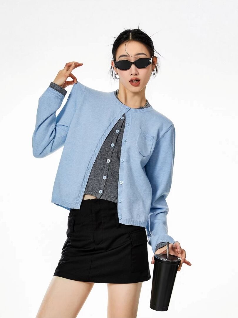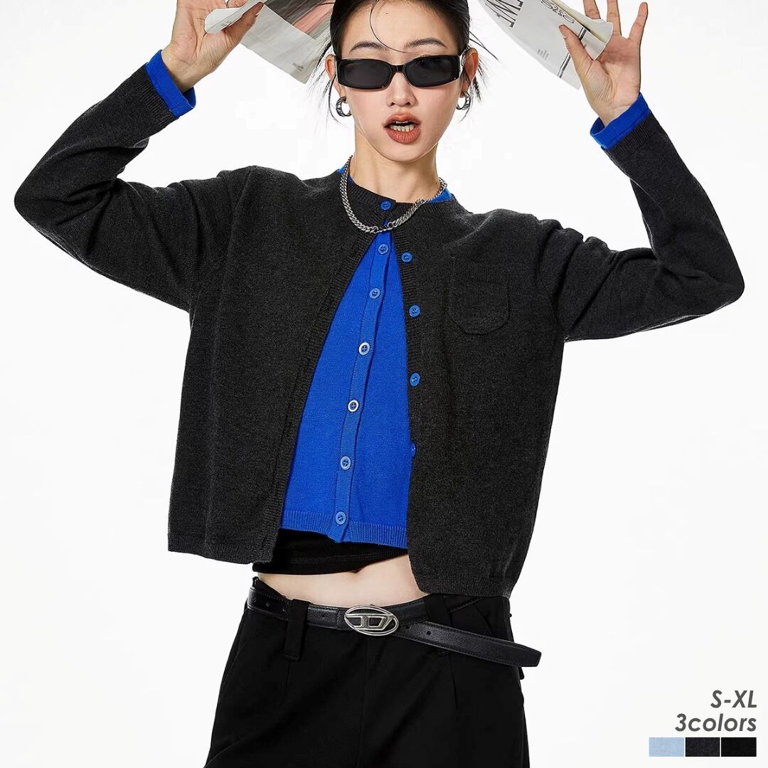 フェイクレイヤード ニット カーディガン ショート丈 ラウンドネック バイカラー レイヤード風 重ね着風 カジュアル きれいめ ICH MODE レディース トップス 黒 青 水色 B-1465 【お取寄せ】