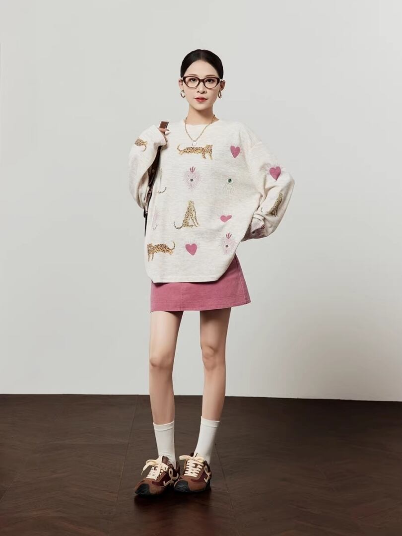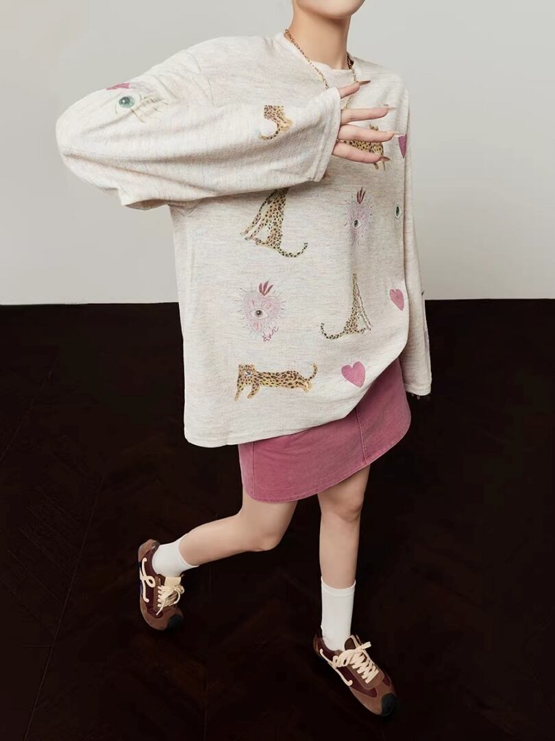 ロングスリーブ Tシャツ ハート レオパード 動物 アニマル アート プリント 長袖 ラウンドネック ロンT カットソー プルオーバー オーバーサイズ カジュアル love letter lady レディース トップス B-1471 【お取寄せ】
