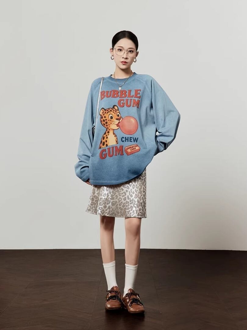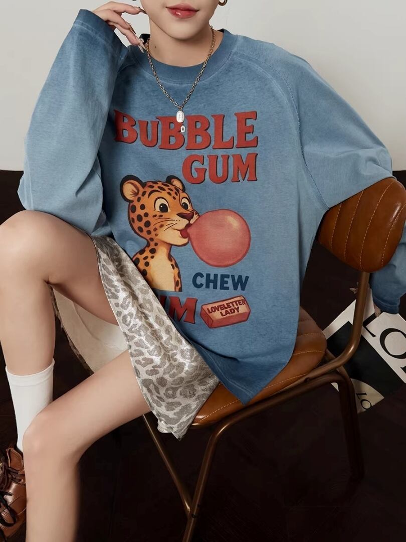 バブルガムを膨らませたレオパードプリントが目を引くロングスリーブTシャツ。