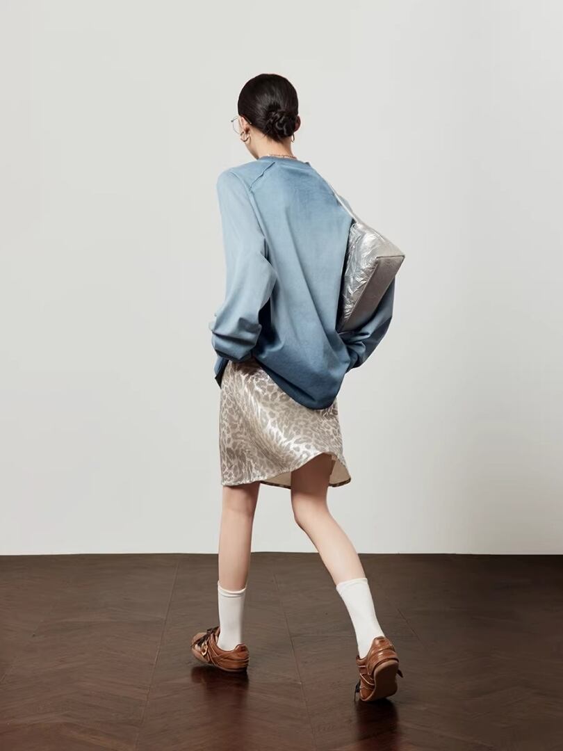 ロングスリーブ Tシャツ ヒョウ レオパード 動物 アニマル ロゴ プリント 長袖 ラグランスリーブ ラウンドネック ロンT カットソー プルオーバー オーバーサイズ カジュアル love letter lady レディース トップス 青 水色 B-1472 【お取寄せ】