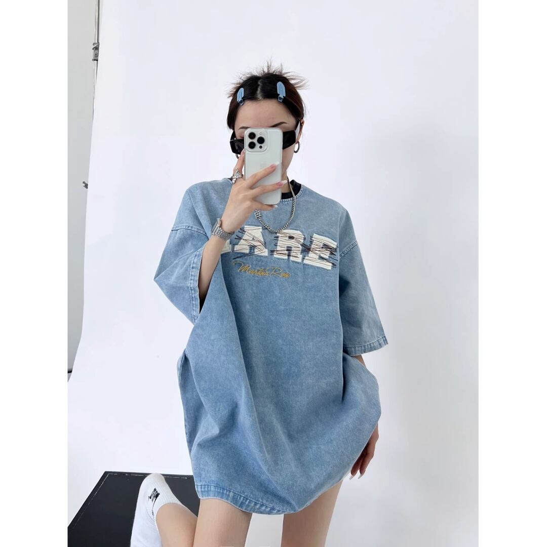 ロゴ 刺繍 Tシャツ 薄手デニム 半袖 ラウンドネック クルーネック カットソー プルオーバー ヴィンテージ風 オーバーサイズ ゆったり 体型カバー ビッグシルエット カジュアル メンズライク ストリート ユニセックス メンズ レディース トップス 青 B-1477 【お取寄せ】
