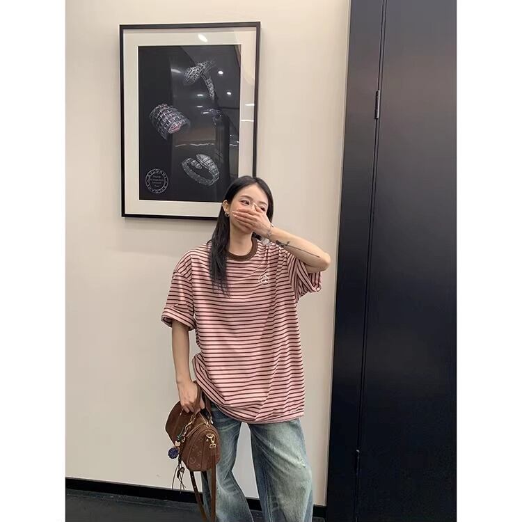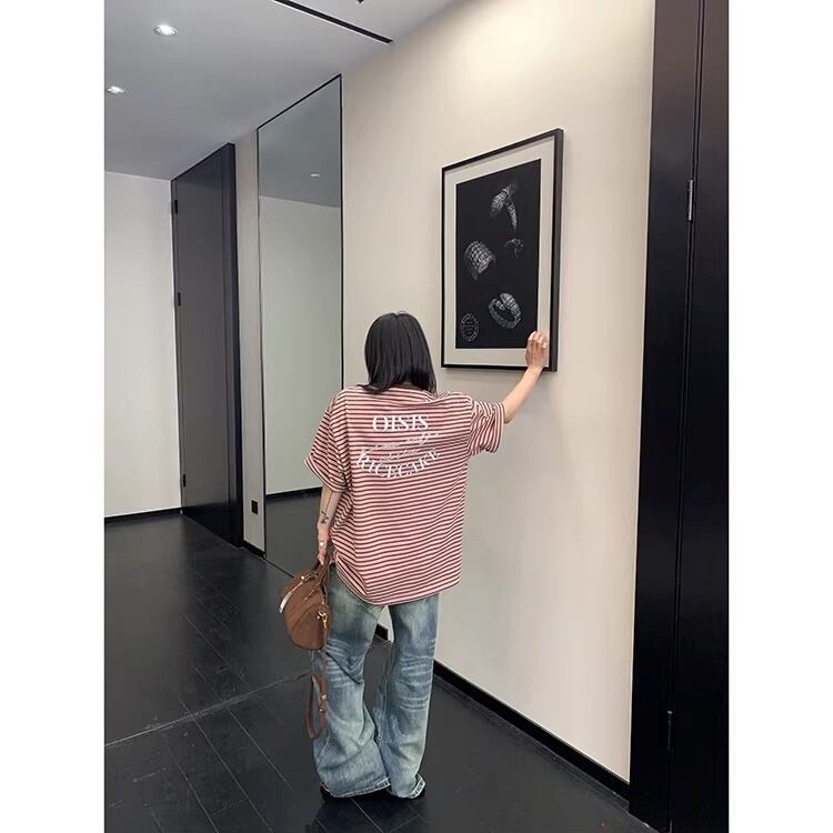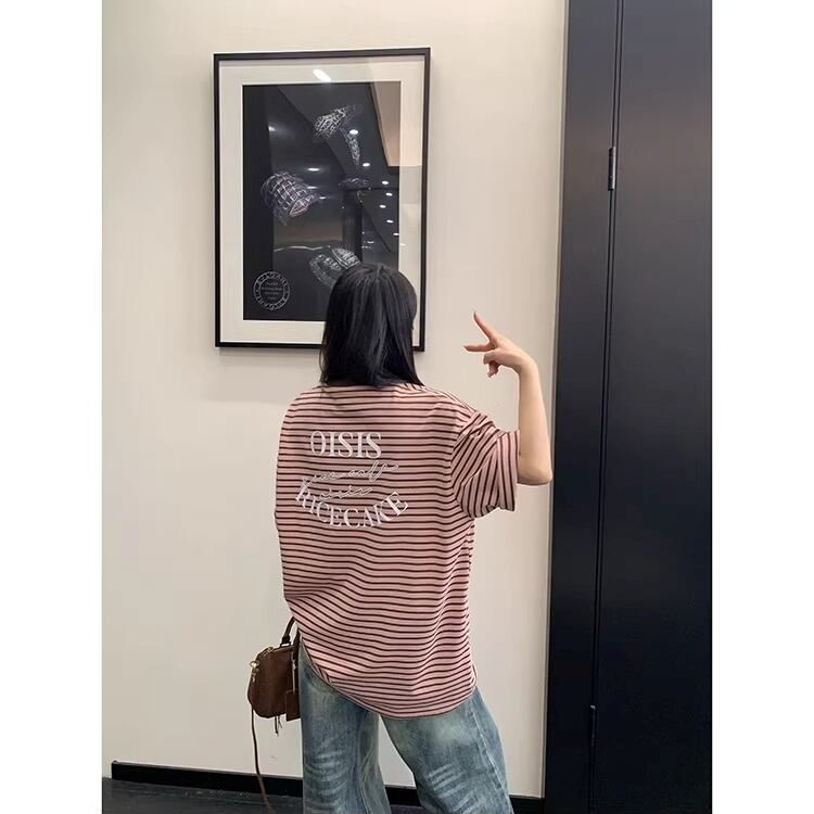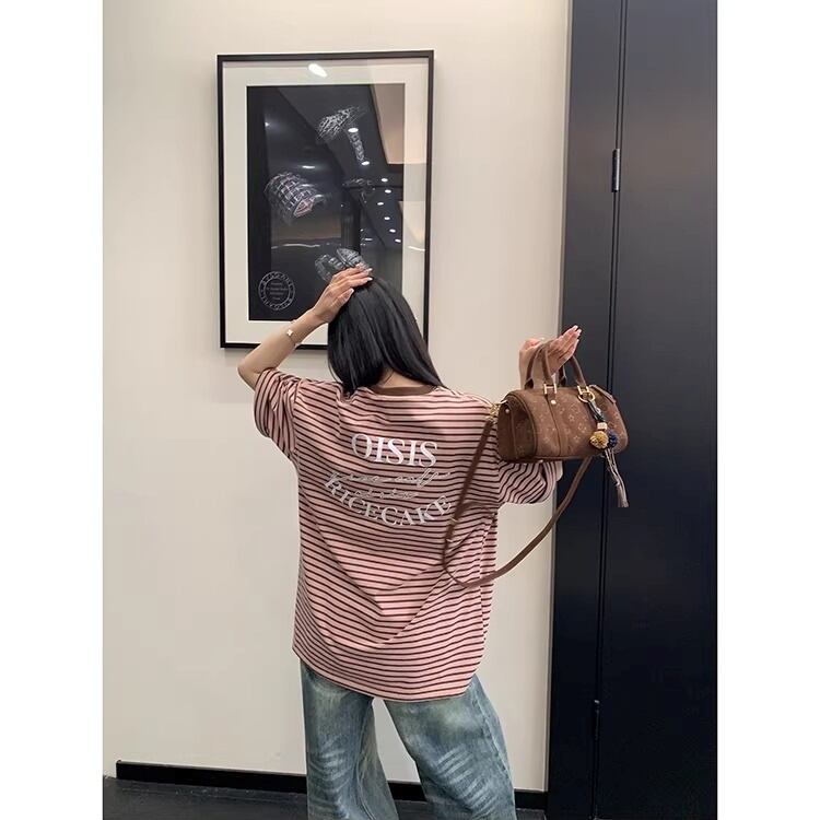 バックロゴ ボーダー Tシャツ 半袖 バックプリント ラウンドネック クルーネック カットソー プルオーバー オーバーサイズ ゆったり 体型カバー ビッグシルエット カジュアル メンズライク ストリート OISIS レディース トップス B-1478 【お取寄せ】