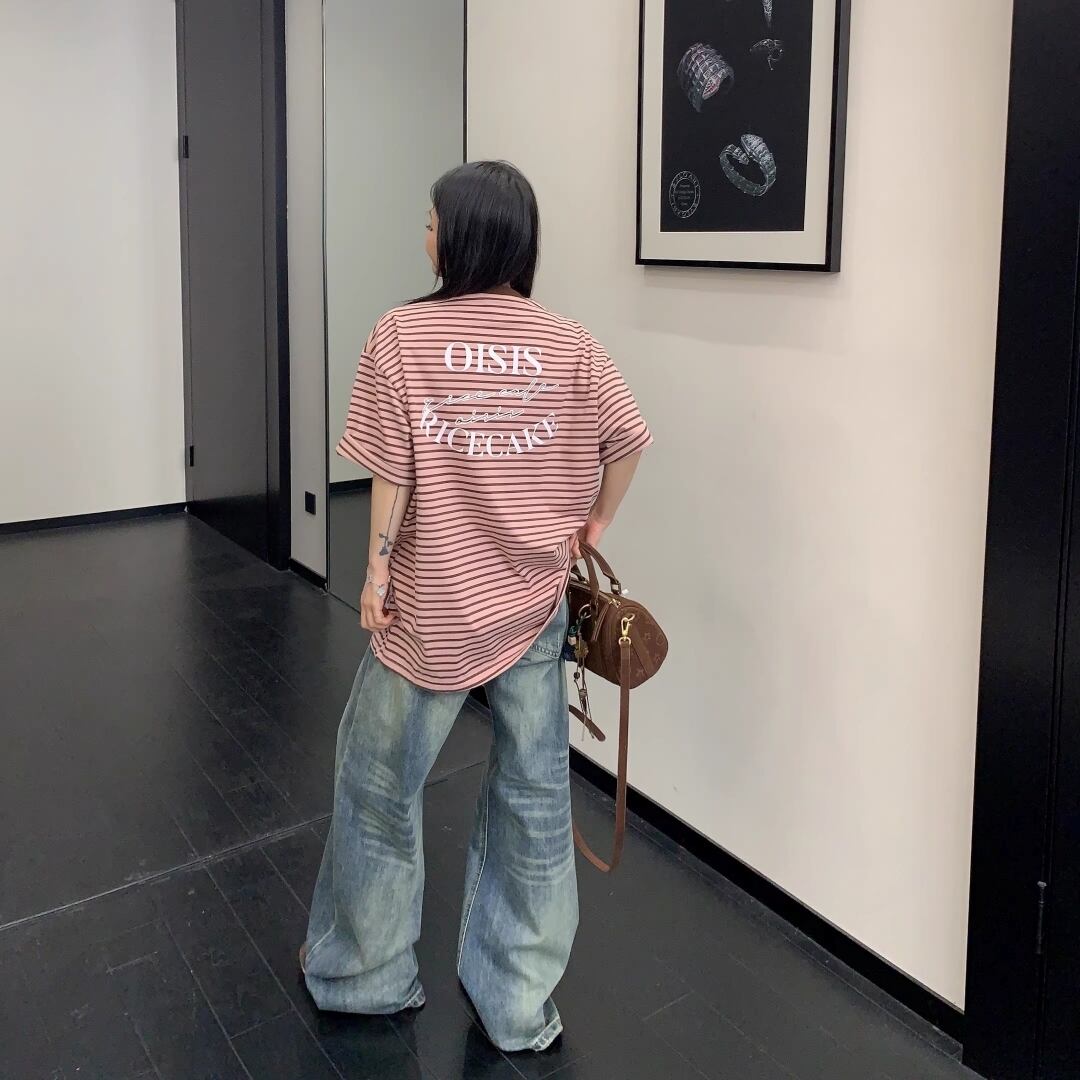 やわらかな配色のボーダーに、背面の大きなロゴプリントが印象的なTシャツ。