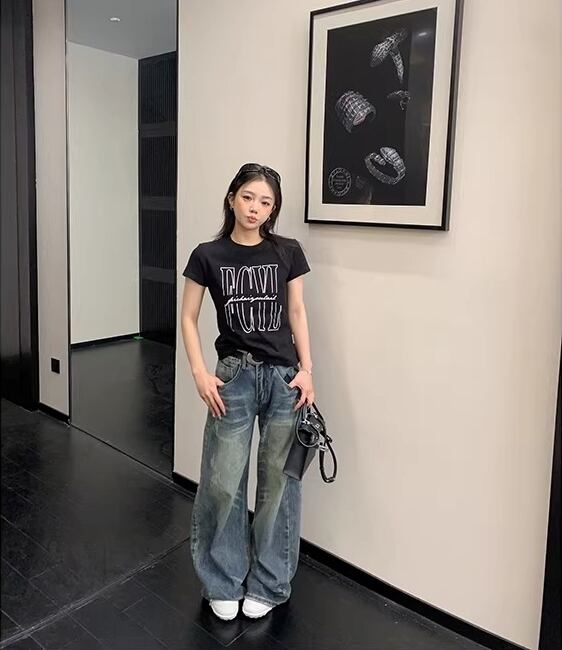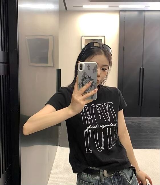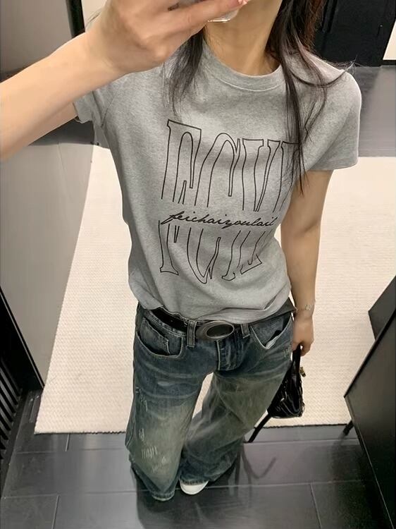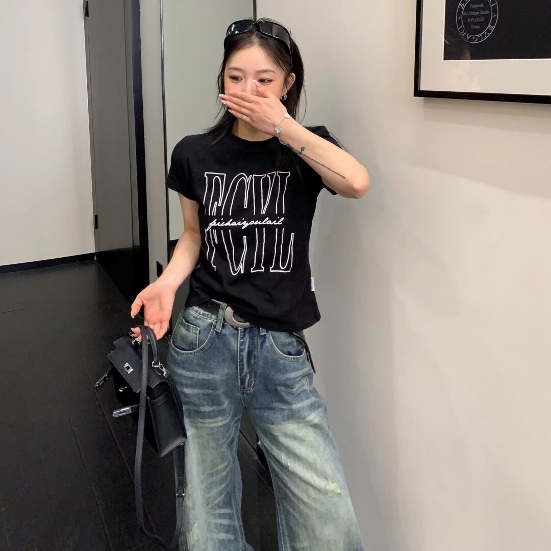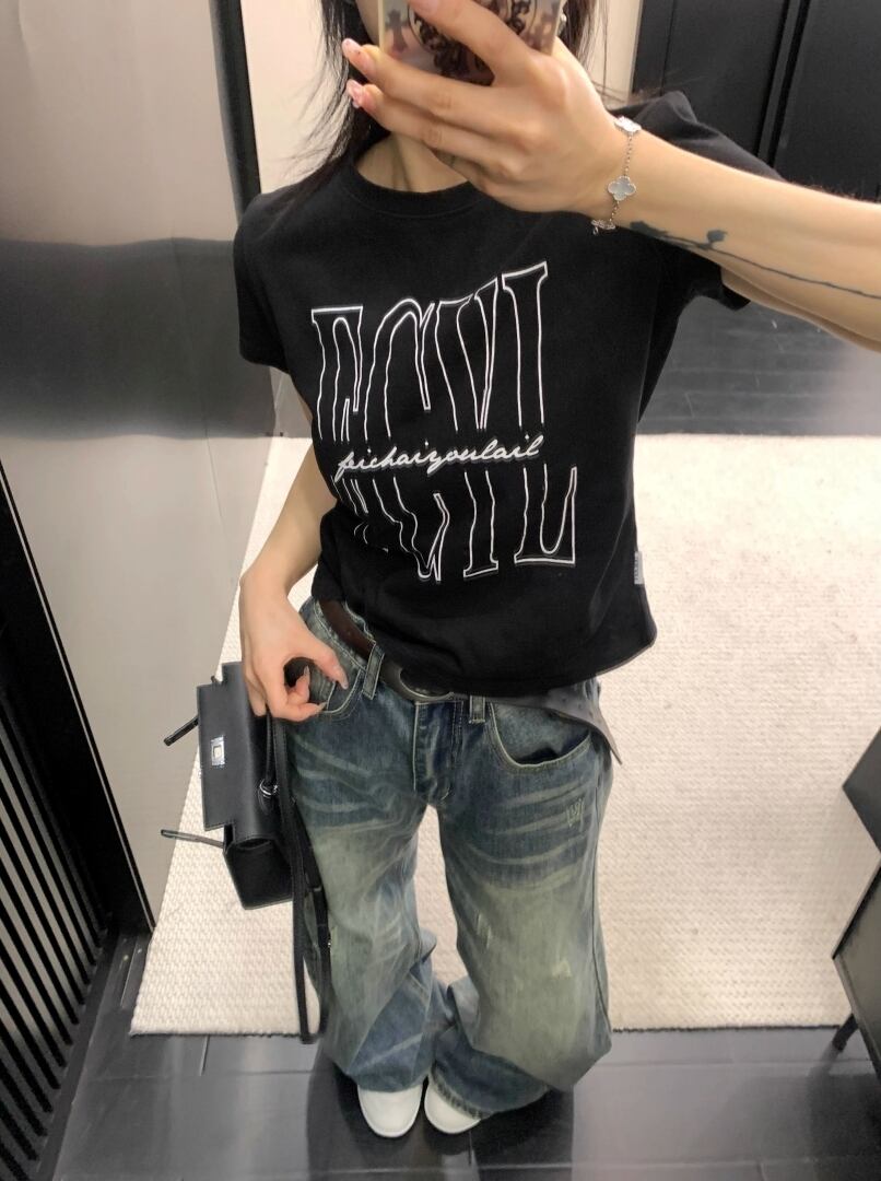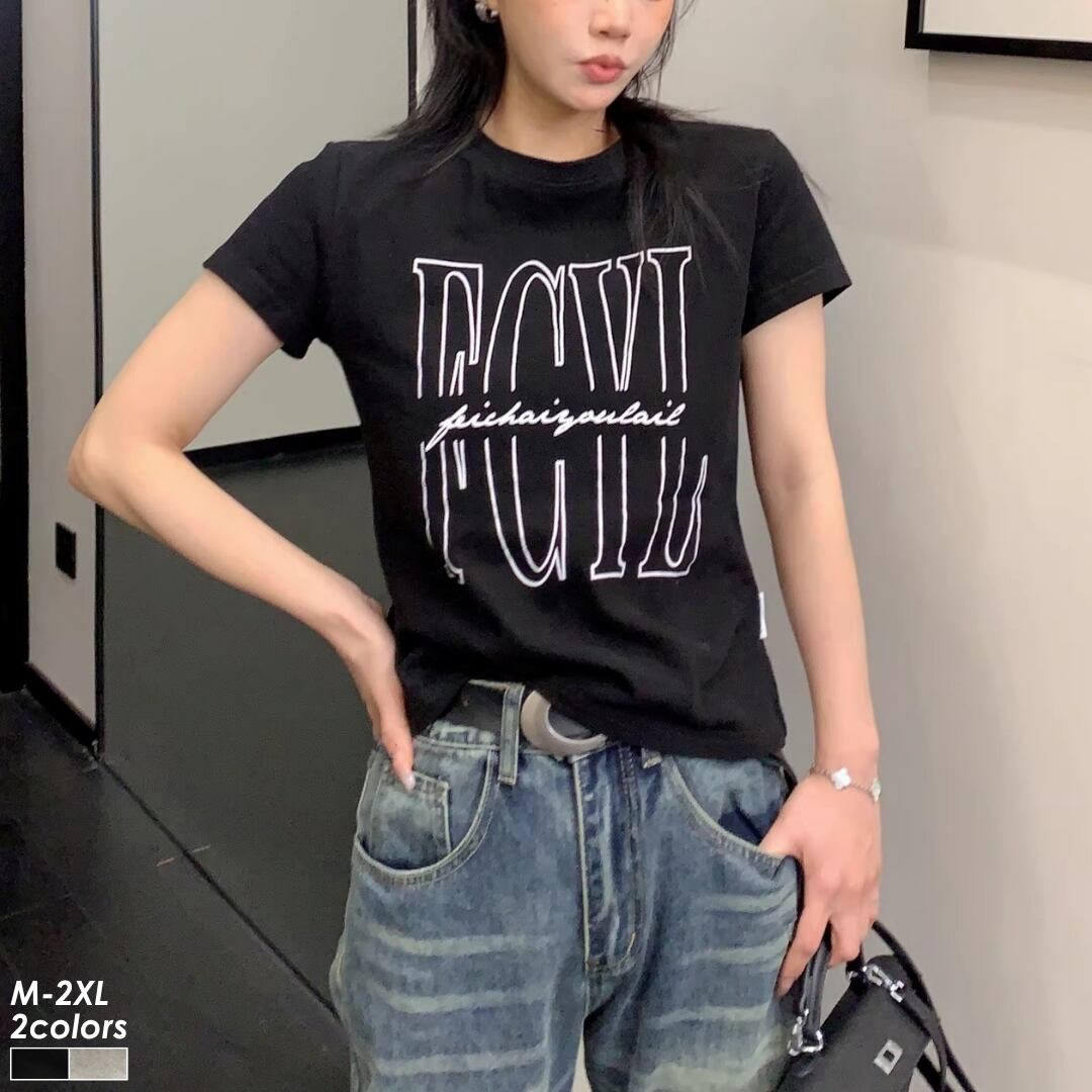 ロゴ プリント Tシャツ 半袖 ラウンドネック クルーネック ショート丈 コンパクトT カットソー プルオーバー カジュアル ストリート OISIS レディース トップス 黒 B-1479 【お取寄せ】