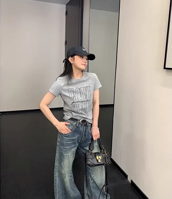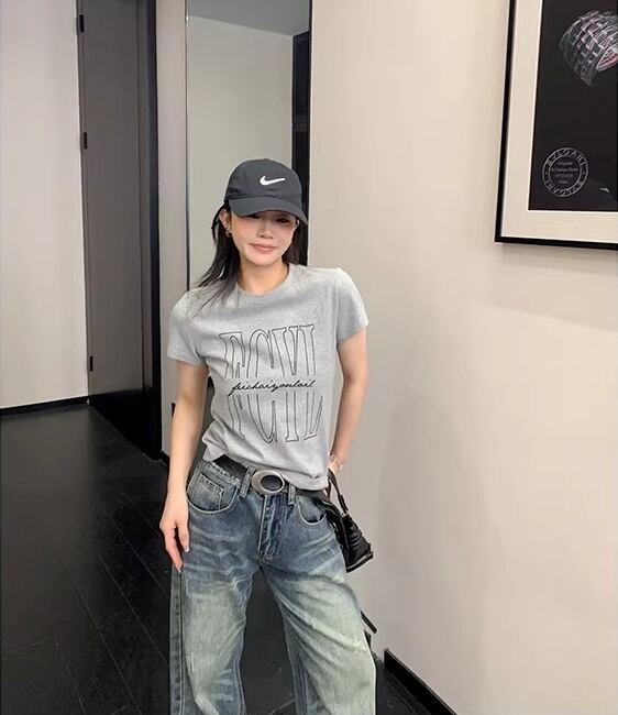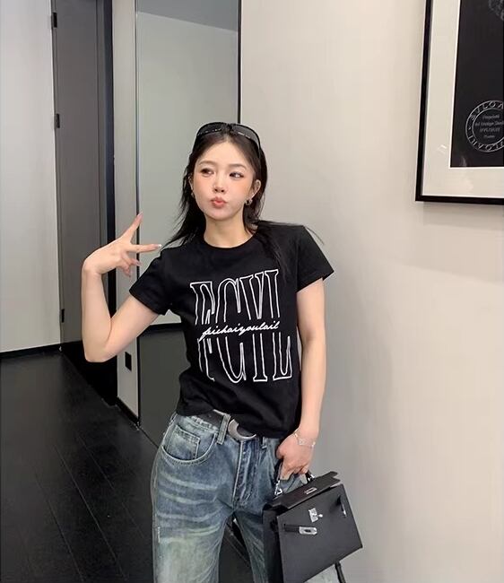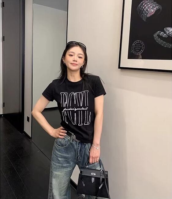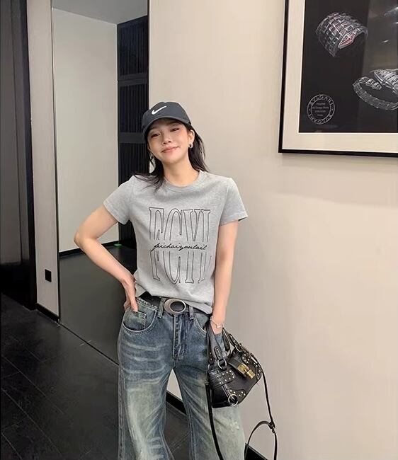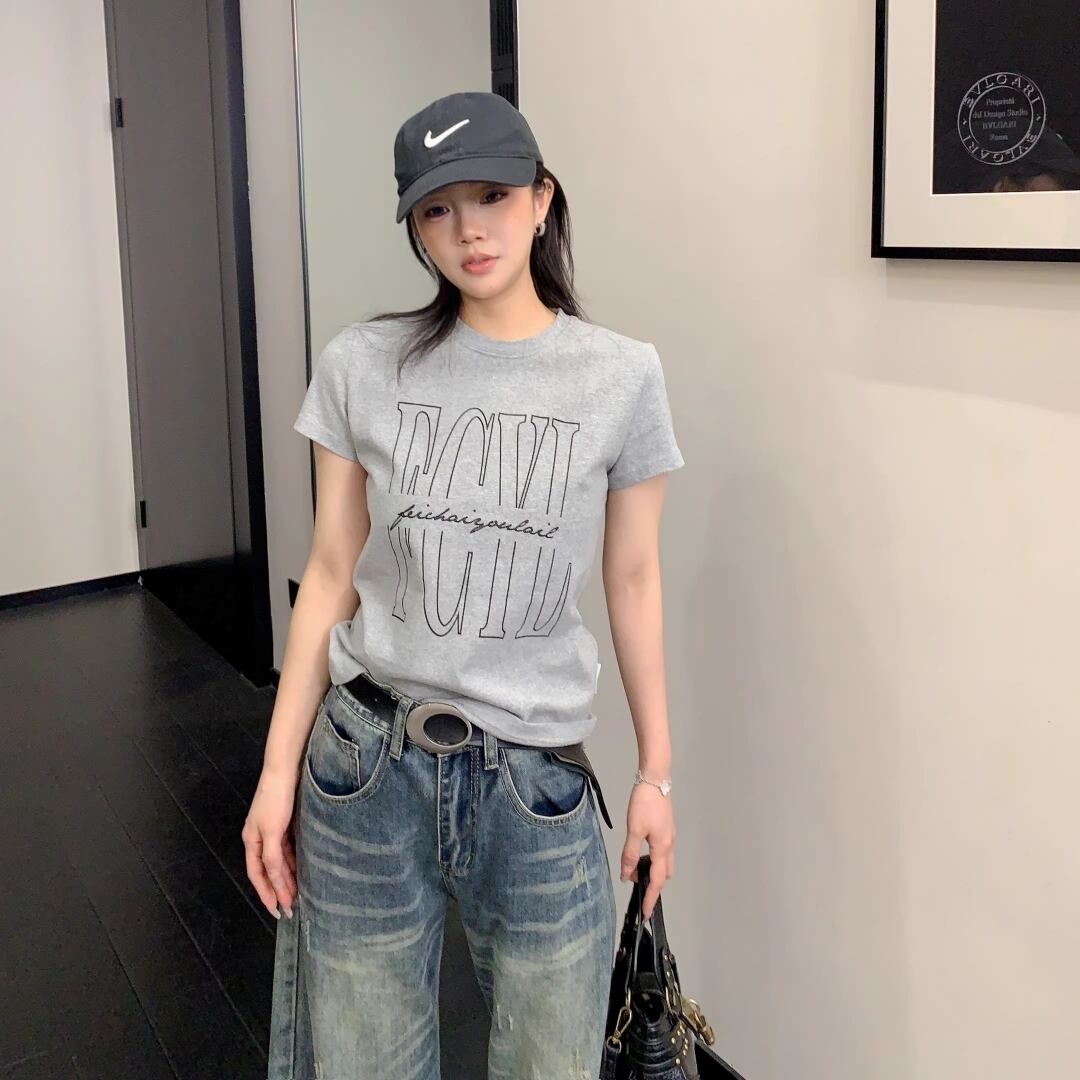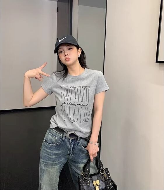 すっきりとしたシルエットで女性らしいラインを引き立てるロゴTシャツ。