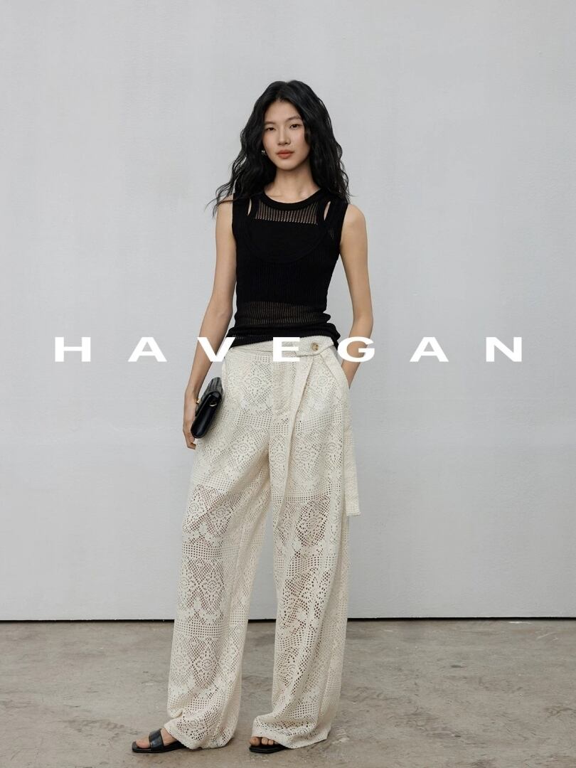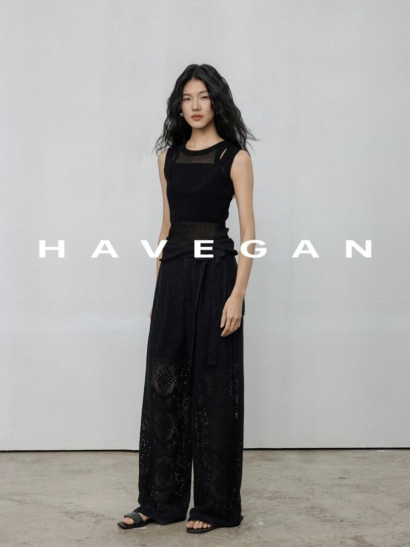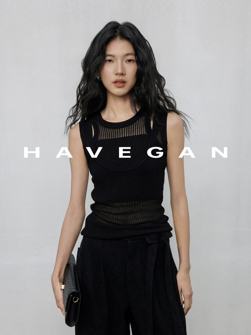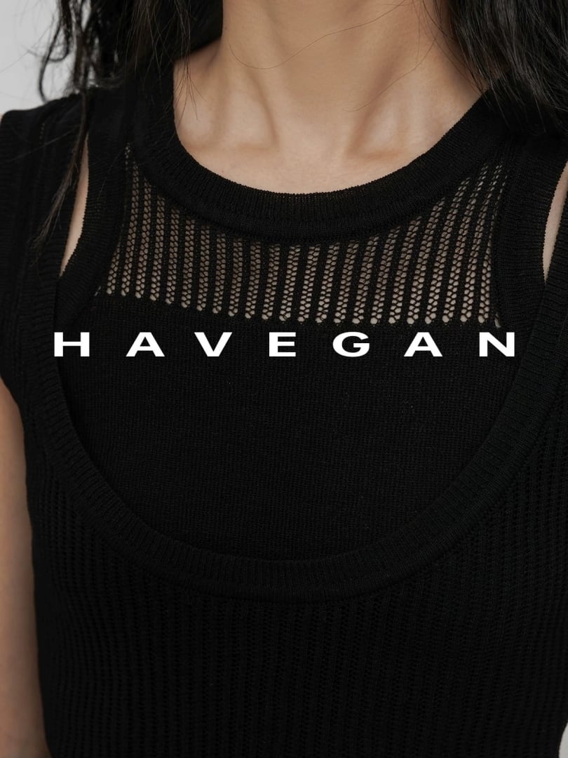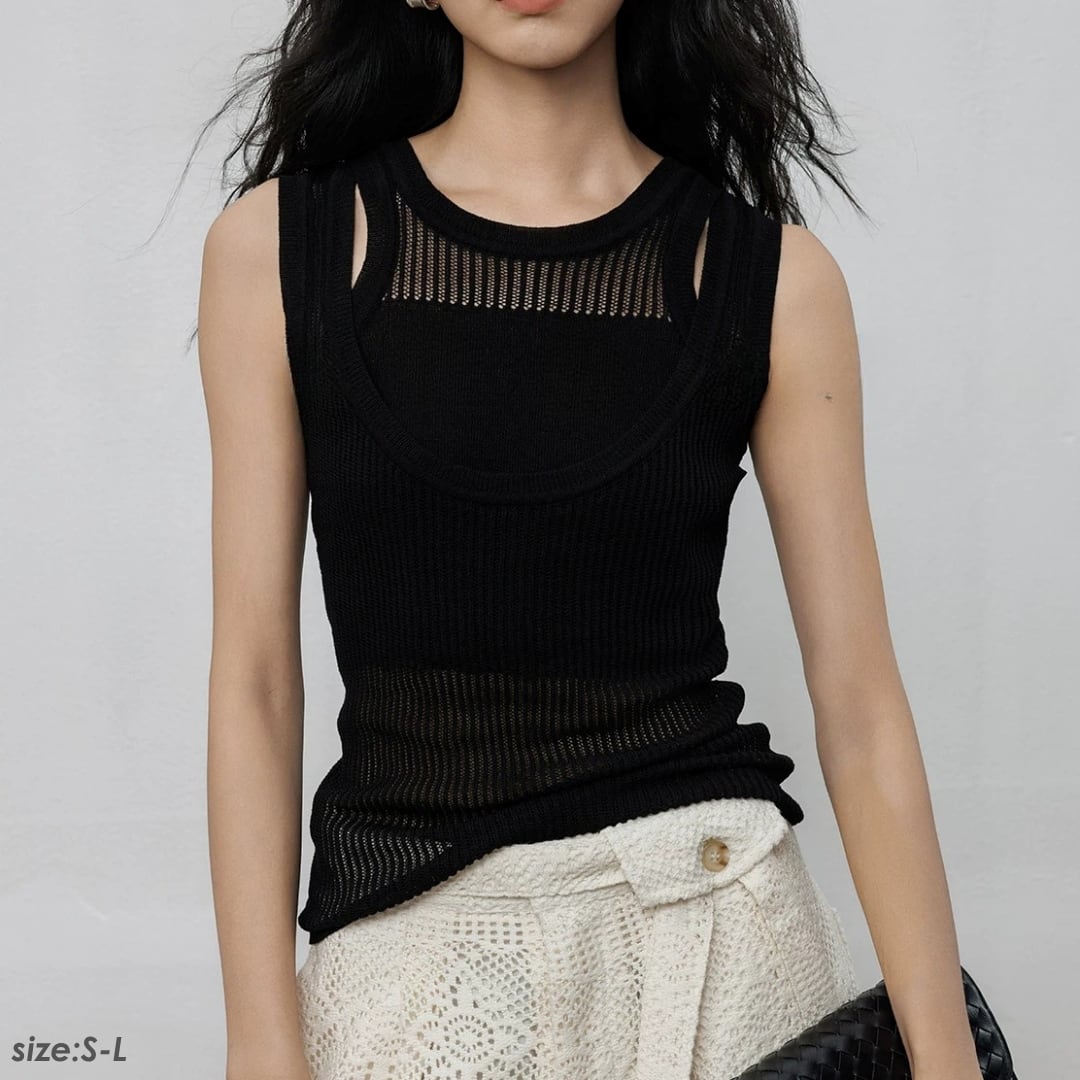 透け感のあるメッシュ編みとレイヤード風デザインが印象的なノースリーブトップス。