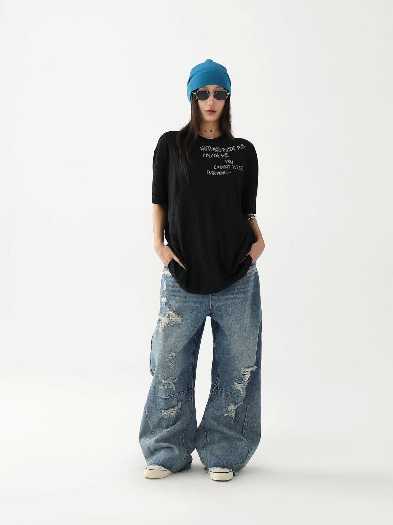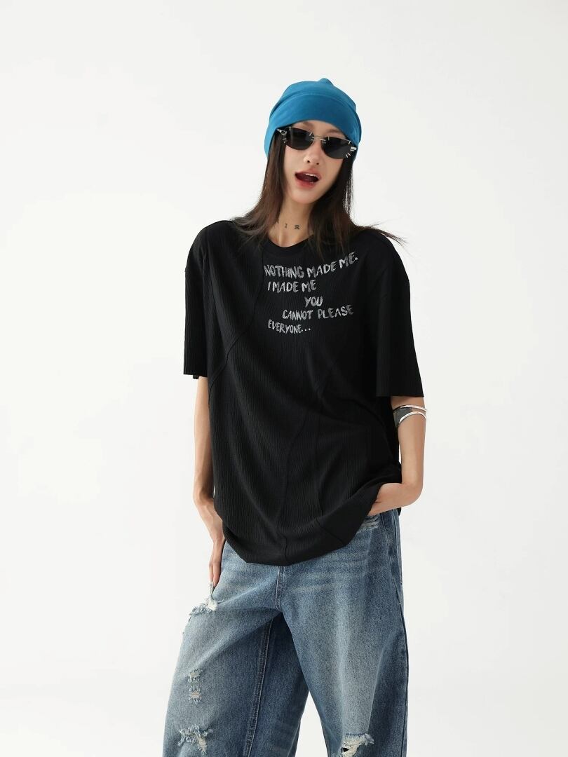 ロゴ Tシャツ 切替デザイン 楊柳風 シワ加工 手書き風 プリント シアー 透け感 半袖 ラウンドネック クルーネック カットソー ゆったり オーバーサイズ カジュアル メンズライク ストリート NEZAVISIY レディース トップス 白 黒 B-1486 【お取寄せ】
