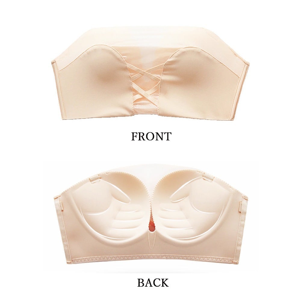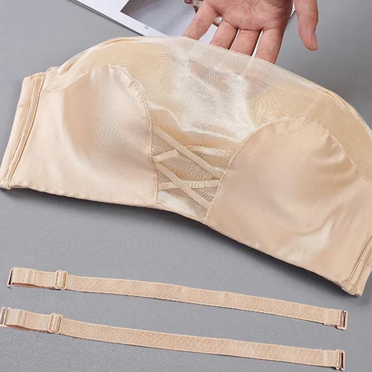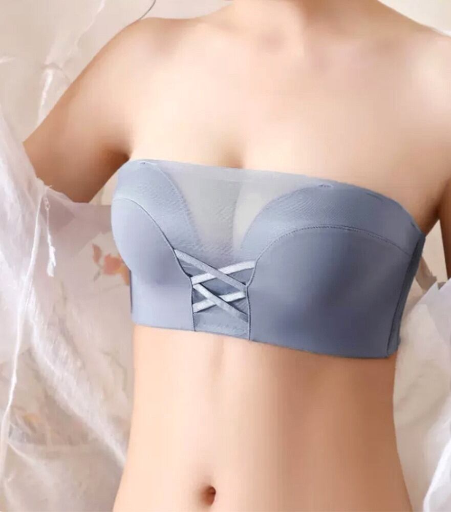 チュールの透け感が上品なアクセントになったストラップレスブラ。